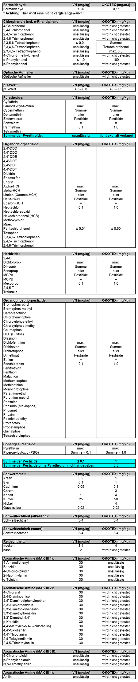 Gegenüberstellung der Grenzwerte von IVN / Oeko-Tex®