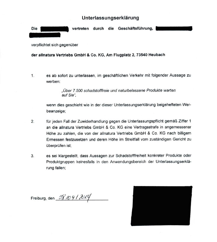 Wir haben für Sie nach schwarzen Schafen gesucht und sind leider auch fündig geworden. Beispielsweise hat einer unserer Mitbewerber - nicht der kleinste - tatsächlich dreist in einer Werbeanzeige diese Behauptung aufgestellt: "Über 7.500 schadstofffreie [...] Produkte warten auf Sie"! Das können wir in Ihrem und in unserem Interesse nicht akzeptieren.Wir haben deshalb eine Unterlassungserklärung erwirkt, die Sie hier im PDF-Format einsehen können.