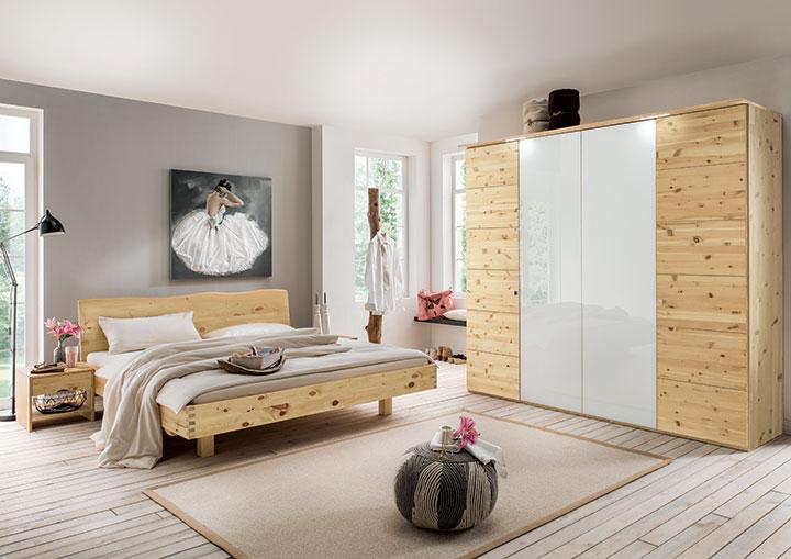 Mit den eleganten Schlafzimmer-Kombinationen aus lebhaft gezeichnetem Zirbenholz präsentieren wir das traditionelle Material modern. Lassen Sie sich begeistern von der markanten Struktur und dem angenehmen, aromatischen Duft. Atmen Sie tief durch und genießen Sie!