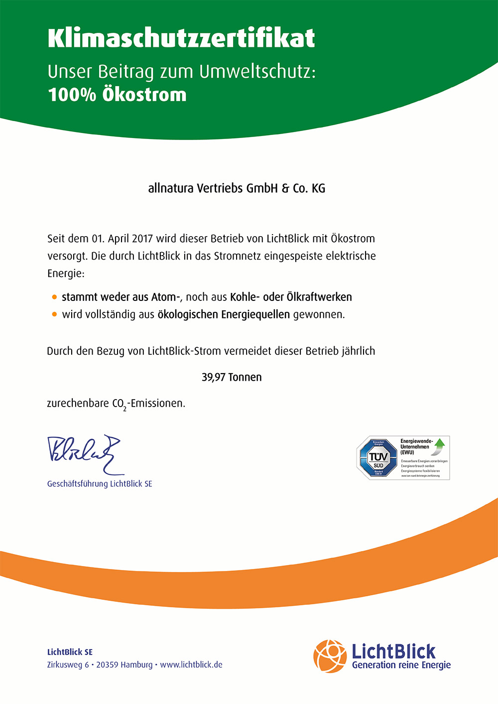 Der Ökostrom von LichtBlick ist zu 100 % klimafreundlich, denn der Stromanbieter setzt komplett auf erneuerbare Energien. Die Stromgewinnung erzeugt somit keinen CO2 – Ausstoß. Bei einem jährlichen Verbrauch von rund 85.000 kWh sparen wir demnach 39,97 Tonnen Kohlendioxid ein und das jedes Jahr!