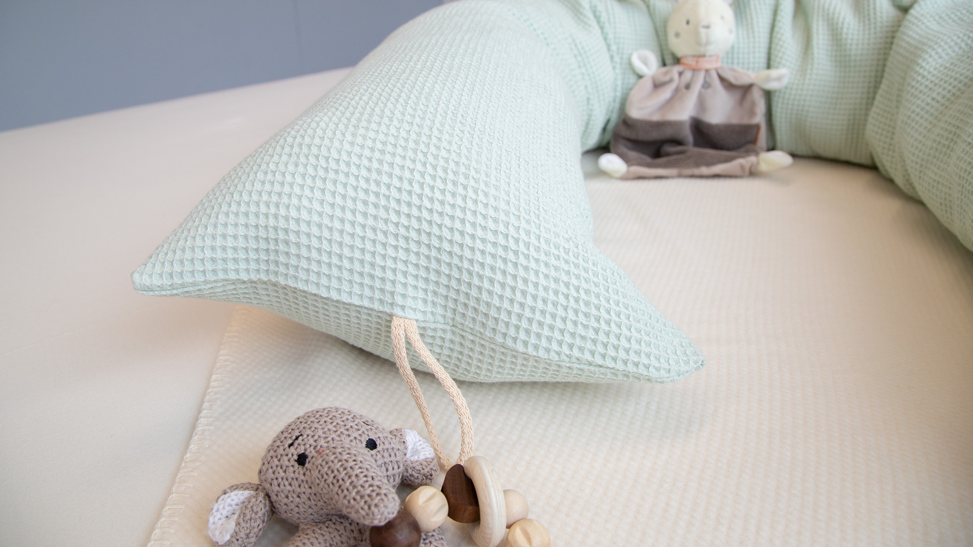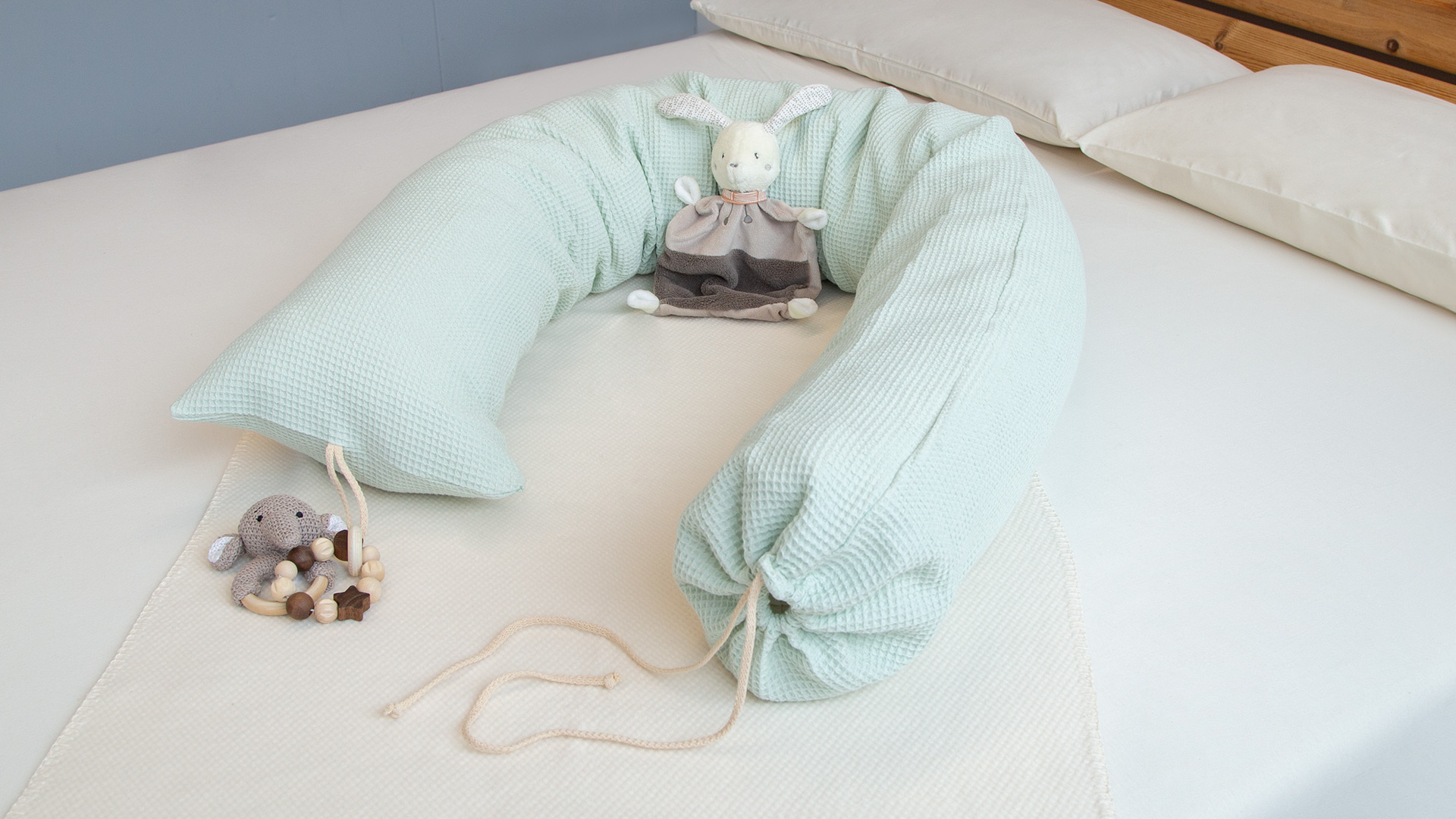 Dank praktischer Kordel und passender Schlaufe kann das Stillkissen "Mana" schnell zu einem kuschelweichen Nestchen verwandelt werden. Hierzu einfach die Kordel mit der Schlaufe verbinden. Ihr Liebling wird es lieben! Den Außenbezug erhalten Sie in 5 fröhlichen Farben - wählen Sie Ihren Favoriten!