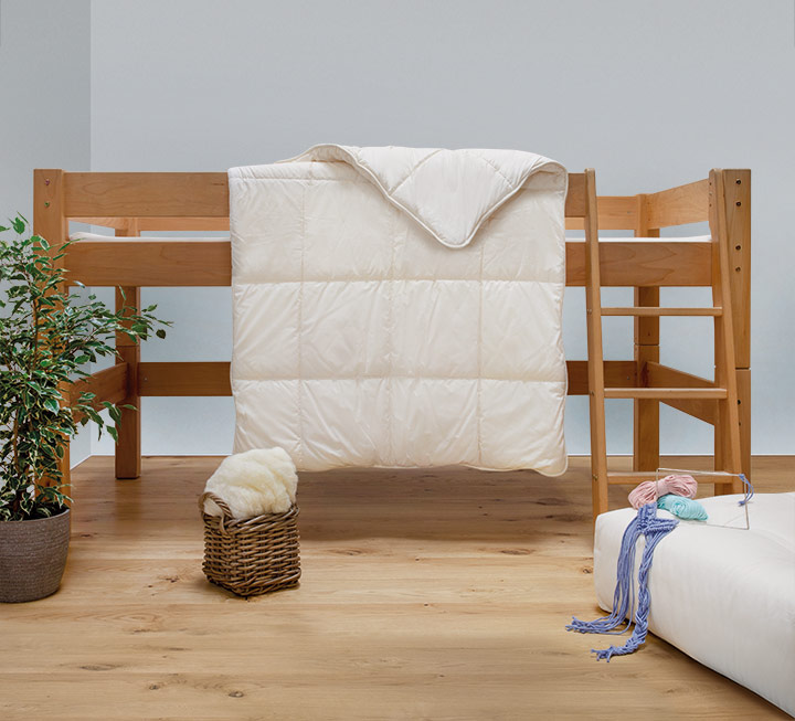 Bevorzugen Sie für Babys, Kleinkinder und Kindergartenkinder Naturfasern wie Kamelflaumhaar oder Schafschurwolle. Pflanzliche Fasern wie Lyocell / Tencel, Bio-Baumwolle aus kontrolliert biologischem Anbau oder Hanf sind eine gute, waschbare Alternative für Kinder in jedem Alter. Wenn Ihr Kleinkind zum Frieren neigt, ist auch unsere Daunen - Kinderbettdecke eine gute Wahl. Synthetik sollte für das Babybett absolut tabu sein.