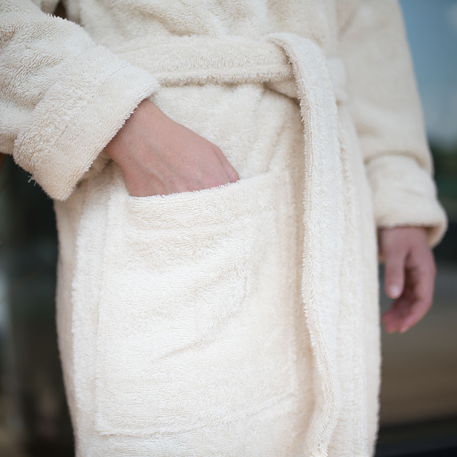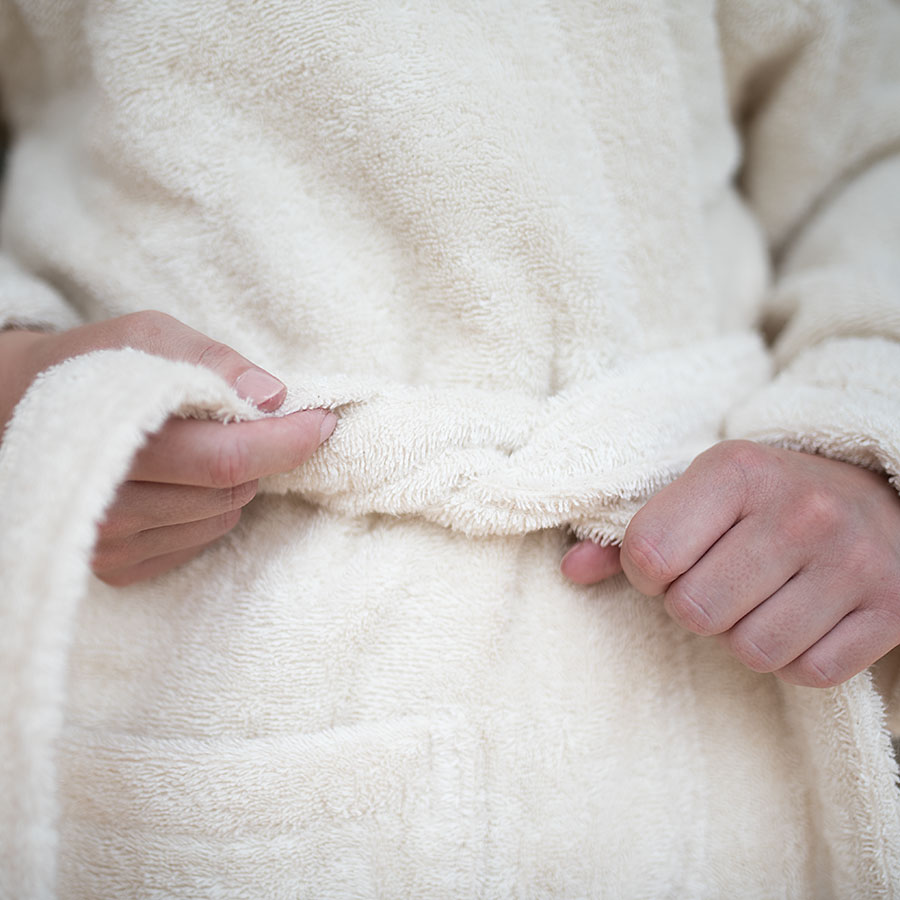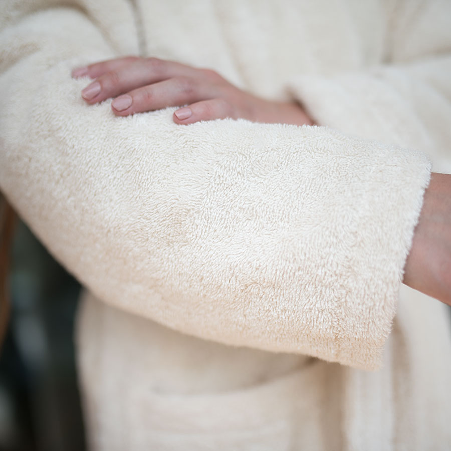 Bademantel „Felpa“ ist selbstverständlich auch eine Wohltat nach einem entspannten Bad zu Hause. Den Mantel erhalten Sie wahlweise in einer der gängigen Größen S/M oder L/XL. Dieser flauschige Frottee-Bademantel aus 100 % Baumwolle (kbA) mit klassischem Kimono-Kragen und breitem Bindegürtel sorgt überall für behagliche Stunden.