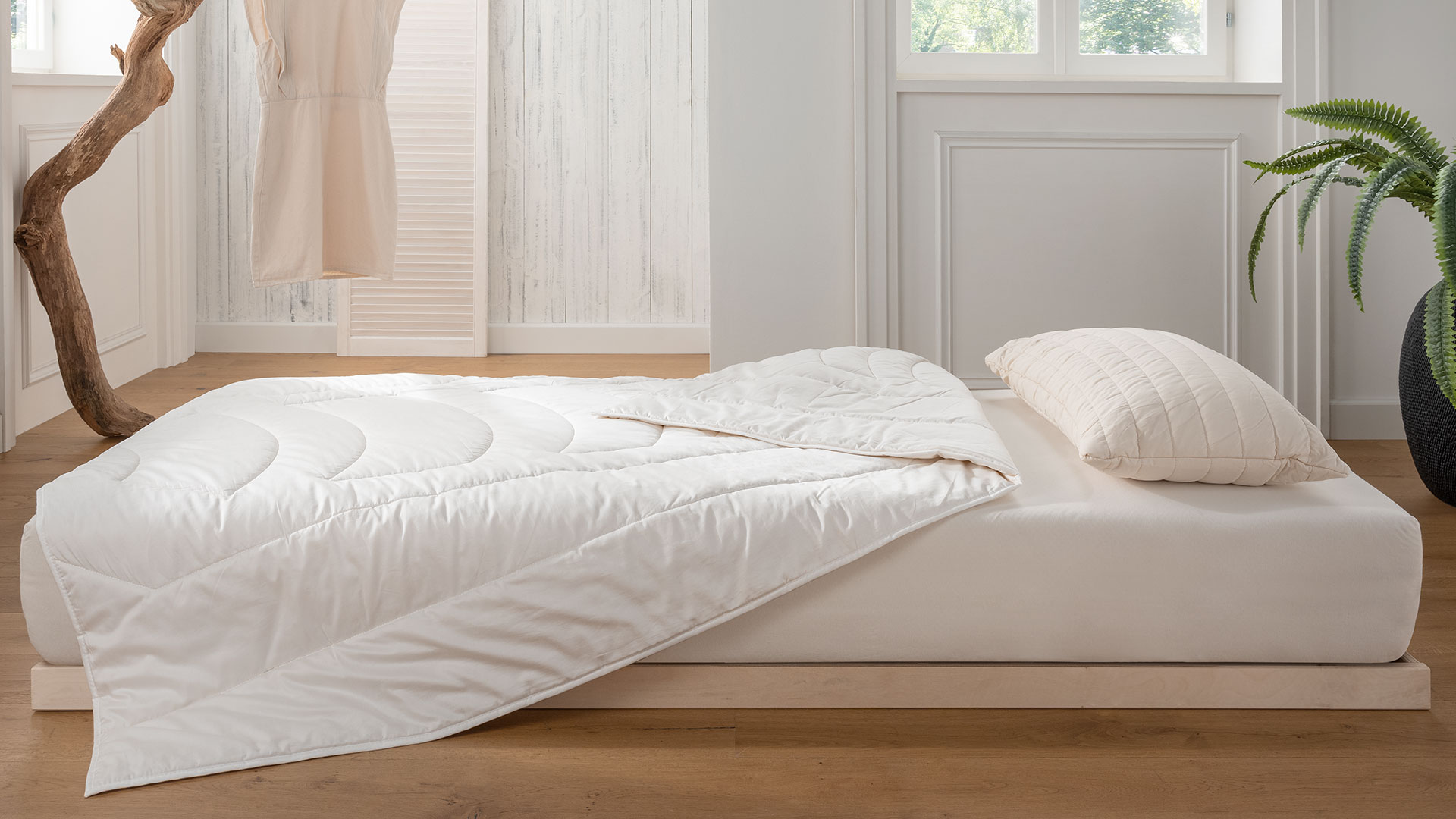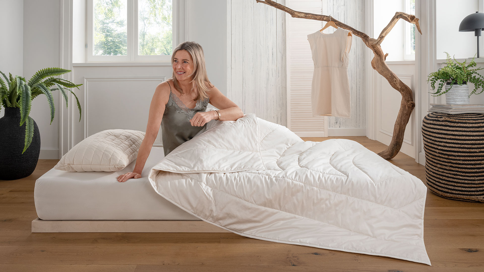 Atmungsaktiver Edel-Satin aus 100 % kbA-Baumwolle mit leicht seidigem Glanz und herrlich fließendem Fall - perfekt auf die edlen Füllmaterialien abgestimmt.