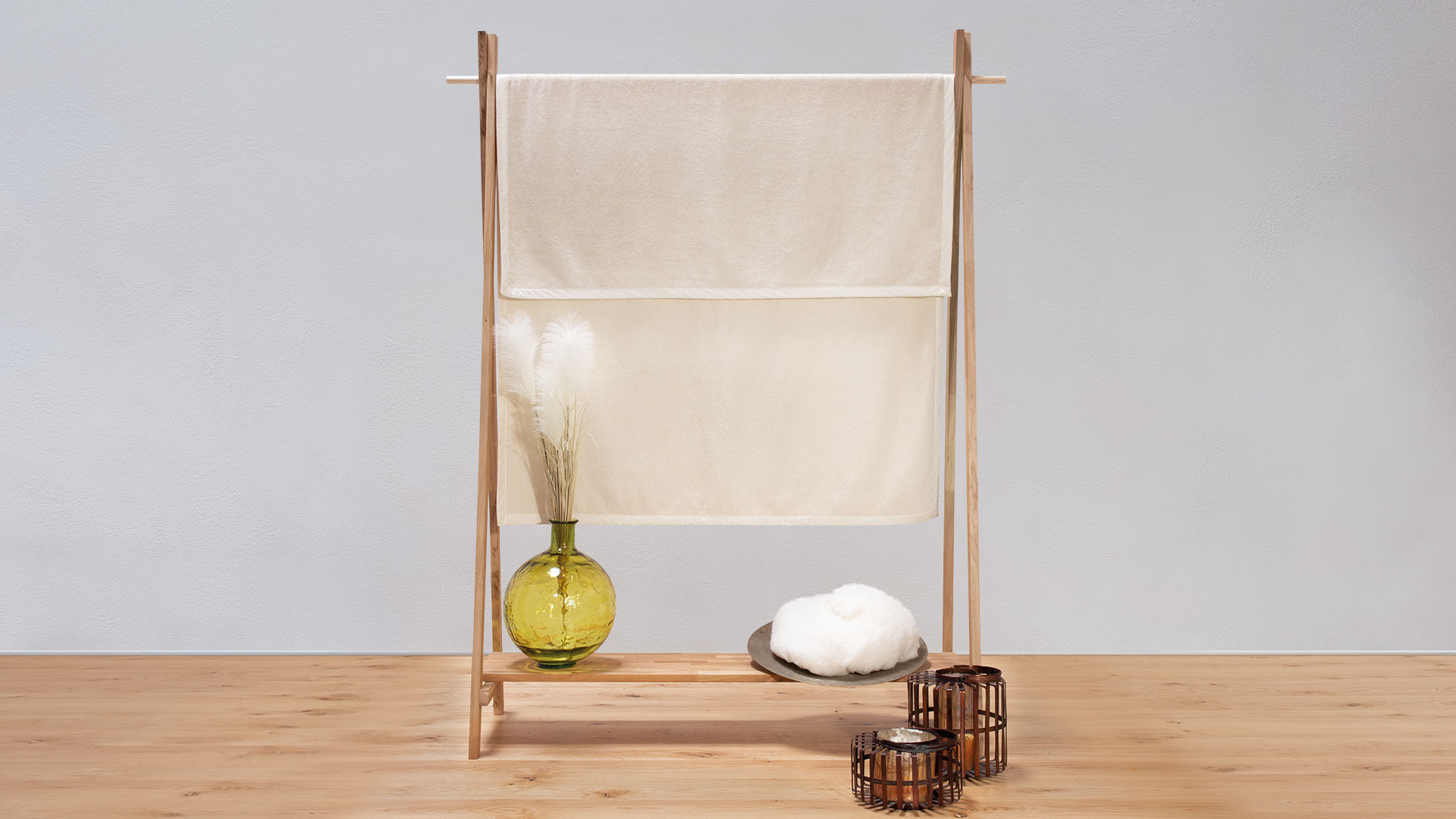 Temperaturausgleichende, flauschige Schlingenware, auf Bio-Baumwoll-Grundgewebe, die besonders viel Feuchtigkeit aufnehmen kann, ohne sich klamm anzufühlen.