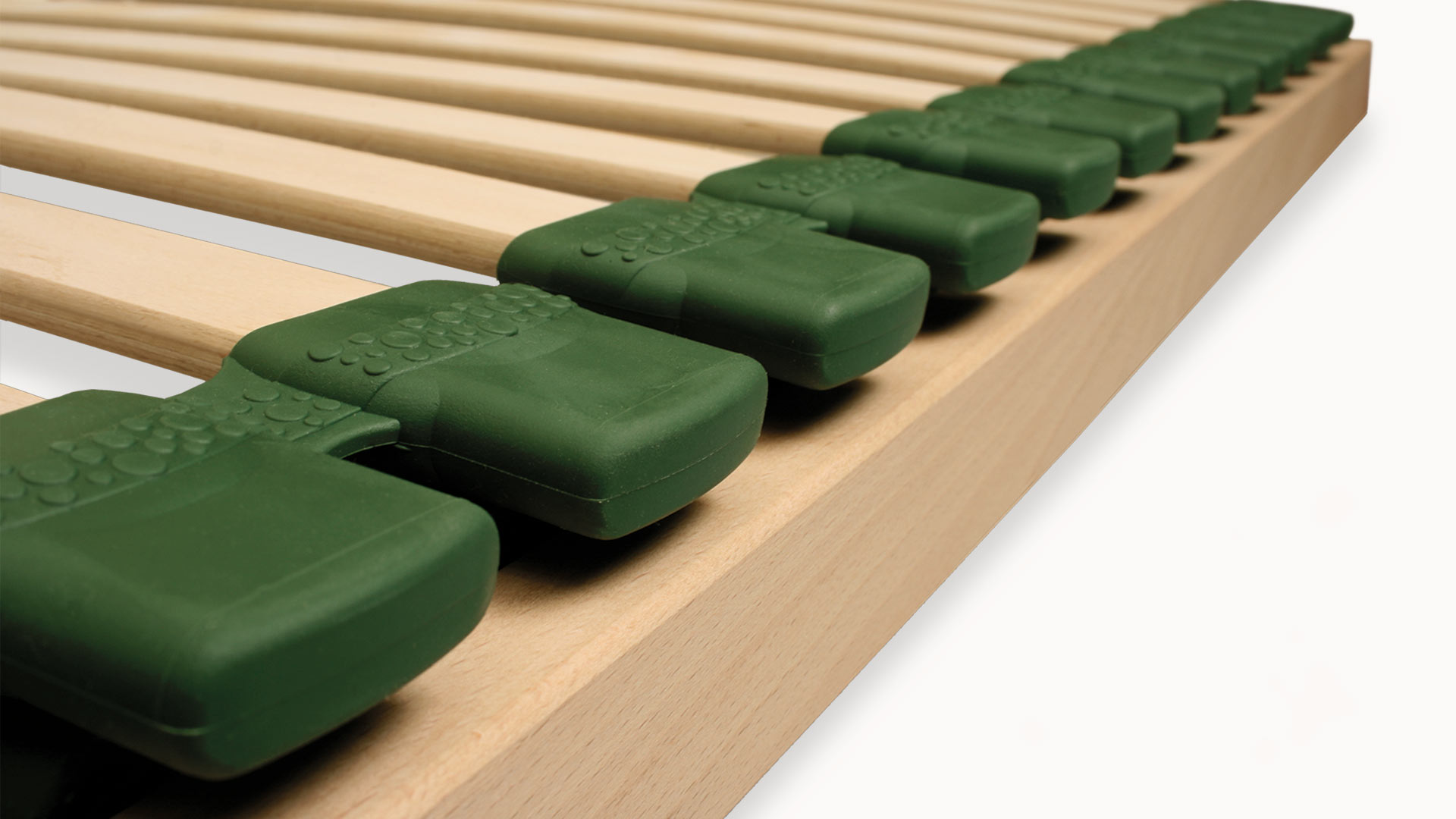 Die Federleisten werden in beweglichen Doppel-Gelenkpolstern aus PVC-freiem Kautschuk gelagert und passen sich somit der natürlichen Krümmung der Wirbelsäule exakt an.