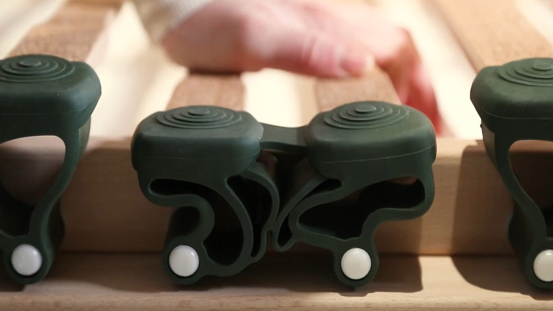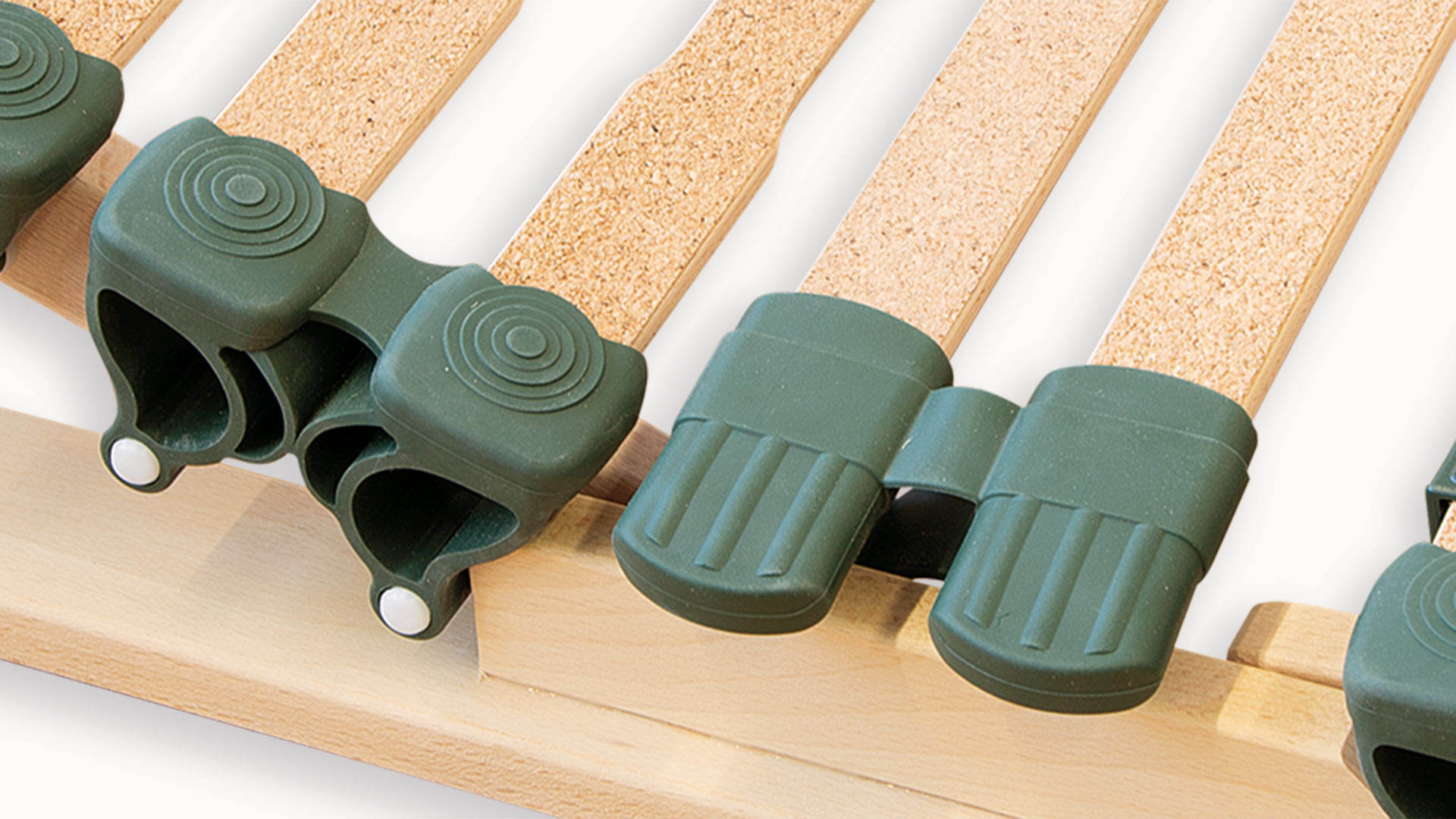 Die Federleisten werden in beweglichen Doppel-Gelenkpolstern aus PVC-freiem Kautschuk gelagert und passen sich somit der natürlichen Krümmung der Wirbelsäule exakt an.