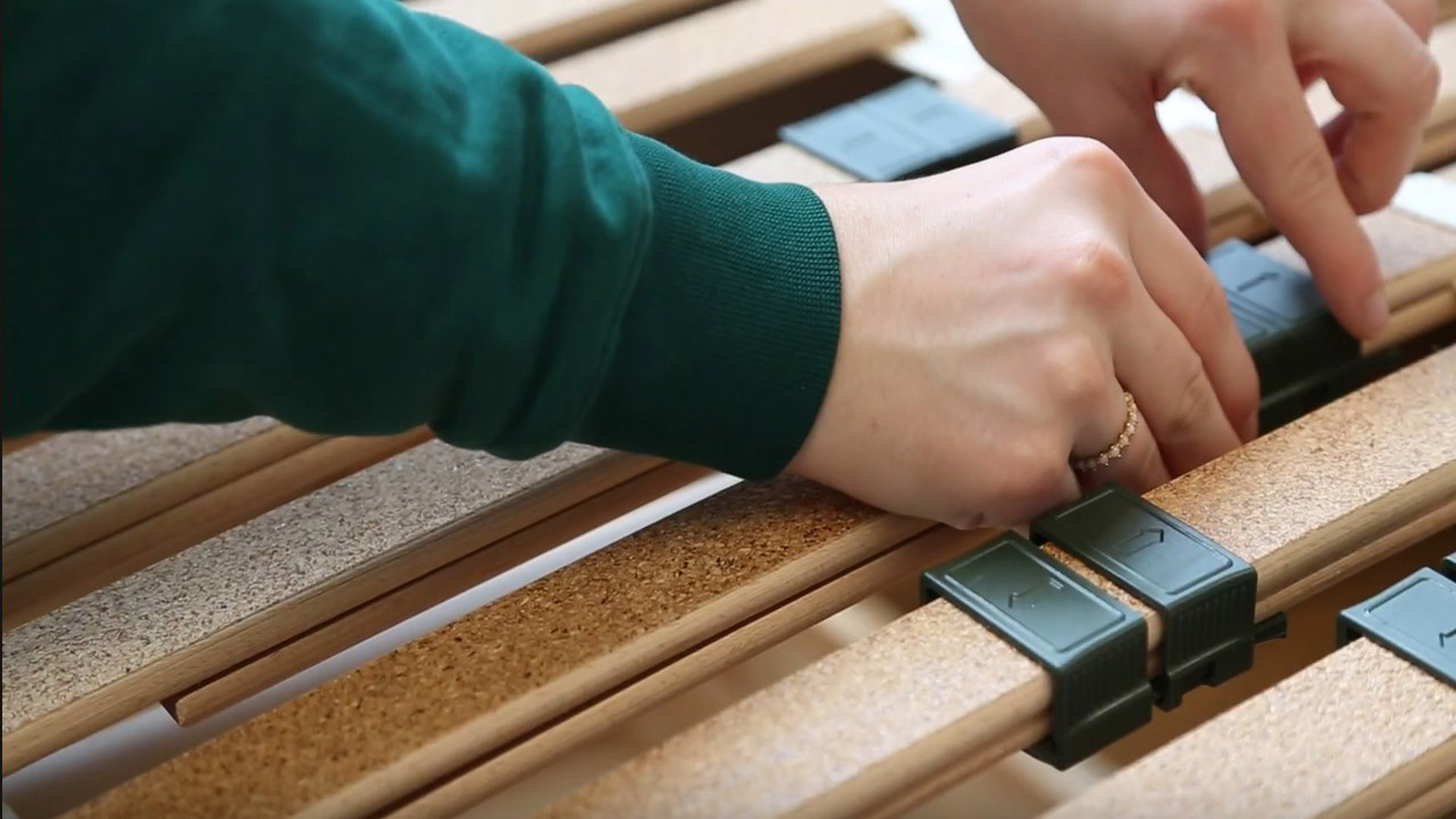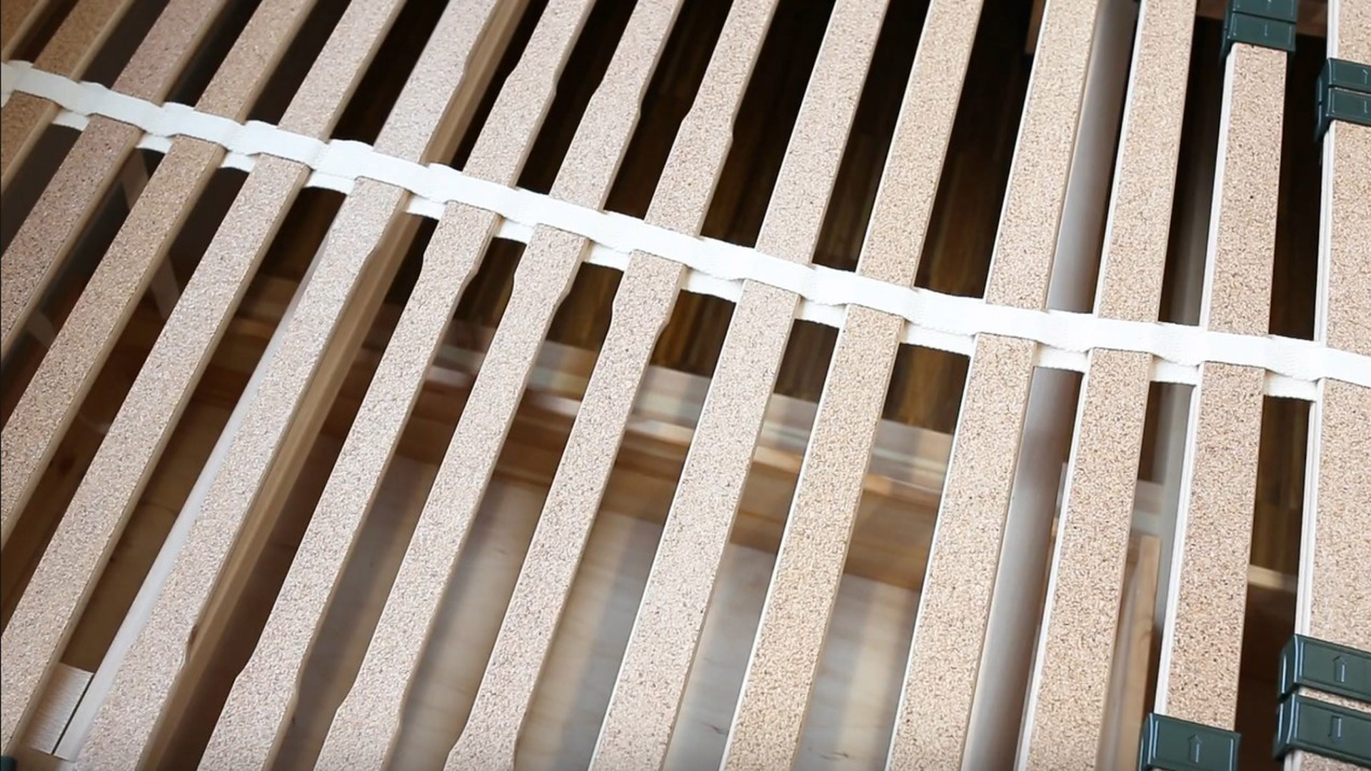 Aufwändig mit Kork beschichtete Federleisten. Kork ist von Natur aus feuchtigkeits-ausgleichend, federt nach und ist weich