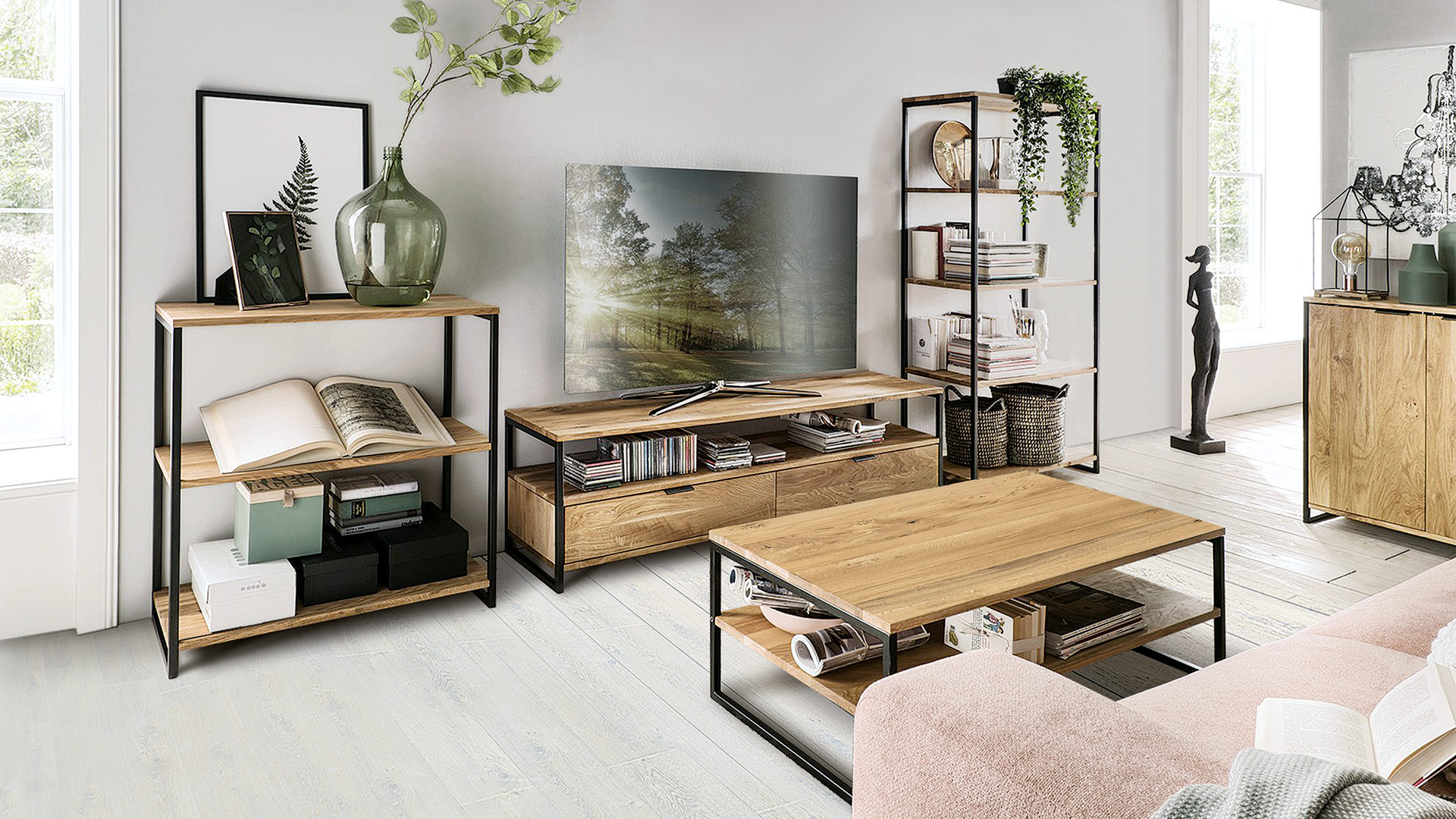 Lebhaft gemasertes Wildeichenholz trifft auf markanten Schwarzstahl. Couchtisch "Anca" lebt von diesem faszinierenden Kontrast. Das geradlinige Design mit umlaufenden Schwarzstahl-Seitenteilen wirkt luftig und leicht. Die perfekt eingepasste, von außen sichtbar verschraubte Ablage scheint fast zwischen den Rahmenelementen zu schweben.