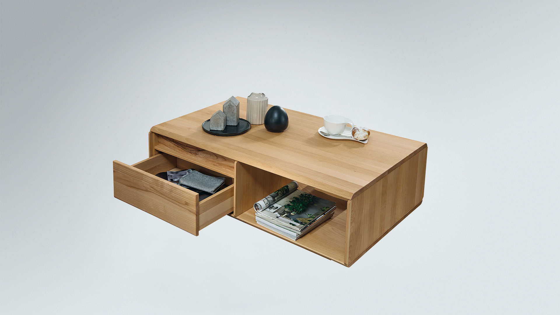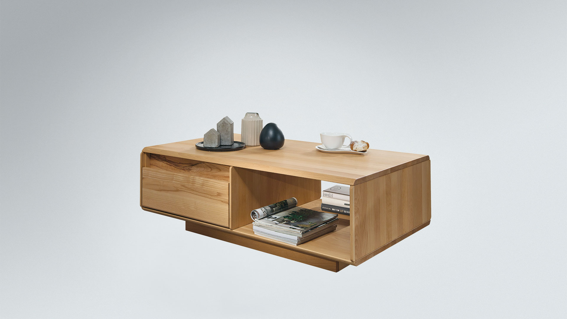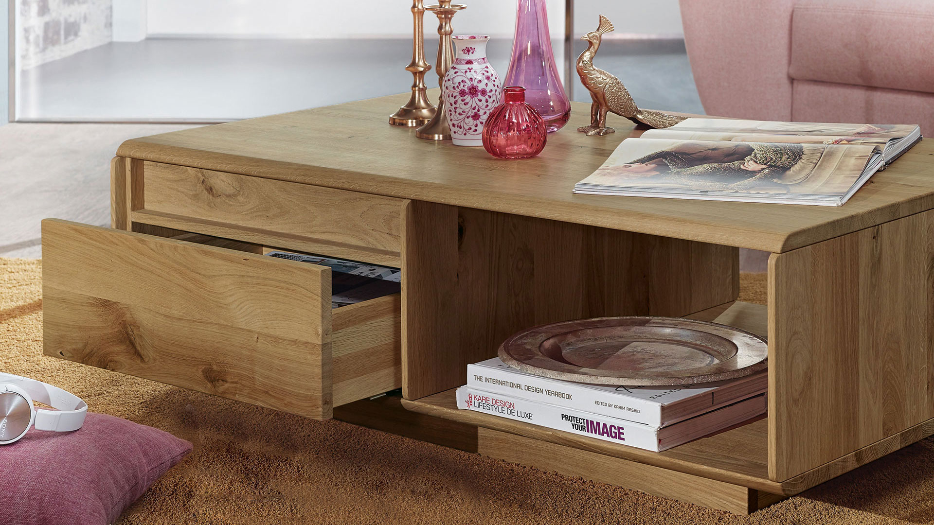 Kompakter Couchtisch aus edlem Wildeichenholz - formschön und praktisch