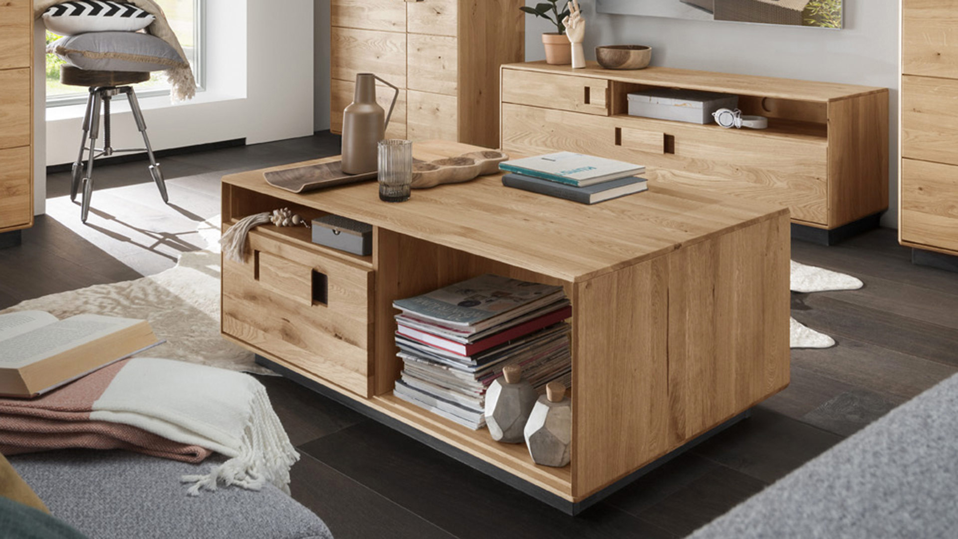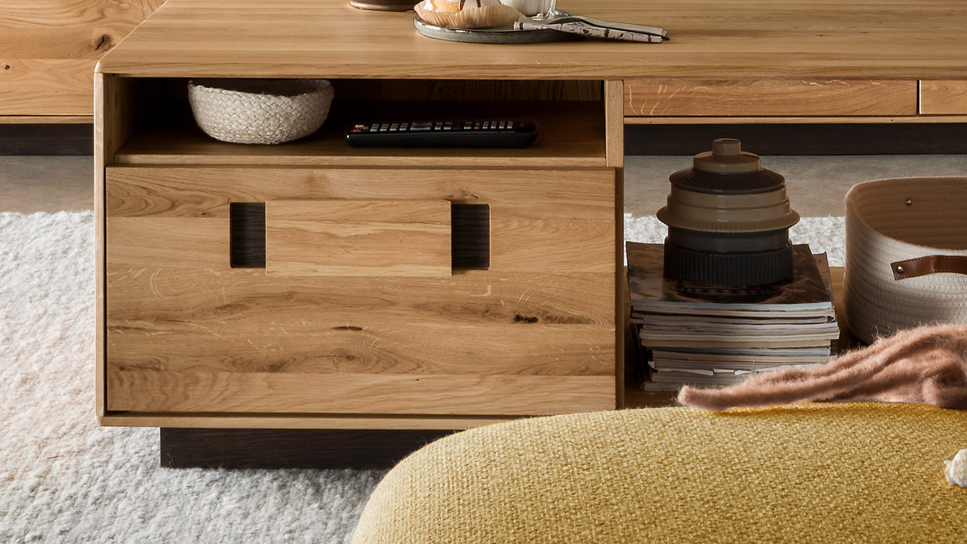 "Ovaro" ist ein geräumiger Couchtisch in edel-rustikaler Optik. Der Korpus wird aus ruhig gemasertem Eichenholz gefertigt. Die Schubladenfront dagegen ist aus lebhafter Wildeiche, bei der Ästigkeiten und kleinere Unebenheiten bewusst belassen wurden. Ein echter Hingucker ist auch die fantasievolle Grifflösung: Der kantige, aufgesetzte Holzgriff wird durch den dunkel gebeizten Hintergrund attraktiv in Szene gesetzt. Der zurückgesetzte, ebenfalls dunkel gebeizte Sockel verleiht dem Tisch Leichtigkeit und macht ganz nebenbei das Staubsaugen besonders leicht.