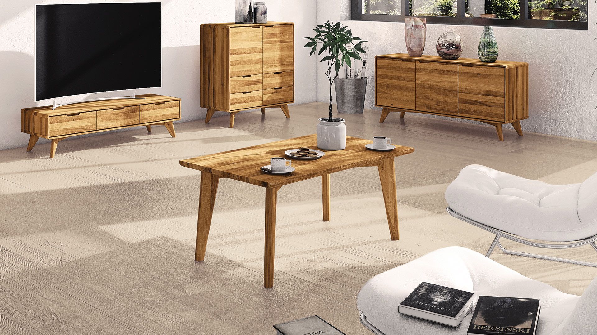 ... sorgt mit seinen schräg zulaufenden Beinen, den leicht abgerundeten Tischkanten und der Unterkonstruktion mit diagonal angebrachten Verstrebungen für eine schlichte und elegante Optik in Ihrem Wohnzimmer. Er bietet viel Platz für Zeitschriften, Deko-Artikel oder Getränke und ist somit vielseitg einsetzbar. Erhältlich ist der schadstoffgeprüfte, in skandinavischem Design gestaltete Couchtisch "Tario" in Buche, Kernbuche oder Wildeiche.
