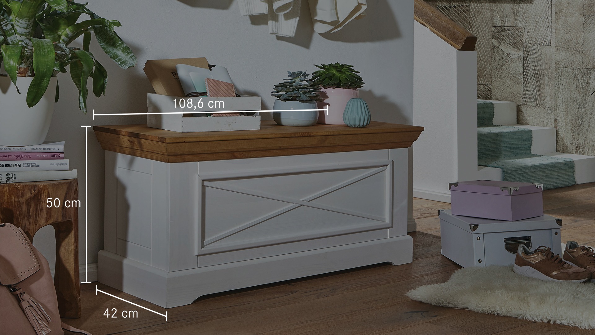 Traditionell ist so eine Truhe ja für die Bettwäsche zuständig, aber natürlich sind auch Ihre Bastelsachen, das Geschenkpapier oder Ihre Fotoalben darin gut aufgehoben. Ihnen fallen sicherlich noch viele weitere Dinge ein, die in "Molina" ihren angestammten Platz finden werden. Deckeltruhe "Molina" ist liebevoll und detailreich im Landhausstil gefertigt. Das massive Kiefernholz ist sorgfältig weiß-gewachst. Der flache Deckel ruht auf einem aufwändig profilierten Truhenkranz. Beide Elemente sind eichefarbig lasiert und bilden einen schönen Kontrast zum hellen Grundton des Möbels. Die geräumige Truhe ist mit einer hochwertigen Scharnier-Dämpfung ausgestattet, mit der der Deckel sanft schließt.