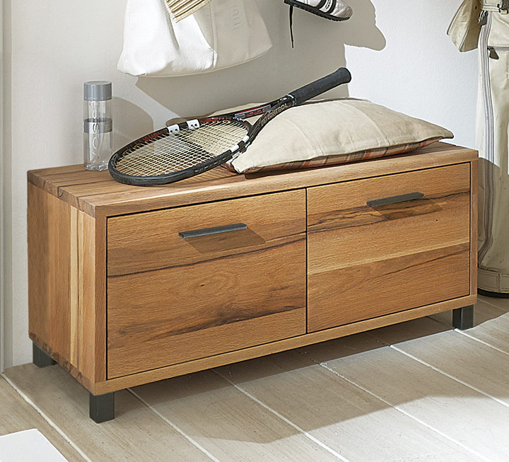 Schuhe im Stehen an- und ausziehen ist jedes Mal ein gefährlicher Balance-Akt. Zudem werden teure Schuhe oft nicht pfleglich behandelt, sondern einfach unachtsam abgestreift. Gönnen Sie sich und Ihren Lieblingsschuhen ein entspanntes An- und Ausziehen in Ihrem Flur. Mit einer Garderobenbank Massivholz wird nicht nur Schuhe binden und Ausziehen zur Freude - Ihre liebgewonnenen Schuhe werden auch gleich hinter Türklappen, in Schubladen oder in offenen Fächern sorgsam verstaut. Garderobenbänke aus Kernbuche oder Wildeiche massiv sind eine Bereicherung für jeden Flur.