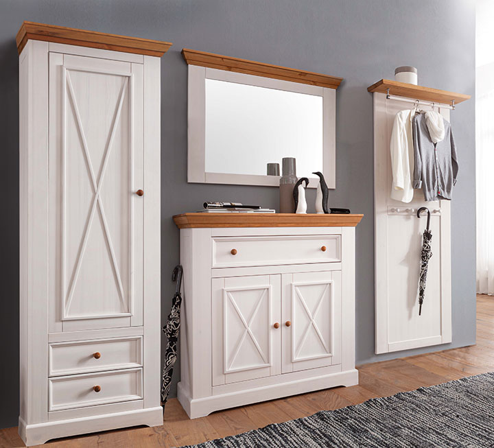 Bei uns finden Sie Dielenmöbel-Programme, die optisch perfekt aufeinander abgestimmt sind. Darüber hinaus haben wir einzelne Möbel, die sich beliebig zu einem Set zusammenstellen lassen. Weiße Möbel lassen sich perfekt zu anderen Massivhölzern kombinieren, zum Beispiel Kiefer, Buche oder Eiche. Entdecken Sie die Flurmöbel unserer anderen Kategorien und schaffen Sie eine harmonische Kombination aus weiß, braun und beige.