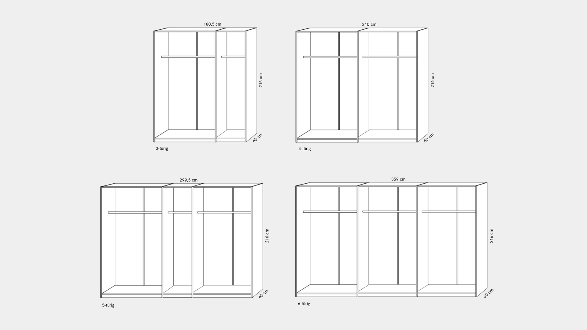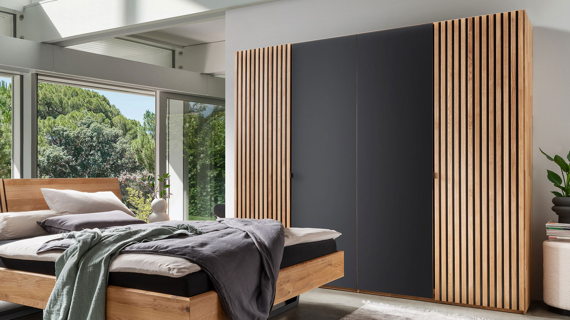 Das Ergebnis? Ein besonders stilvoller Kleiderschrank mit schlichten Winkelgriffen, die optisch in das Design einfließen. Nicht nur attraktiv, sondern auch reich an Stauraum, denn dieser Kleiderschrank aus Wildeiche ist wahlweise 3- bis 6-türig personalisierbar.