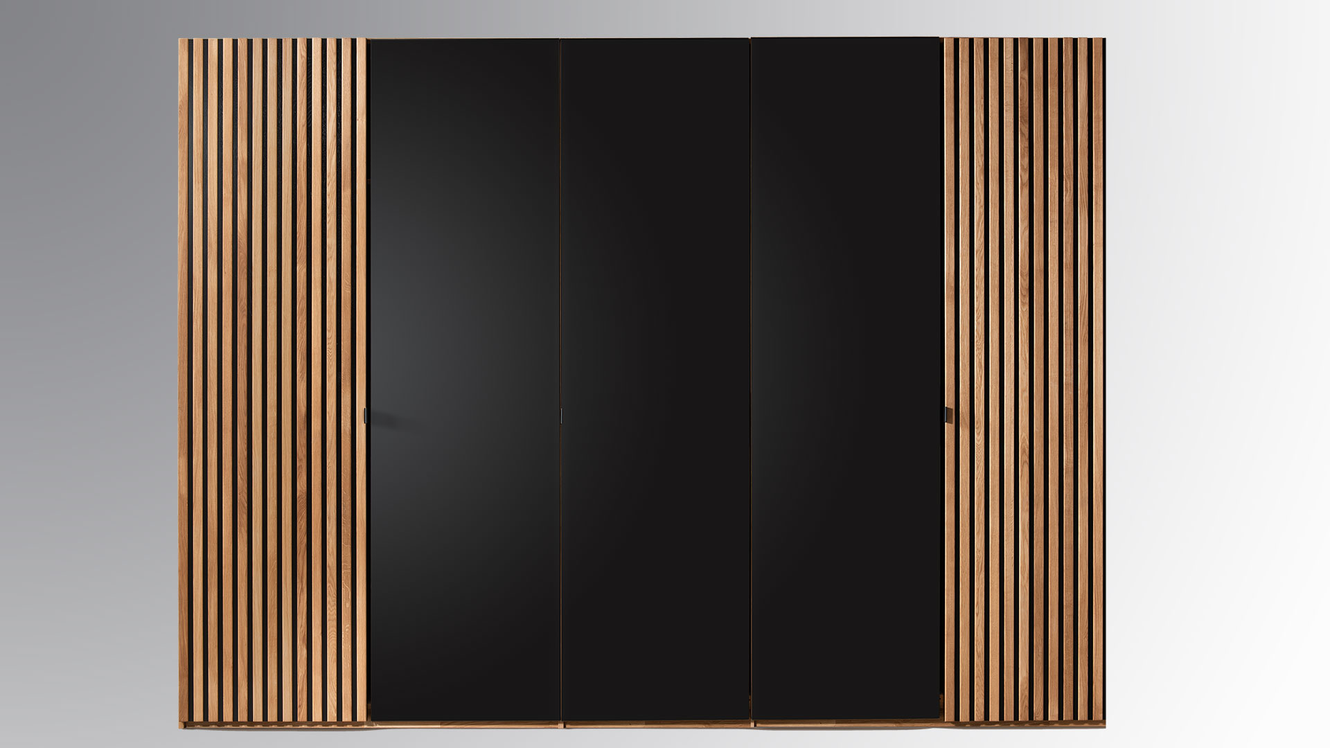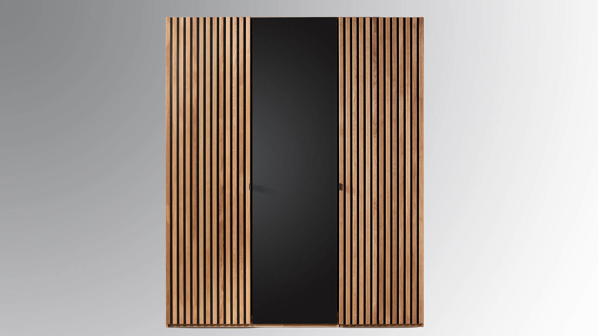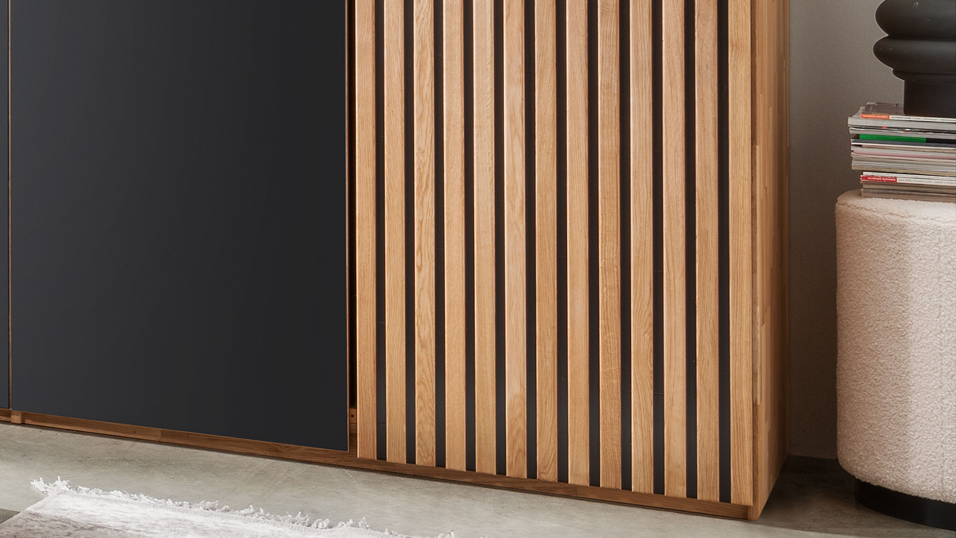 Bei Drehtürenschrank "Acustica" trifft die moderne Akustikpaneel-Optik mit ihren schlanken Lamellen auf dunklem Hintergrund auf elegante Anthrazitglas-Fronten.