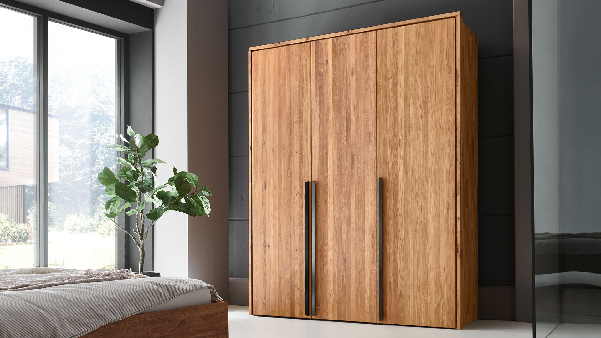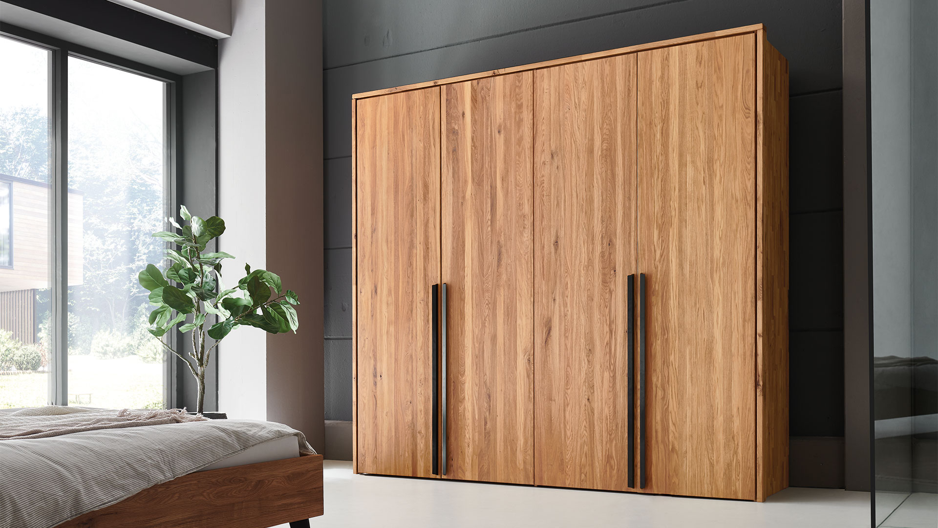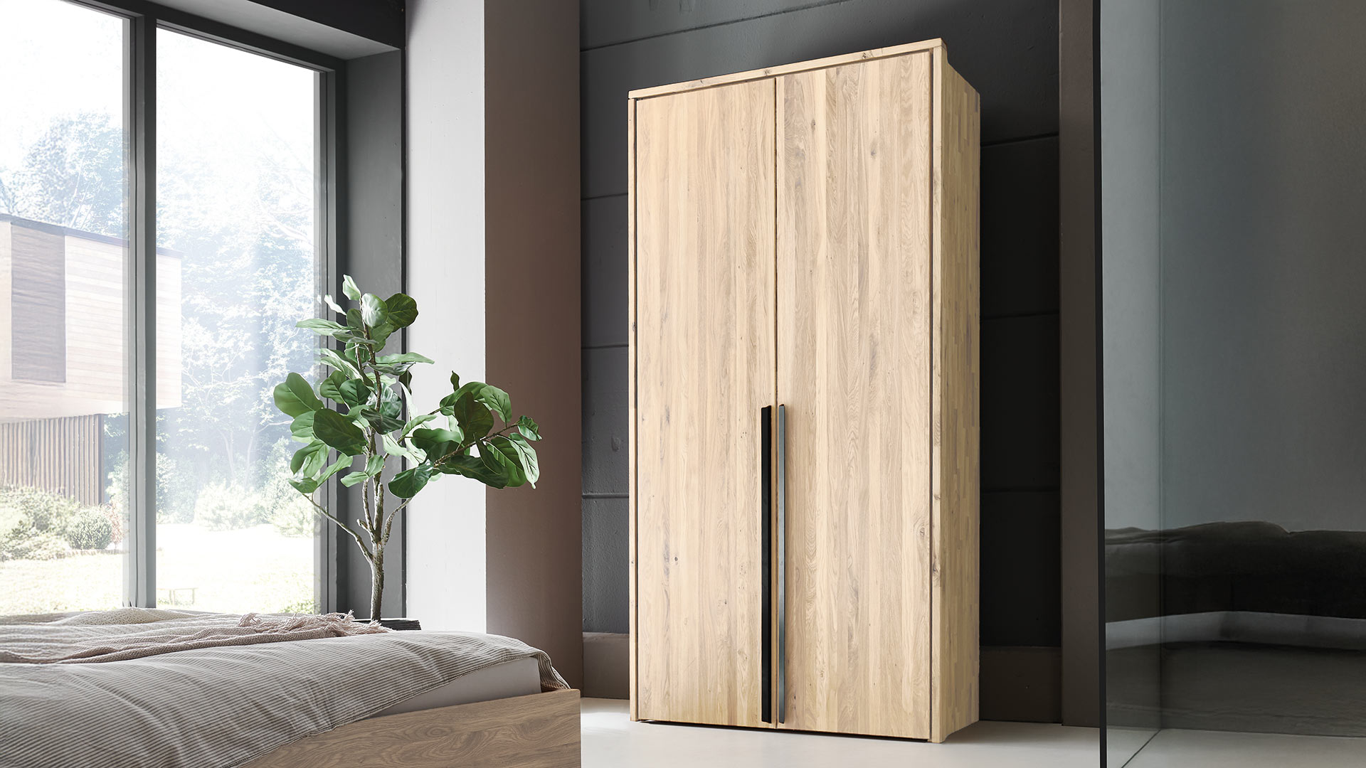 Das massive Wildeichenholz von Drehtüren-Kleiderschrank "Albero" versprüht charmante Natürlichkeit, welche durch die langen Winkelgriffe aus schwarzem Metall stilvoll akzentuiert wird. Wenn Sie einen helleren, moderneren Look bevorzugen, treffen Sie mit der Bianco-Oberfläche die perfekte Wahl - sie lässt den Schrank optisch leichter wirken und sorgt für eine frische, zeitlose Eleganz. Mit der geölten Oberfläche hingegen bleibt die natürliche Maserung des Holzes besonders lebendig und verleiht Ihrem Schlafzimmer eine warme, einladende Atmosphäre.