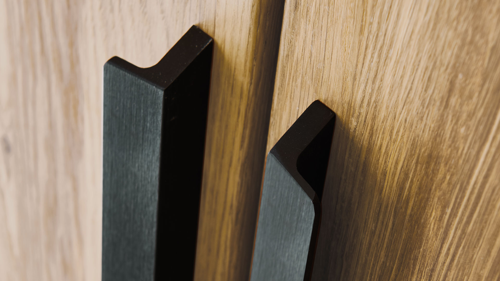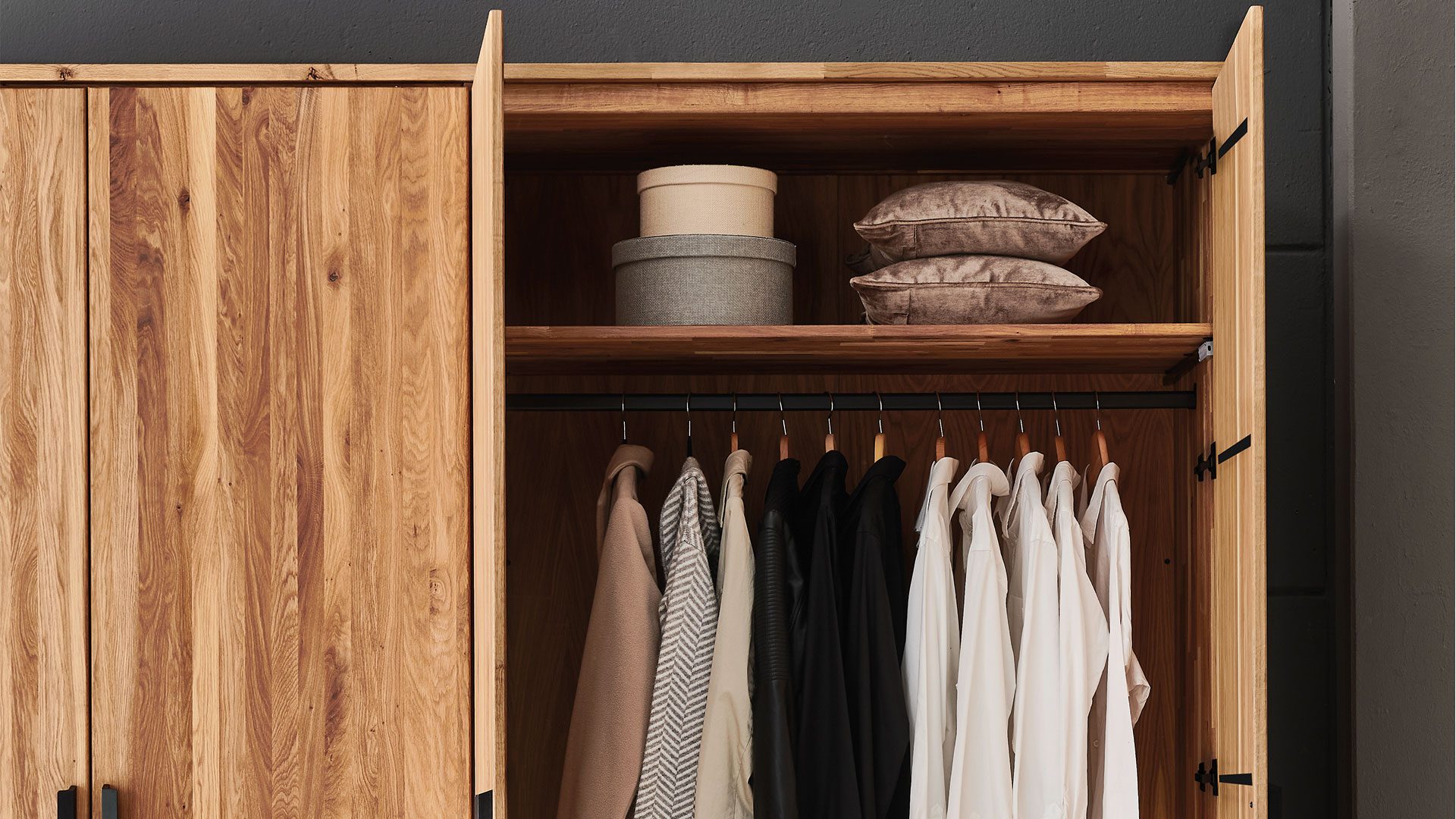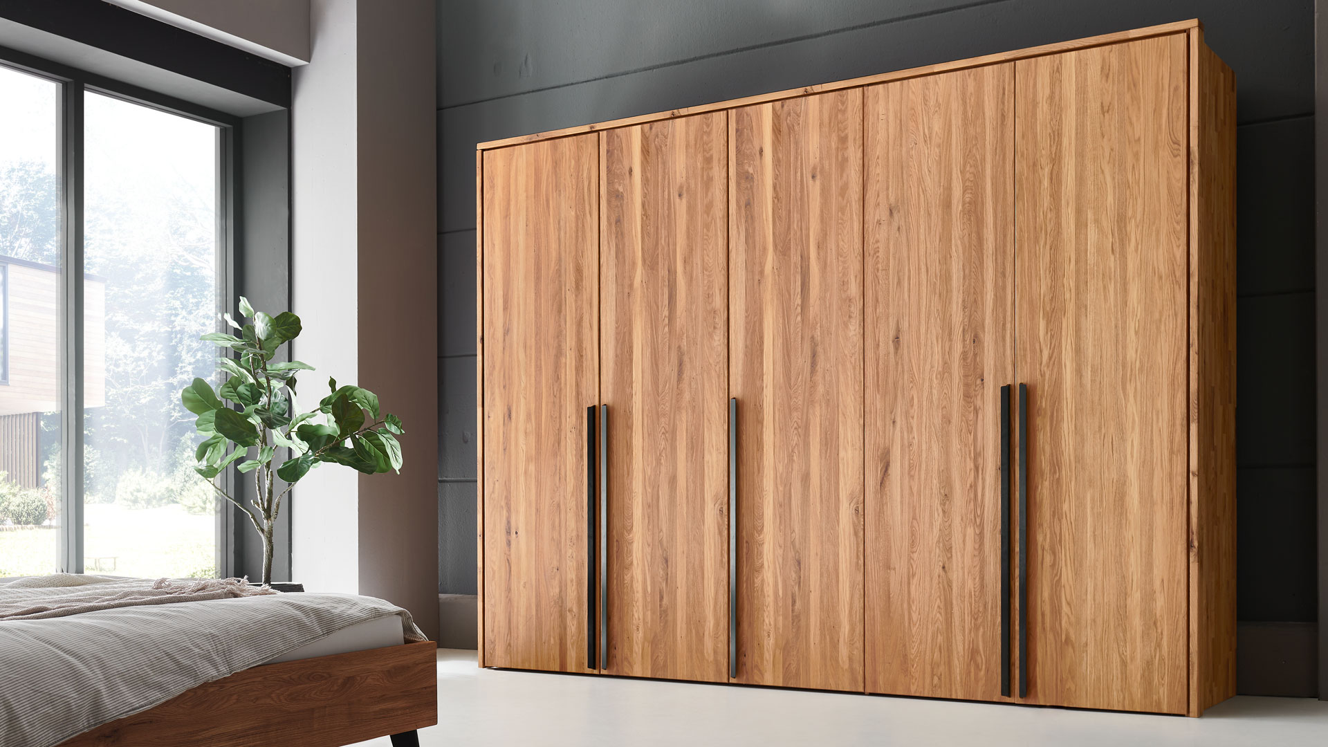 Das massive Wildeichenholz von Drehtüren-Kleiderschrank "Albero" versprüht charmante Natürlichkeit, welche durch die langen Winkelgriffe aus schwarzem Metall stilvoll akzentuiert wird. Wenn Sie einen helleren, moderneren Look bevorzugen, treffen Sie mit der Bianco-Oberfläche die perfekte Wahl - sie lässt den Schrank optisch leichter wirken und sorgt für eine frische, zeitlose Eleganz. Mit der geölten Oberfläche hingegen bleibt die natürliche Maserung des Holzes besonders lebendig und verleiht Ihrem Schlafzimmer eine warme, einladende Atmosphäre.