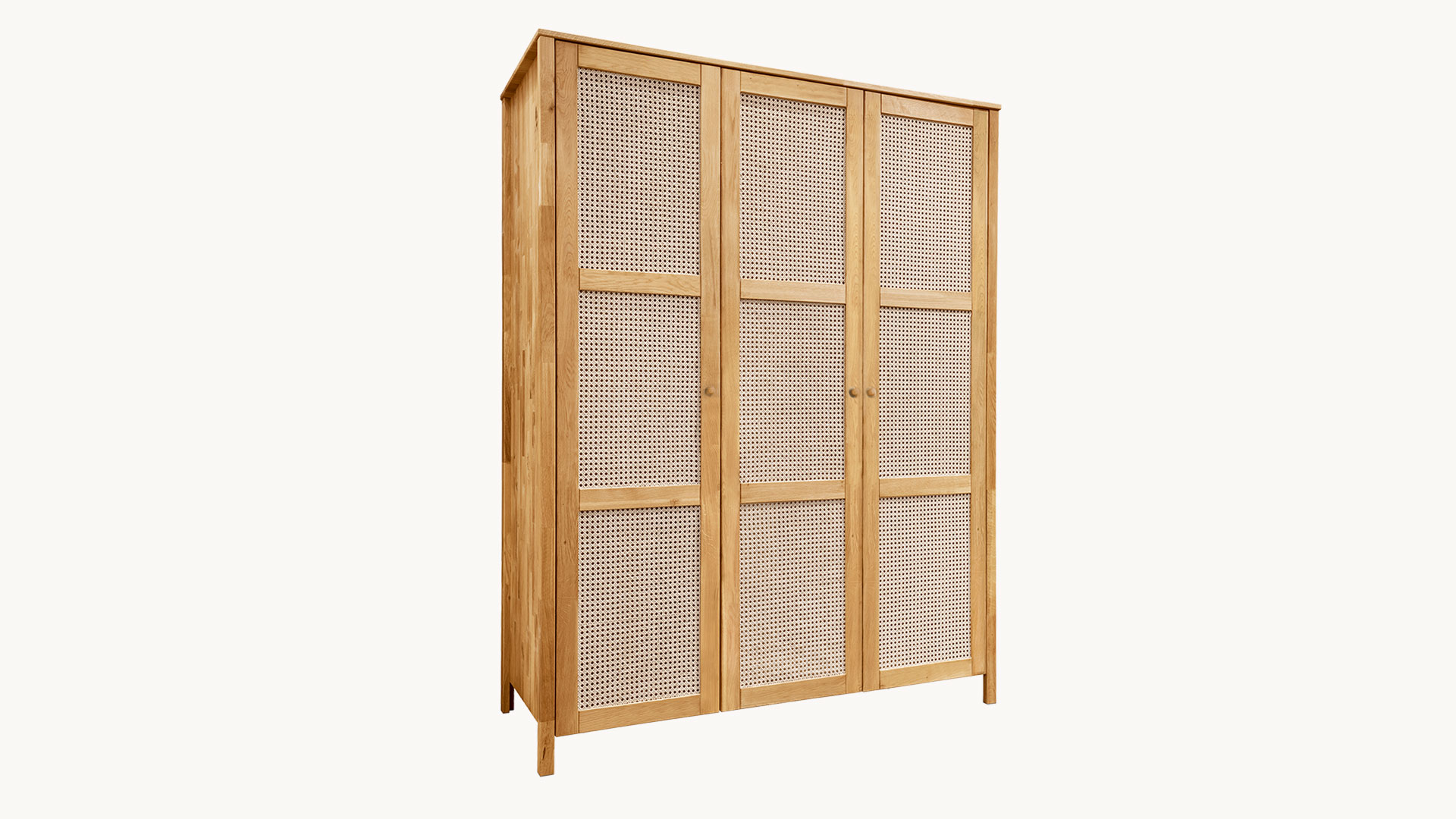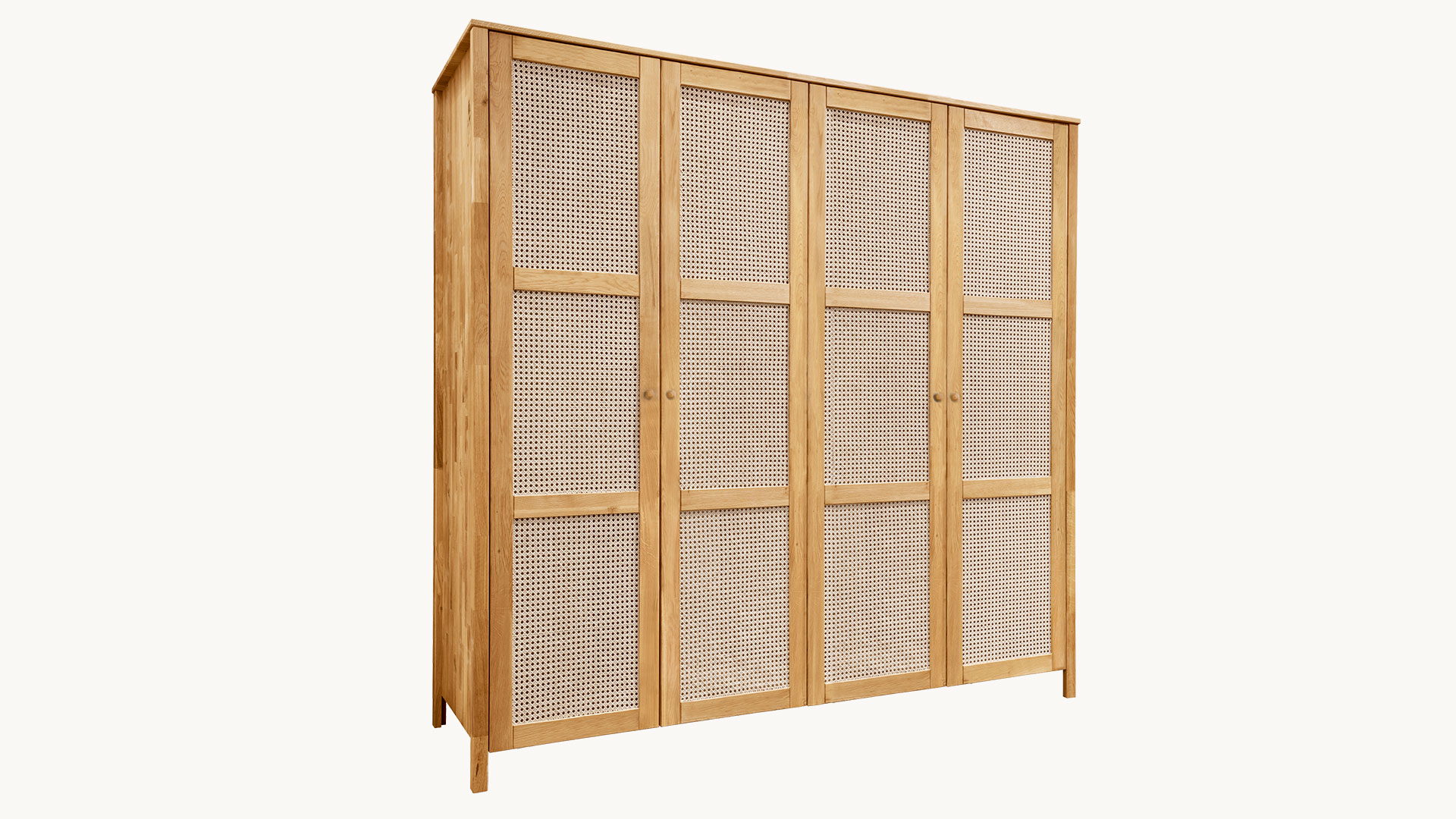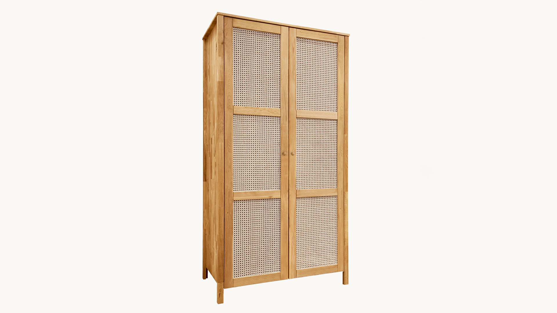 Das Wiener Geflecht ist ein echter Klassiker der Möbelbaukunst, der sich auch heute noch Beliebtheit erfreut. Dieser Kleiderschrank vereint dieses klassische Element mit einer modernen Formgebung. Der Schrank aus edlem Wildeichenholz wirkt durch das Geflecht elegant und zugleich leicht. Hinter dem Wiener Geflecht befindet sich ein dünner Stoff, der nahezu unsichtbar ist. Dieser schützt Ihre Kleidung sicher vor Staub.
