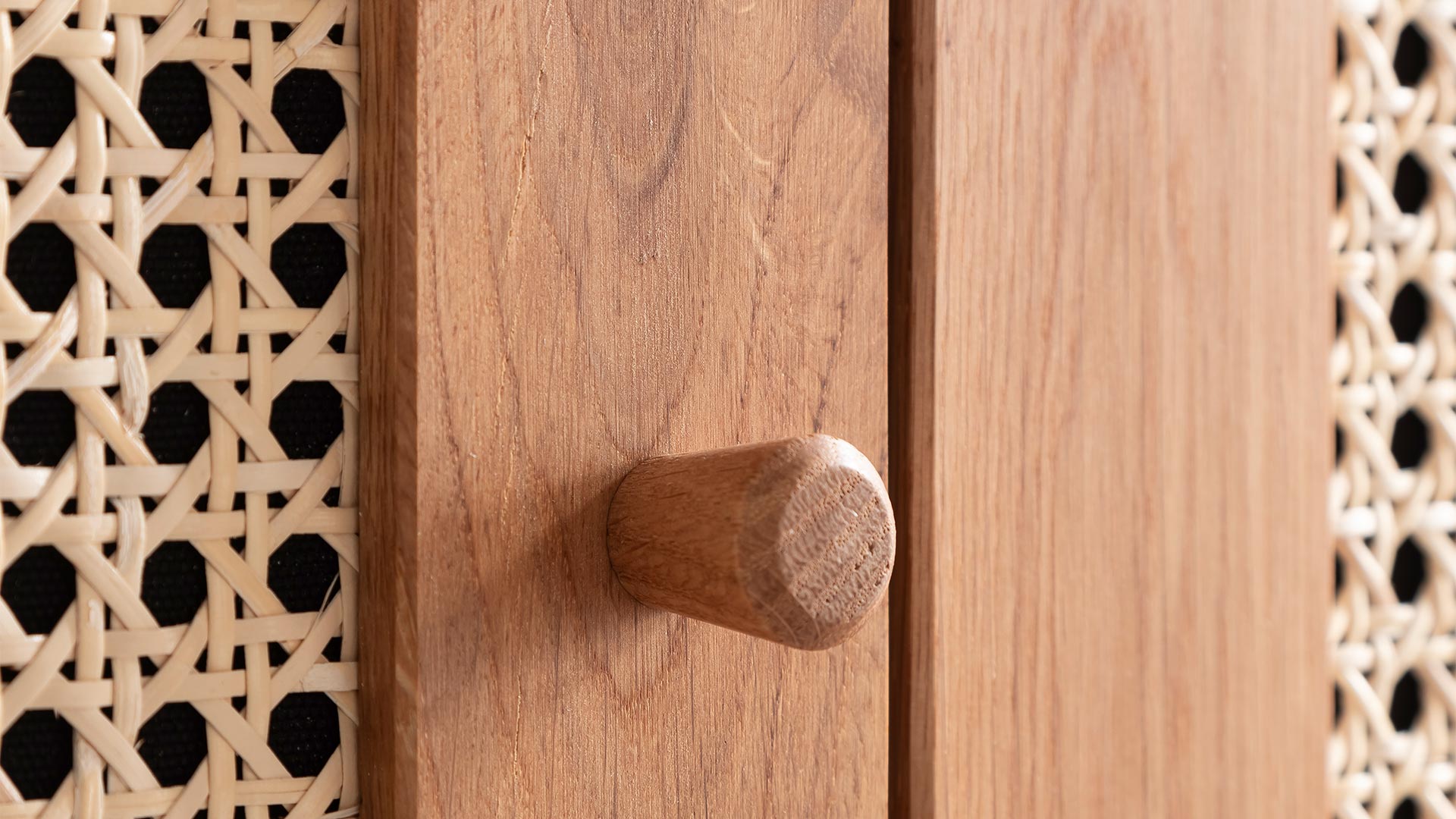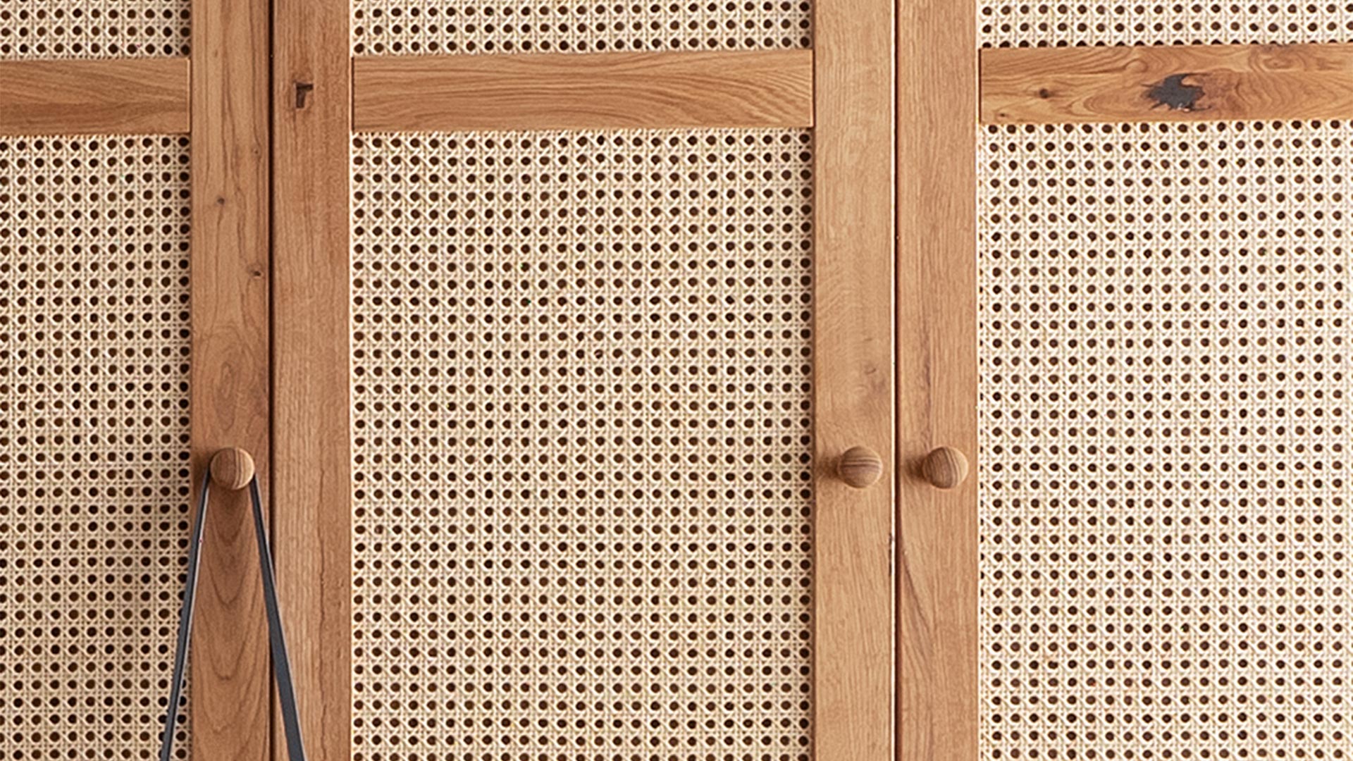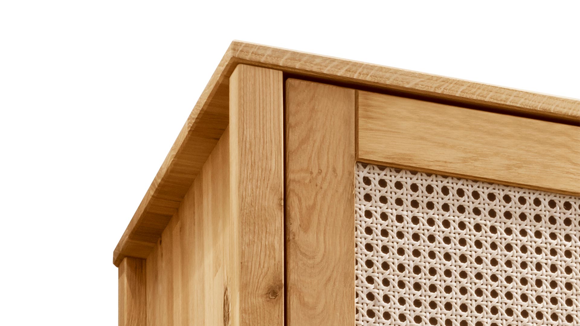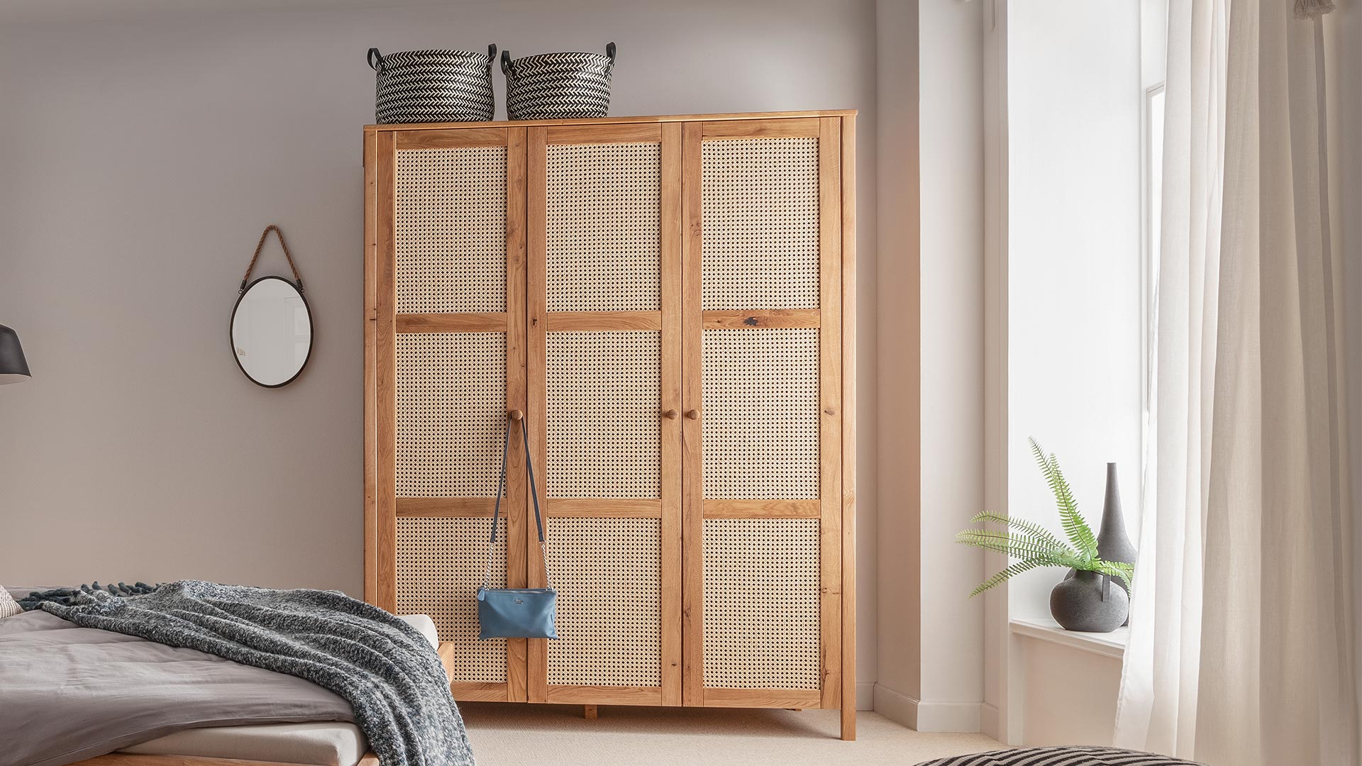 Das Wiener Geflecht ist ein echter Klassiker der Möbelbaukunst, der sich auch heute noch Beliebtheit erfreut. Dieser Kleiderschrank vereint dieses klassische Element mit einer modernen Formgebung. Der Schrank aus edlem Wildeichenholz wirkt durch das Geflecht elegant und zugleich leicht. Hinter dem Wiener Geflecht befindet sich ein dünner Stoff, der nahezu unsichtbar ist. Dieser schützt Ihre Kleidung sicher vor Staub.