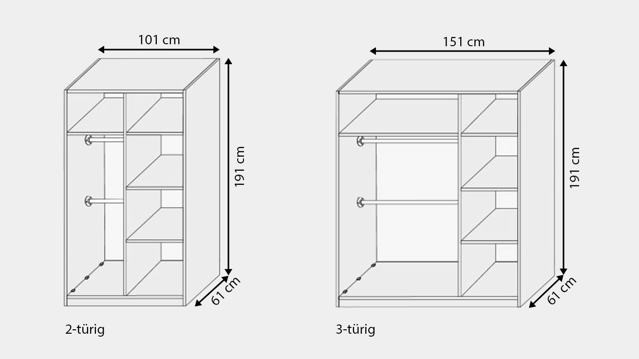 In der 2-türigen Variante finden hinter einer Türe an 2 übereinander angebrachten, kurzen Kleiderstangen die Jacken und Mäntelchen Ihres Sprösslings den perfekten Ort. Die zweite Türe verbirgt 3 praktische Einlegeböden. Beim 3-Türer ist die Schrankseite, die die Kleiderstangen beinhaltet, doppelt so breit gestaltet. Bitte beachten Sie auch die Beschreibung der Inneneinteilung auf dieser Produktseite.