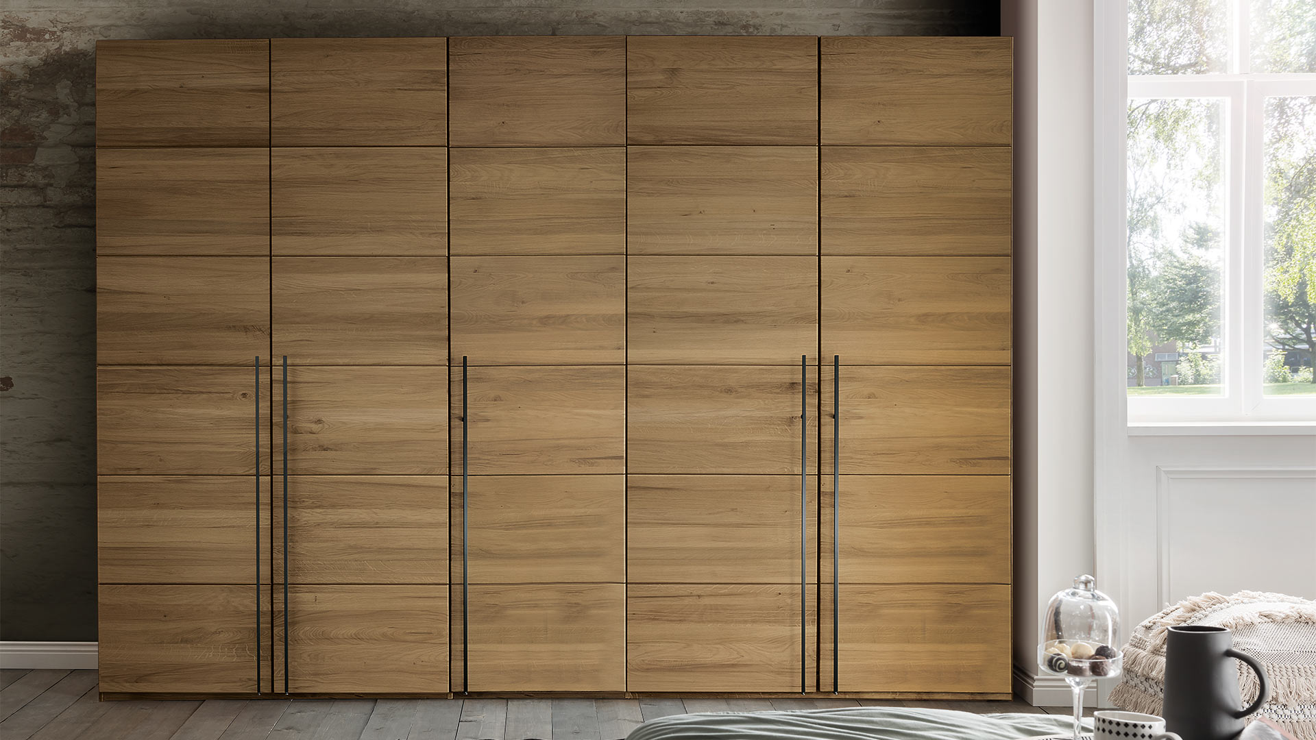 ... Die schöne Kassettenstruktur der edlen, stabverleimten Türen entsteht durch elegante, sorgfältig eingearbeitete Querfugen. Ein absoluter Blickfang sind die langen Relinggriffe aus Metall, die im unteren Teil der Schranktüren angebracht sind. "Moderna" wird aus massivem Kernbuchen- oder Wildeichenholz gefertigt. Wählen Sie aus 10 Schrankbreiten von schlanken 96 cm bis stolzen 359 cm. Wenn Sie sich für die pfiffige Höhe 235 cm entscheiden, nutzen Sie sogar den Raum bis zur Decke optimal. Mit dem vielseitigen Zubehör und dem optionalen Passepartoutrahmen wird die Schrank-Gestaltung zur reinen Freude.