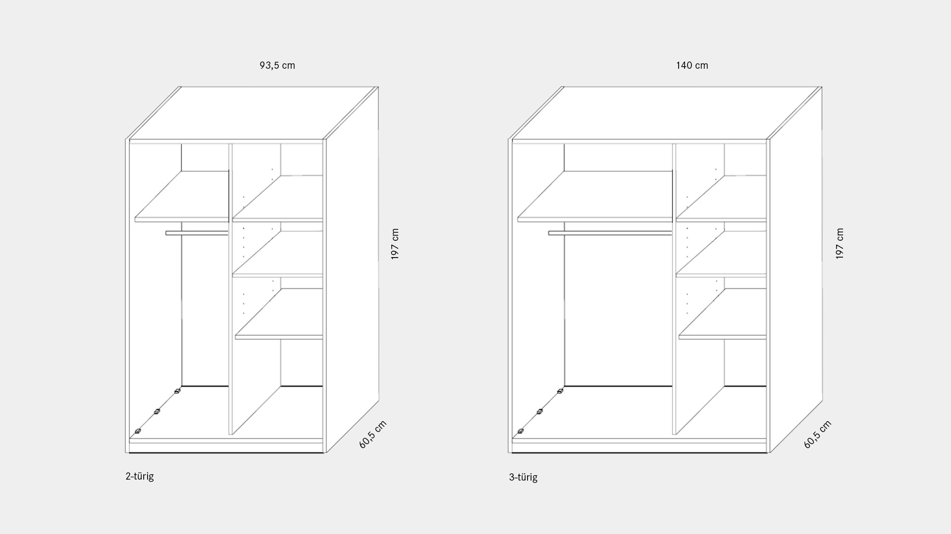 Kleiderschrank in 2 Breiten erhältlichin der Maßgrafik erhalten Sie auch Informationen zur Schrank-Inneneinteilung - Maßgrafik anzeigen