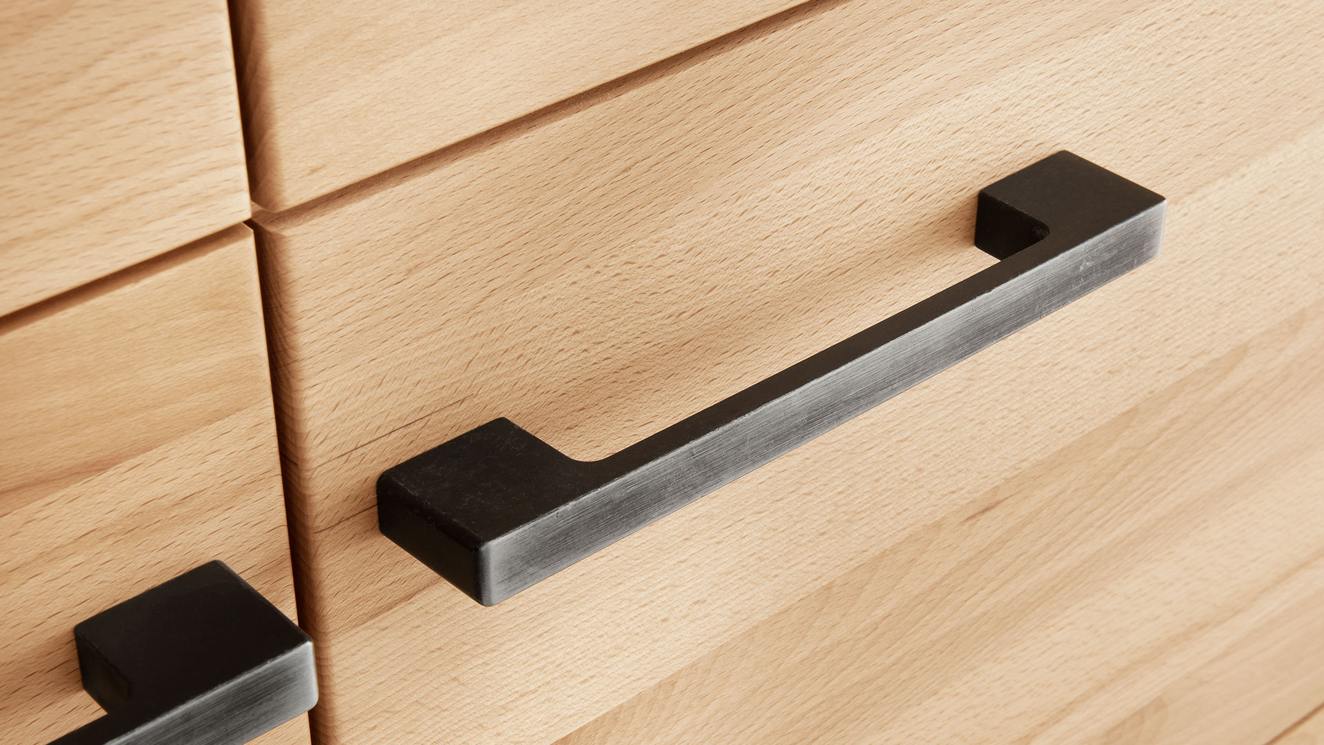 - aus massivem Kernbuchen- oder Wildeichenholz, Fronten aufwändig stabverleimt mit durchgehenden Lamellen, Korpus parkettverleimt