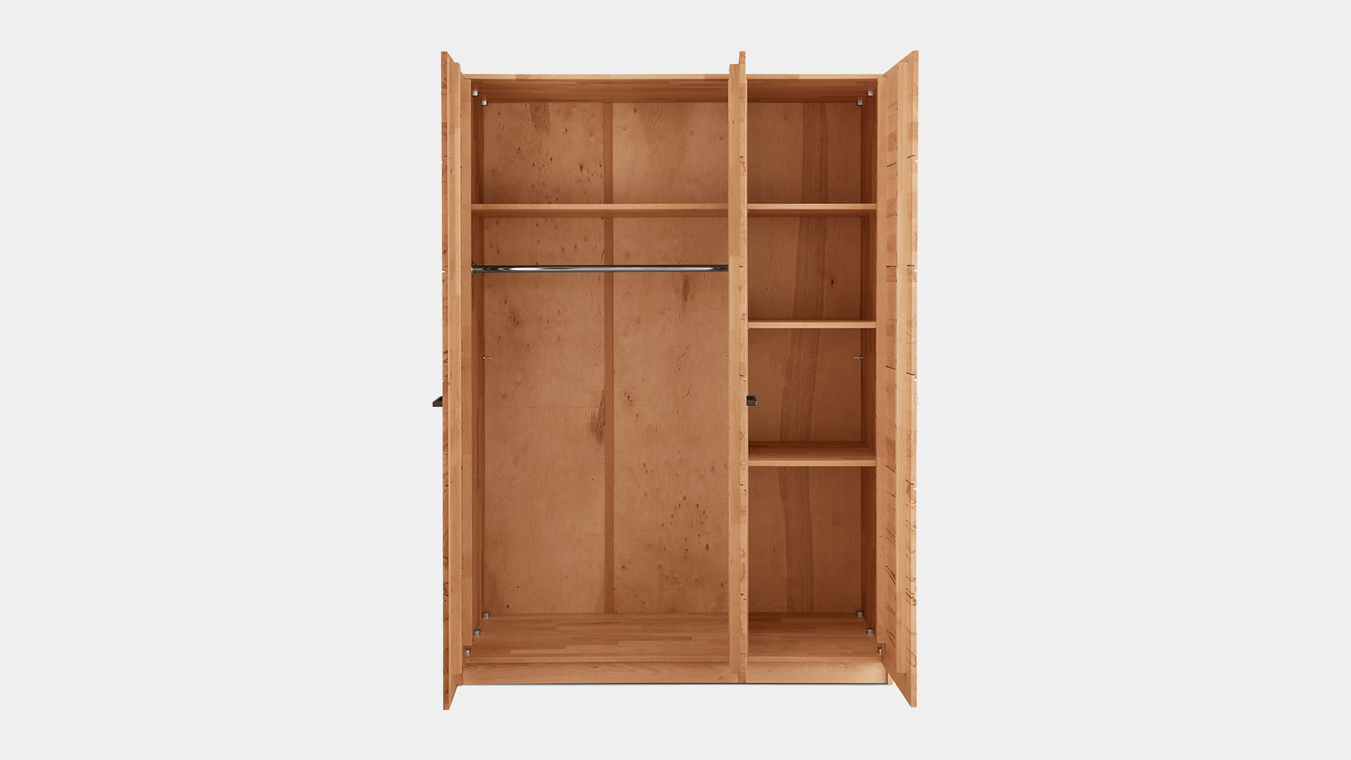 links breites Schrankelement mit 1 langen Einlegeboden und 1 langen Kleiderstange, rechts schmales Schrankelement mit 3 Einlegeböden