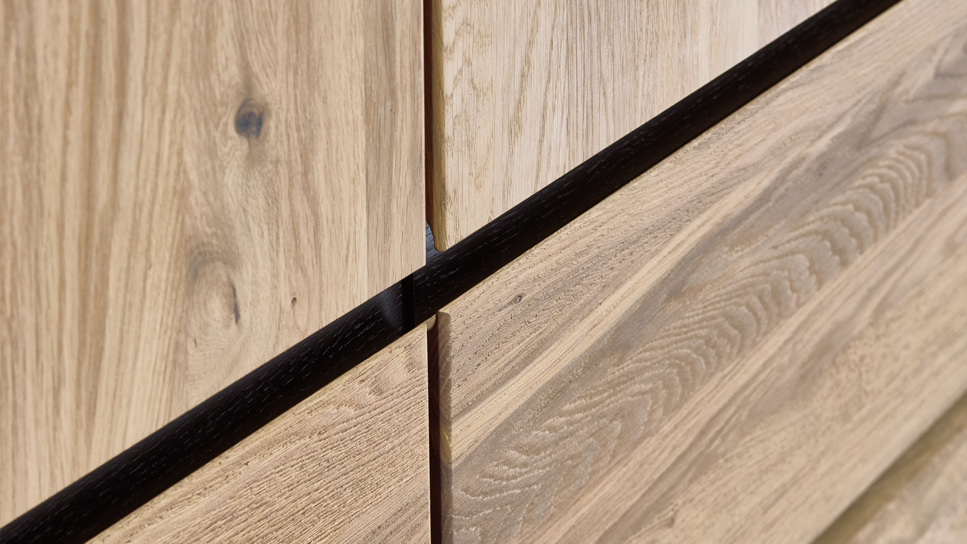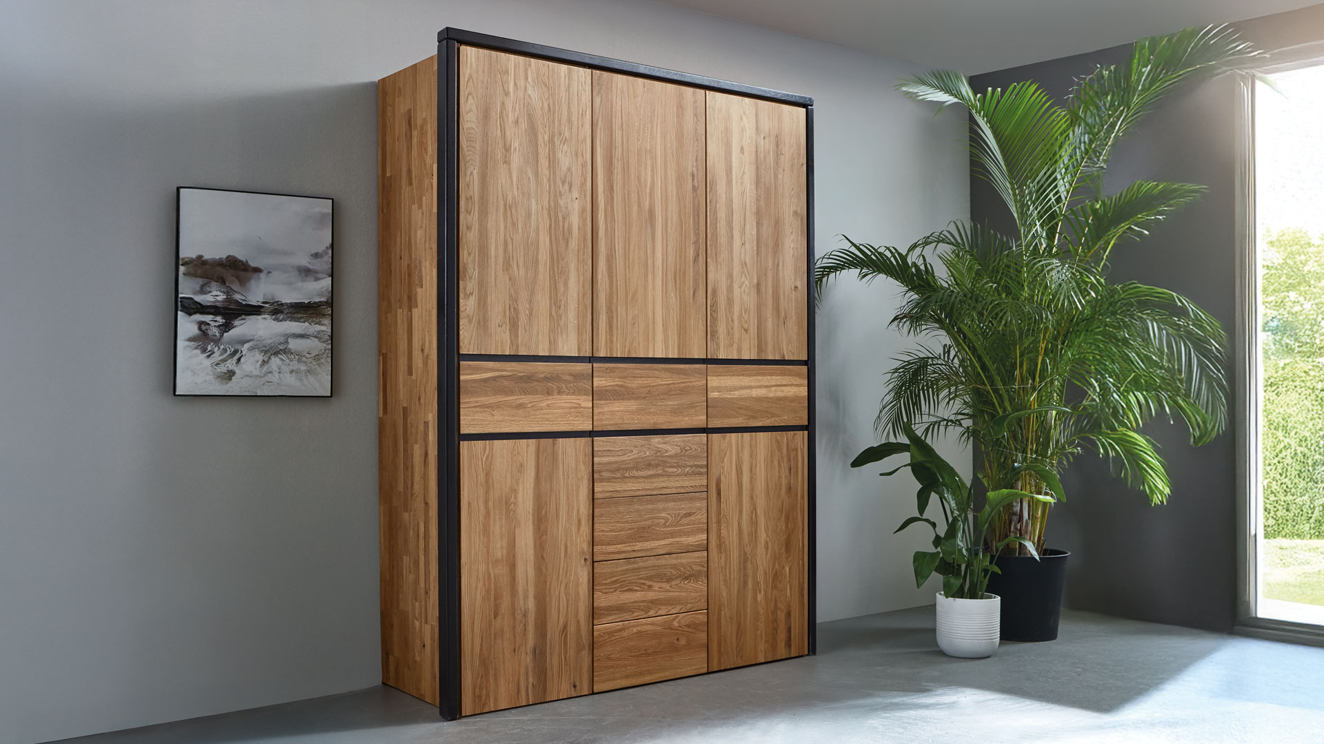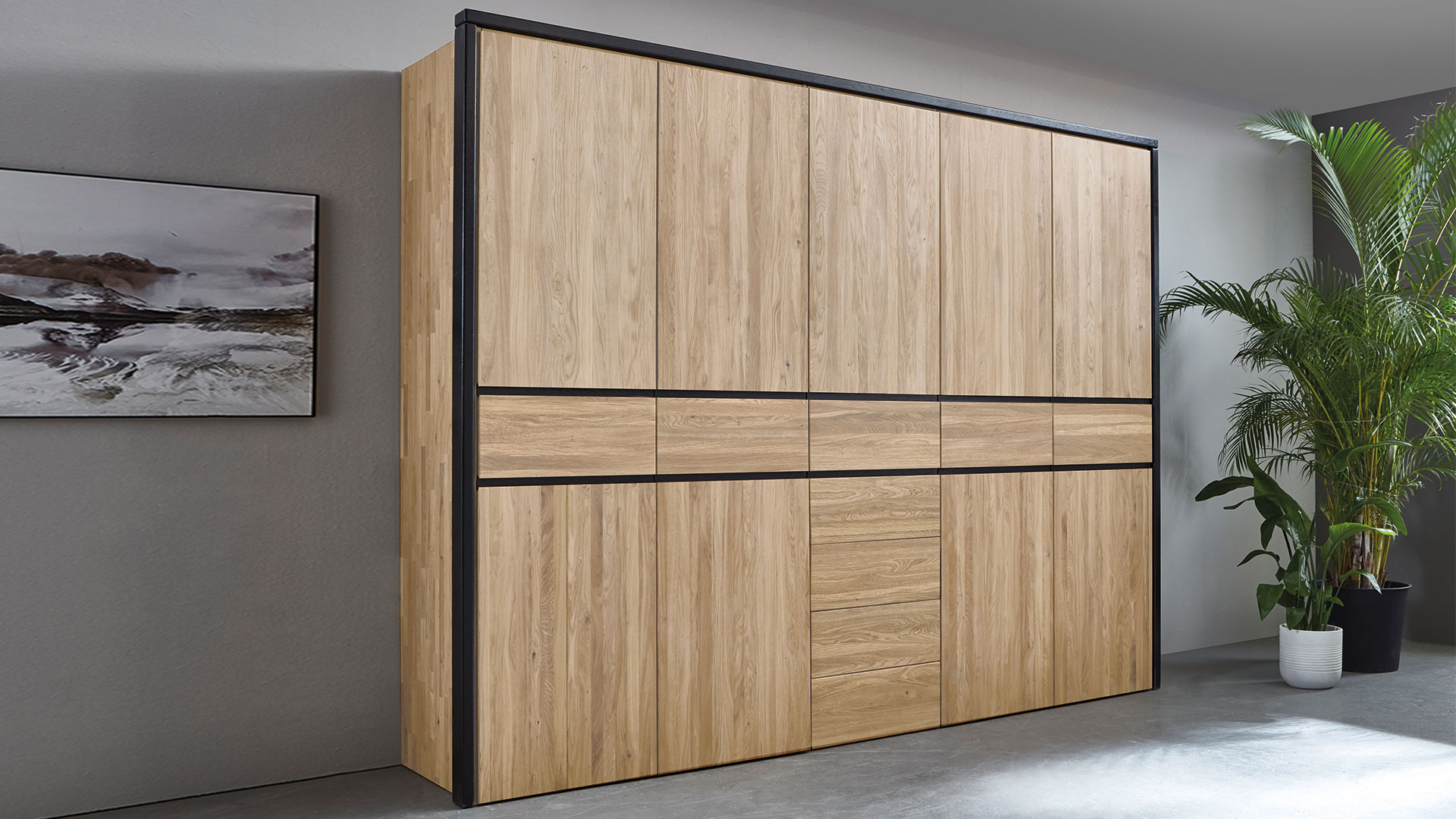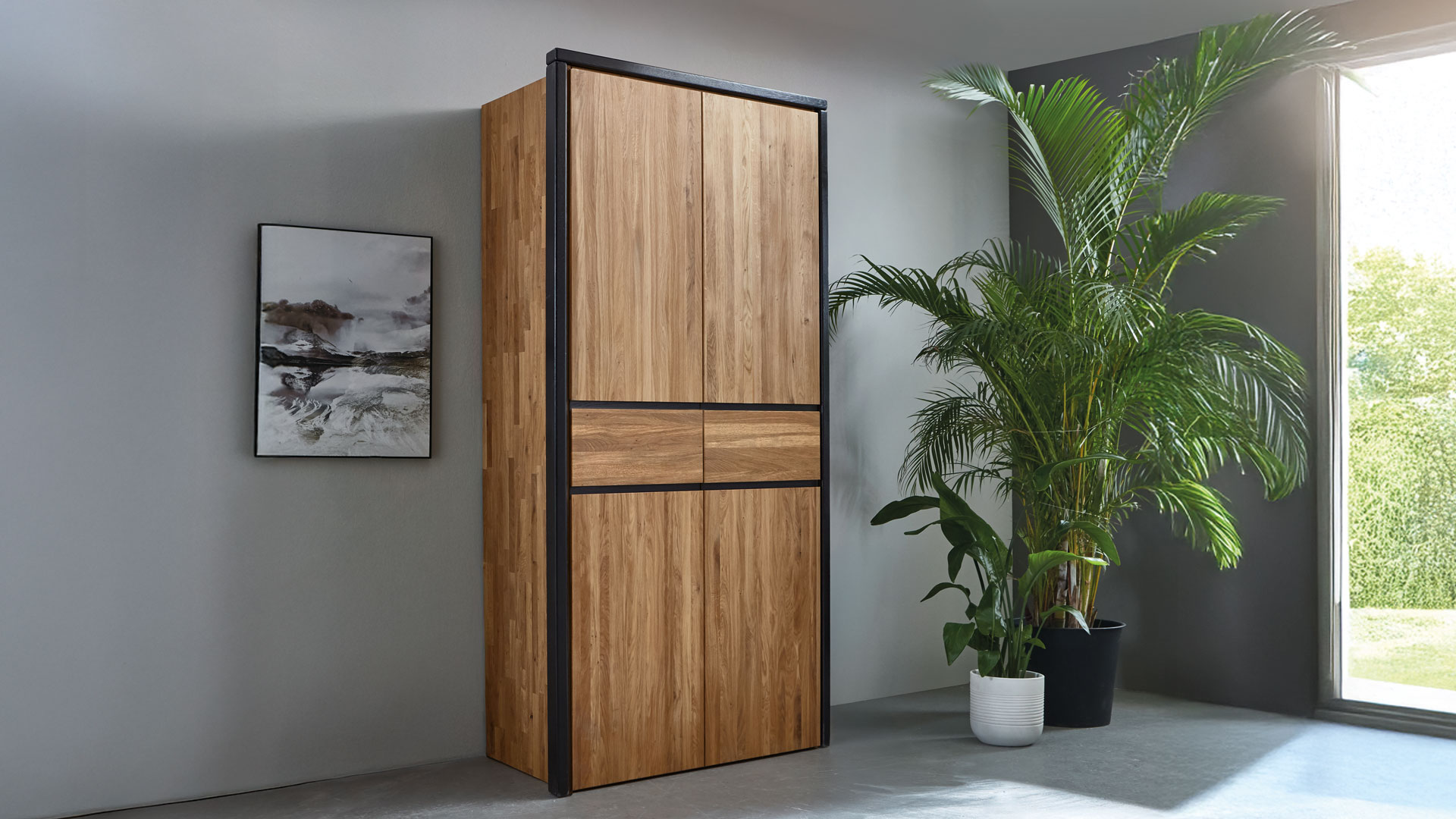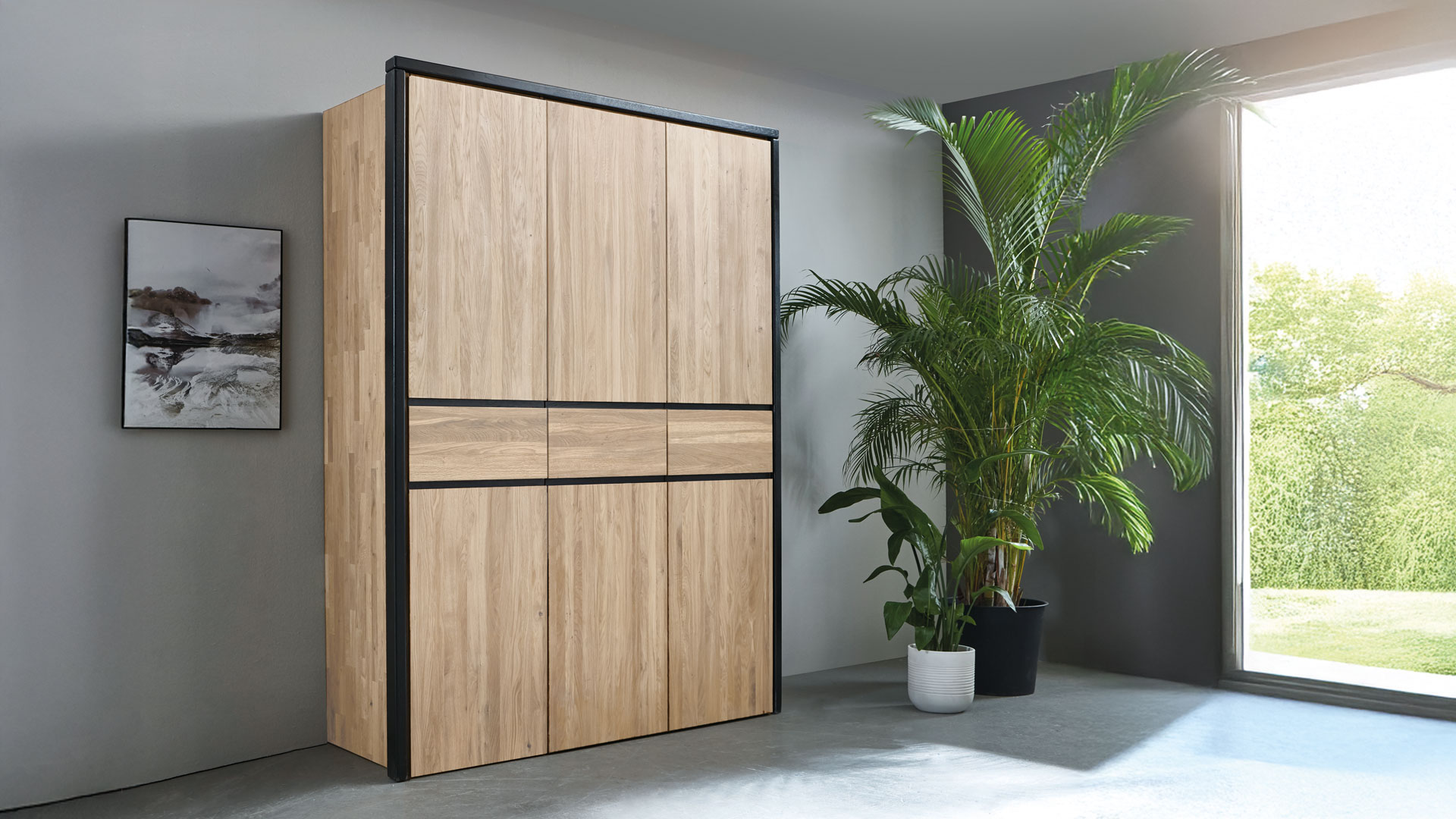 Drehtüren-Kleiderschrank "Tronco" kombiniert funktionale Raffinesse mit natürlicher Eleganz. Die vertikal verlaufende Maserung der massiven Wildeiche bringt die natürliche Schönheit des Holzes besonders zur Geltung, während die mittig platzierte Bauchbinde einen ansprechenden Akzent setzt. Ein besonderes Highlight sind die schwarzen Griffmulden ober- und unterhalb der Bauchbinde. Diese verleihen dem Schrank eine moderne Note, die besonders eindrucksvoll mit der hellen Bianco-Oberfläche zur Geltung kommt. Aber auch mit der geölten Oberfläche wird die Bauchbinde durch die schwarze Farbe effektvoll hervorgehoben.