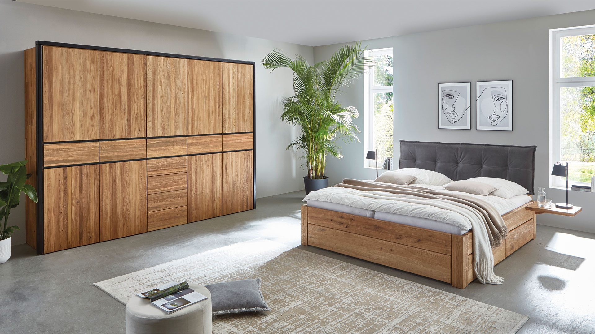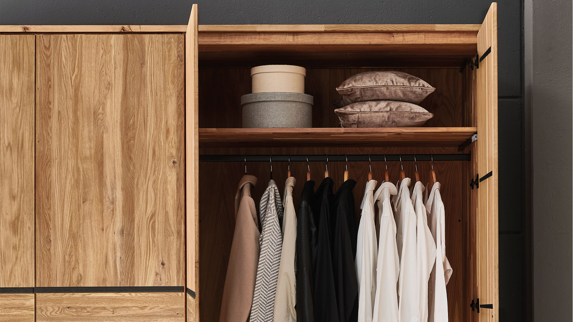 Erhältlich in 4 unterschiedlichen Breiten, bietet der Kleiderschrank genügend Stauraum für Kleidung und Accessoires. Die Ausführungen mit 3 oder 5 Türen gibt es wahlweise auch mit 4 praktischen Schubladen. Mit Drehtüren-Kleiderschrank "Tronco" holen Sie sich ein stilvolles Möbelstück ins Schlafzimmer, das durch hochwertige, natürliche Materialien, durchdachte Details und großzügigen Stauraum überzeugt.