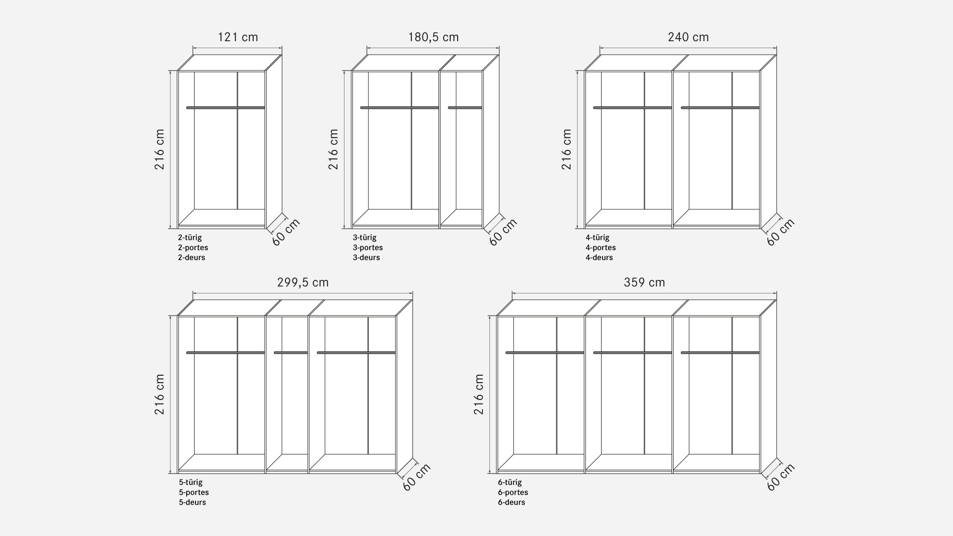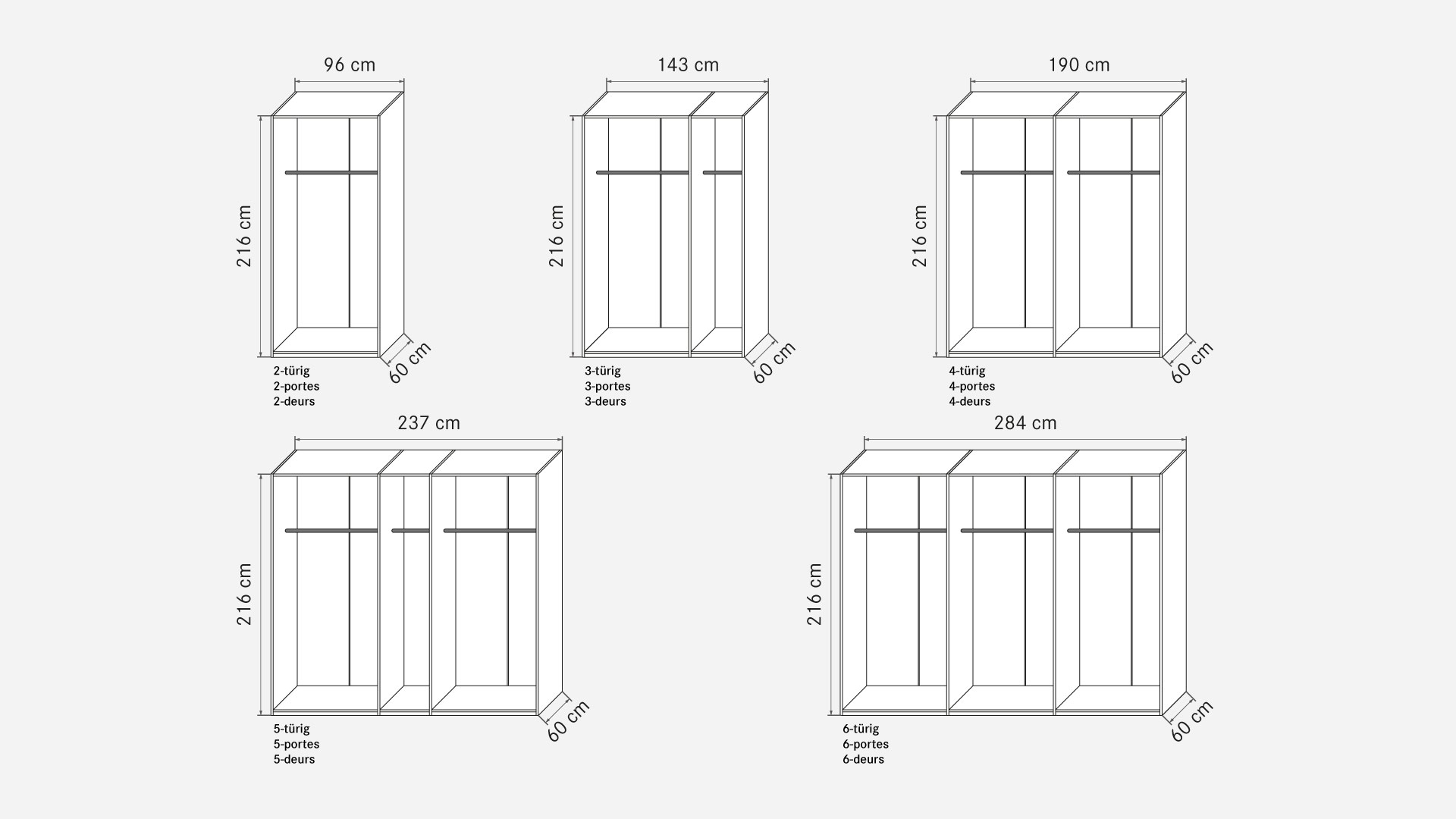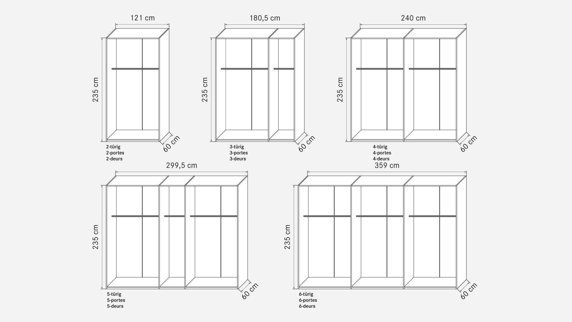 Wir bieten Ihnen Drehtüren-Kleiderschrank "Varadero" als 2- bis 6-Türer wahlweise im 50er- oder 60er-Raster an. Damit lassen sich Kleiderschrank-Breiten von schlanken 96 cm bis zu imposanten 359 cm realisieren. Sie möchten die Raumhöhe optimal nutzen? Dann entscheiden Sie sich für die Schrankhöhe mit stolzen 235 cm. Auch bei der Innenausstattung sind Sie dank vielfältigem Zubehör höchst flexibel. Sie möchten "Varadero" einen würdigen Abschluss geben? Dazu empfehlen wir Ihnen einen Passepartout-Rahmen, der als Zubehör erhältlich ist. Sie wünschen sich einen größeren Kleiderschrank oder eine Ecklösung? Dann können Sie sich mit dem passenden Endlos-Schranksystem Ihren Kleiderschrank "Varadero" aus Einzelmodulen maßschneidern.