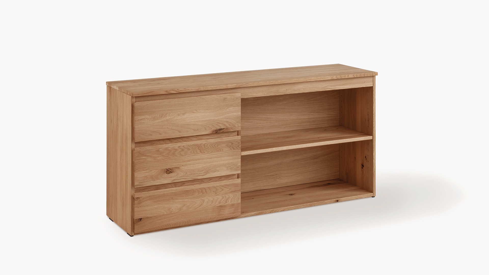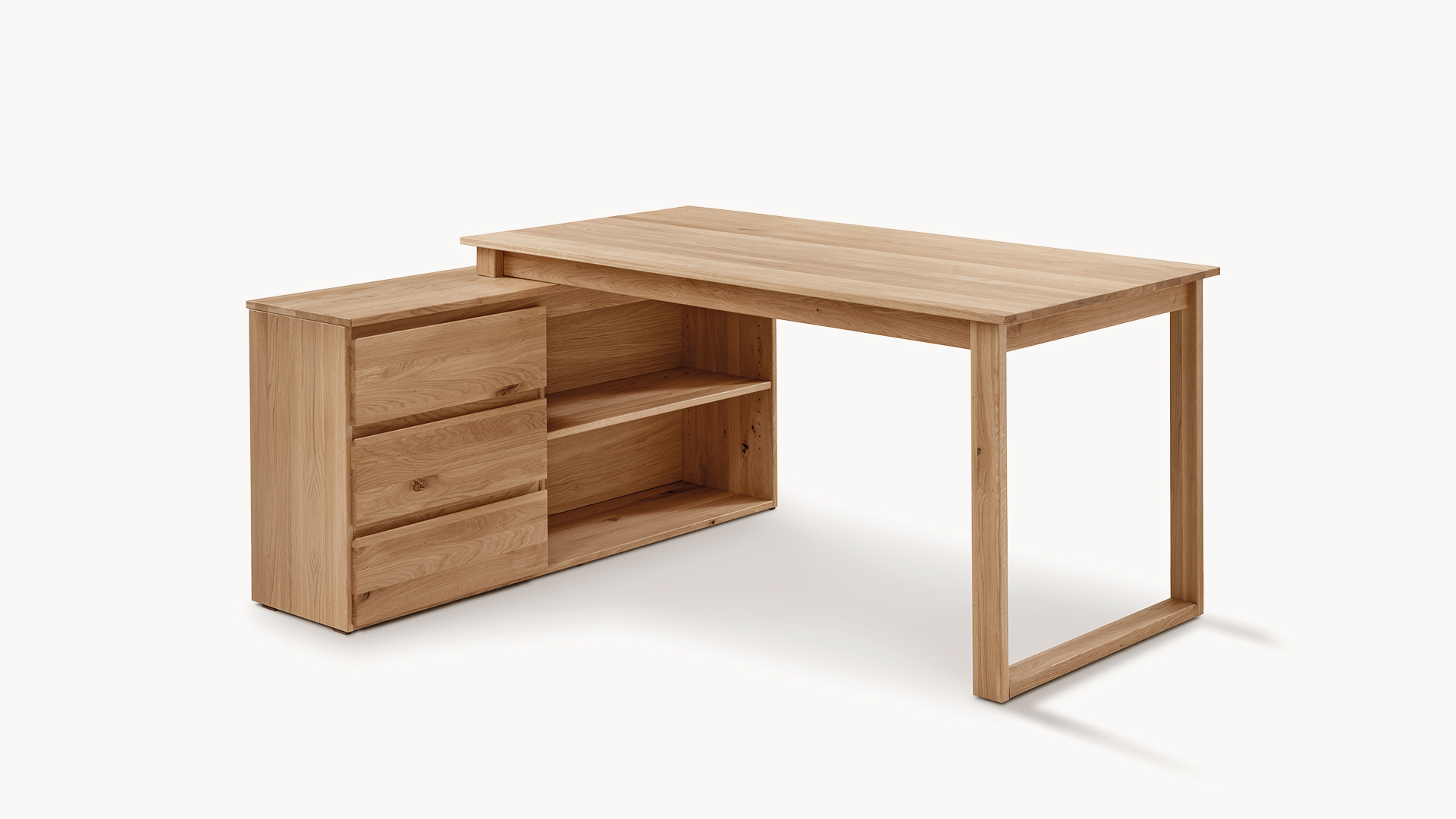 Dieser Eckschreibtisch verbindet großzügige Arbeitsfläche mit durchdachter Ordnung. Massive Wildeiche mit lebendiger Maserung schafft eine warme, ruhige Atmosphäre und unterstützt fokussiertes Arbeiten. Das integrierte Sideboard bietet praktischen Platz für Unterlagen, Bürobedarf und auch für einen Drucker. Es ist wahlweise links oder rechts erhältlich. Die fest mit der Sideboard-Deckplatte verschraubte Tischplatte sorgt für hohe Stabilität und ein stimmiges Gesamtbild. Mit Sorgfalt und Sachverstand in Deutschland gefertigt – für langlebige Qualität mit natürlicher Ausstrahlung.