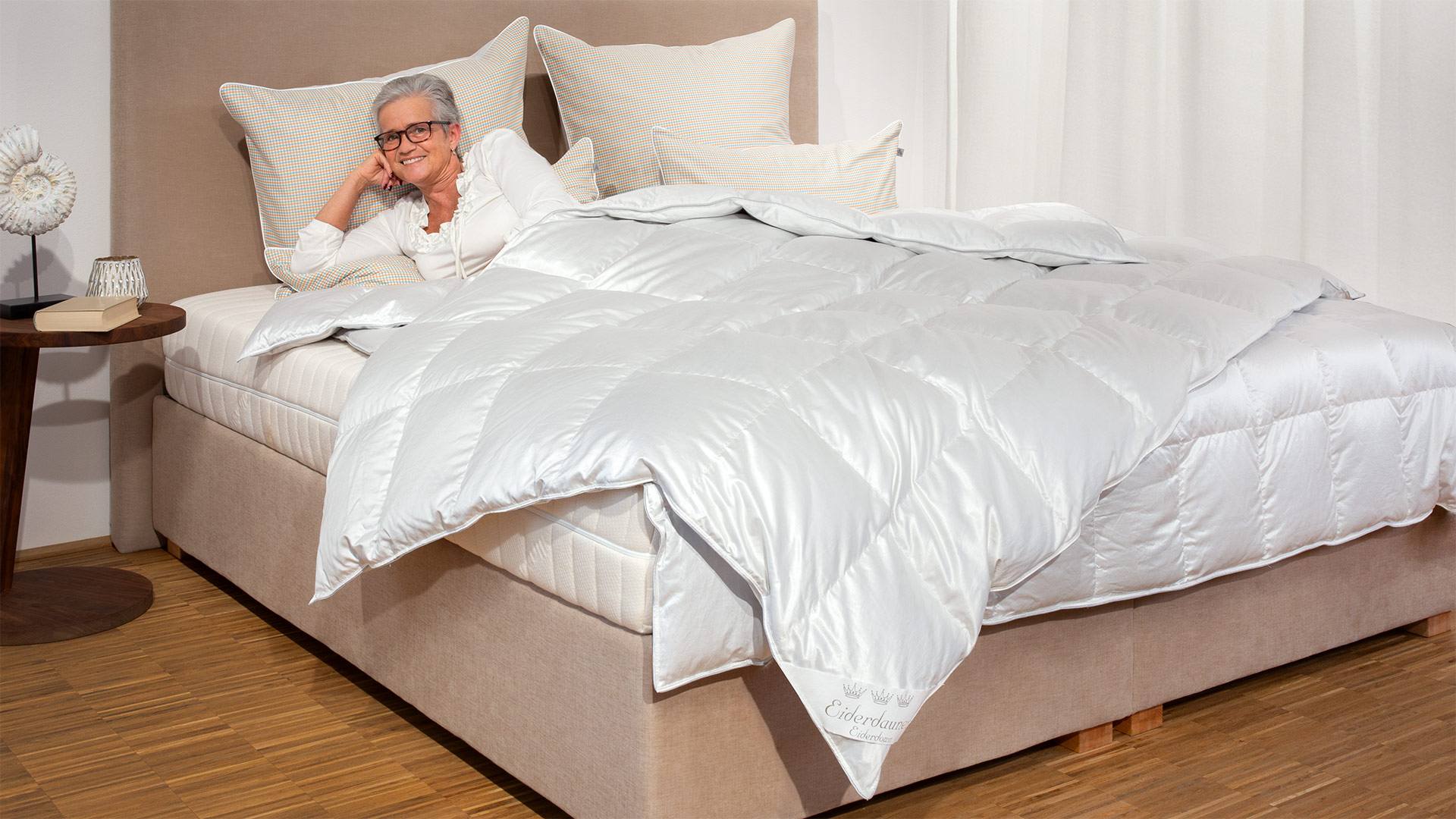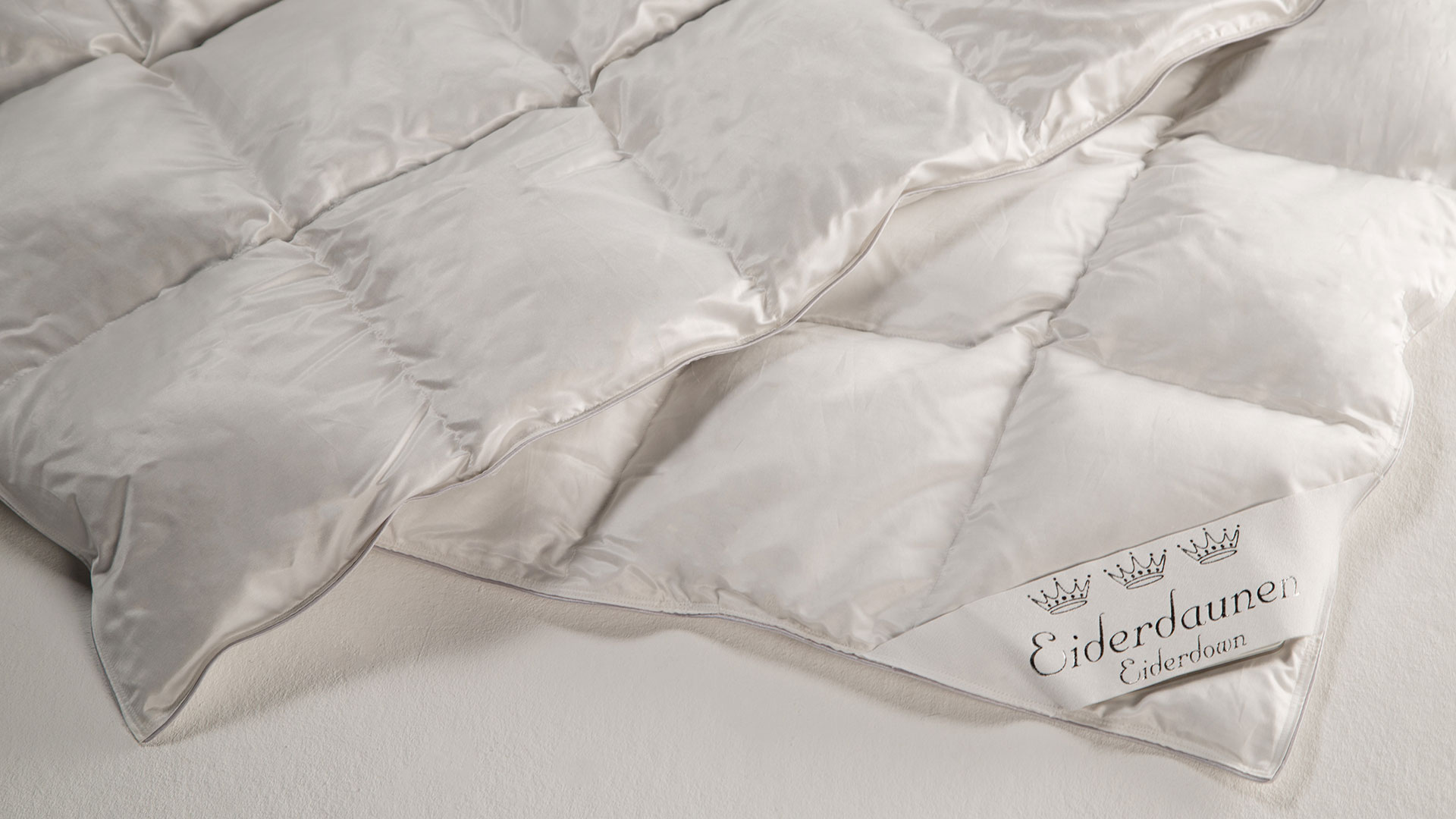 In unserer Partner-Manufaktur in Niedersachsen werden die kostbaren Eiderdaunen liebevoll von Hand in den Bezug verfüllt und verarbeitet. Für die edlen Eiderdaunen haben wir uns für einen nobel glänzenden Bezugsstoff aus feinstem Mako-Satin aus 100 % Baumwolle entschieden, da dieser die unübertrefflichen Eigenschaften der Eiderdaune voll zur Geltung bringt. Der Bezug ist mit einer silberfarbenen Biese verarbeitet. Eine aufwändige Kassettensteppung mit Innensteg sorgt für die gleichmäßige Verteilung der Daunen, ohne sie zu quetschen.
