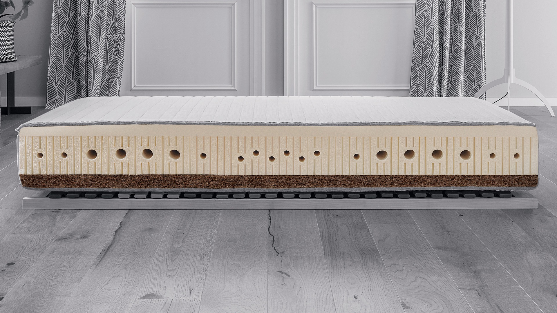 Angenehm feste und dennoch elastische Schicht aus latexierten Kokosfasern. Macht die Matratze formstabil und sorgt für eine perfekte Auflage auf dem Lattenrost.