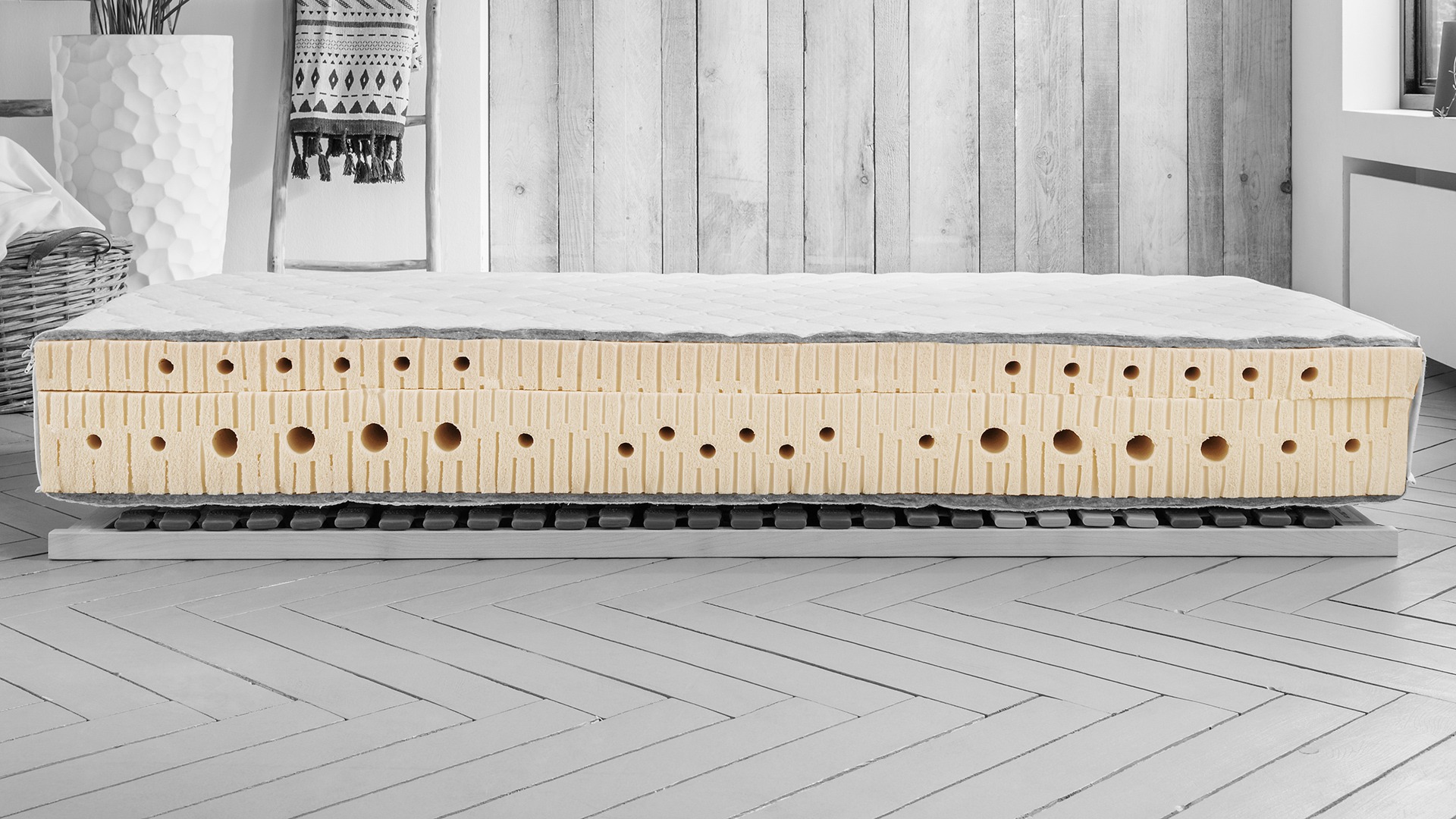 Stiftlatex aus 100 % Naturkautschuk mit 7-Zonen-Körperstützsystem und integrierter Schulterabsenkung. Für ein luxuriöses Liegeempfinden ganz nach Wunsch.