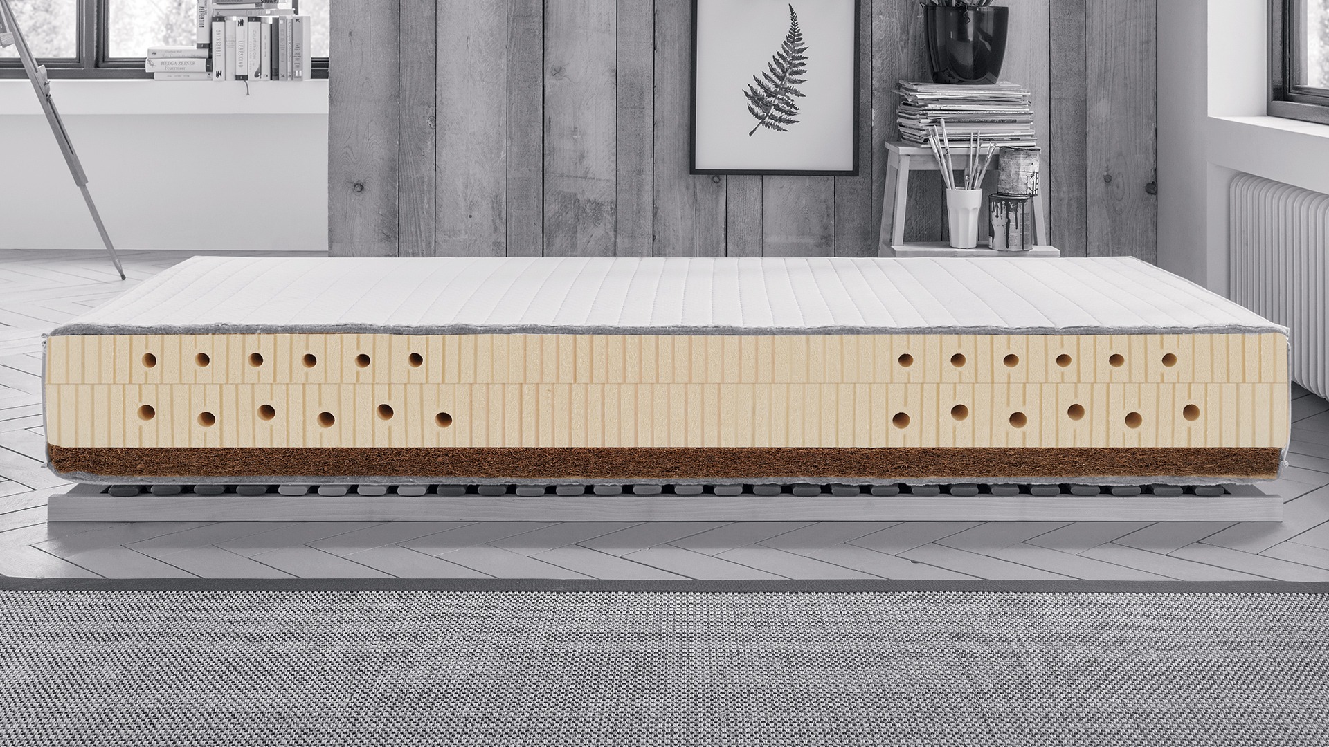 Angenehm feste und dennoch elastische Schicht aus latexierten Kokosfasern. Macht die Matratze formstabil und sorgt für eine perfekte Auflage auf dem Lattenrost.
