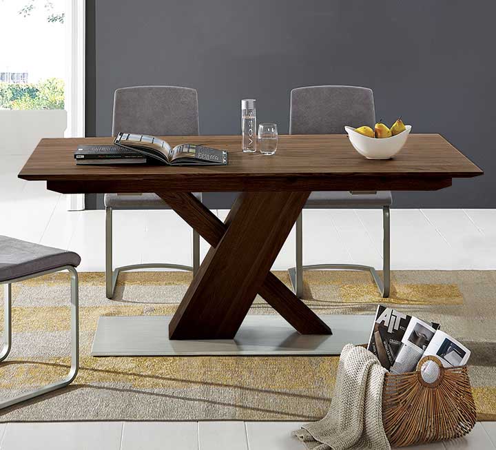 - aufgesetzte Tischplatte mit durchgehenden Lamellen und Schweizer Kante, x-förmige Holzsäule mit Bodenplatte aus Metall (wahlweise silbergrau oder mattschwarz)