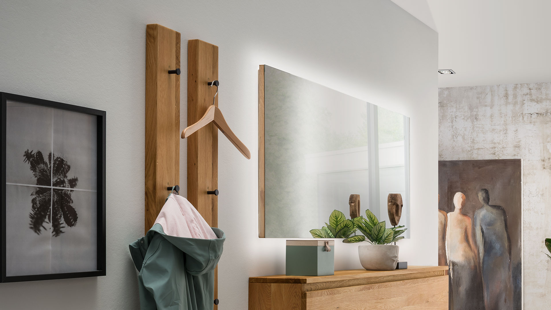 Das Dielenmöbel-Programm "Volitare" bietet Ihnen und Ihren Gästen einen Empfang der Extraklasse. Diese moderne Serie begeistert durch Ihre optische Leichtigkeit, da alle Möbel hängend angebracht werden. Das massive Wildeichenholz kommt durch die geradlinige und grifflose Gestaltung attraktiv zur Geltung.
