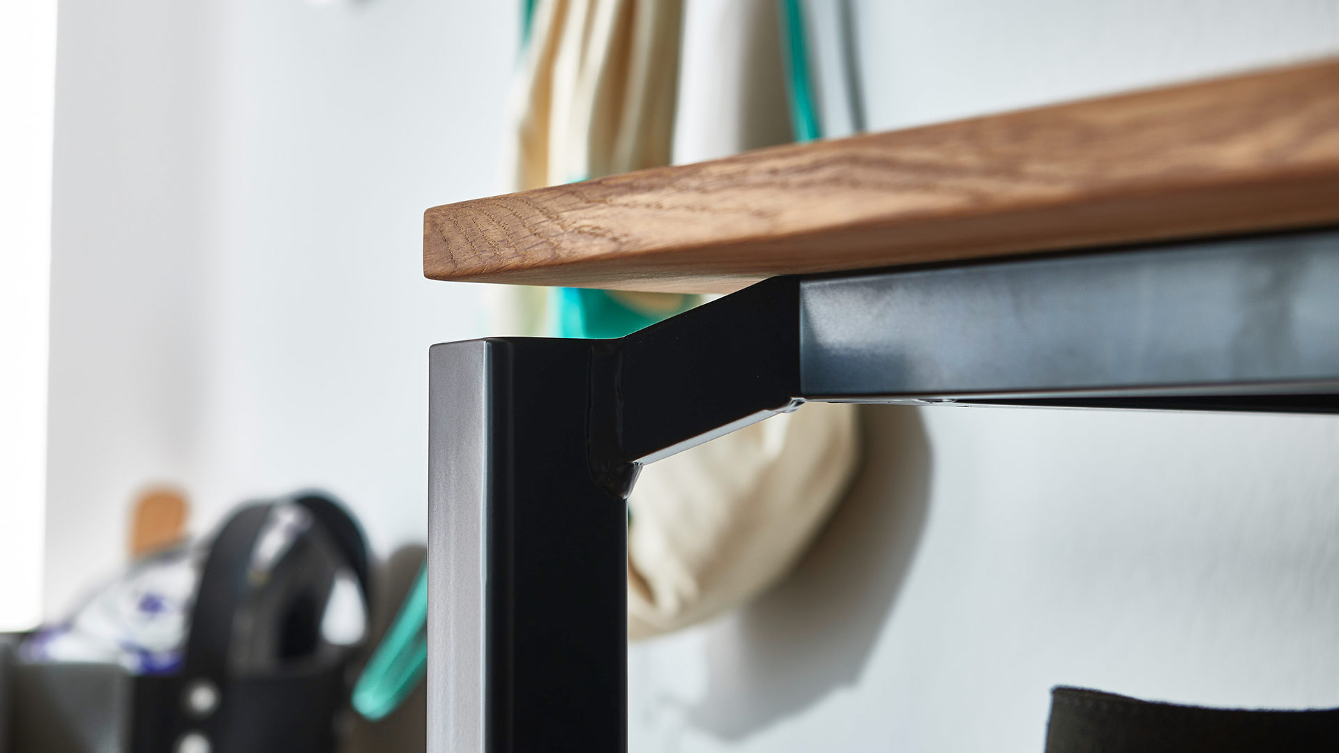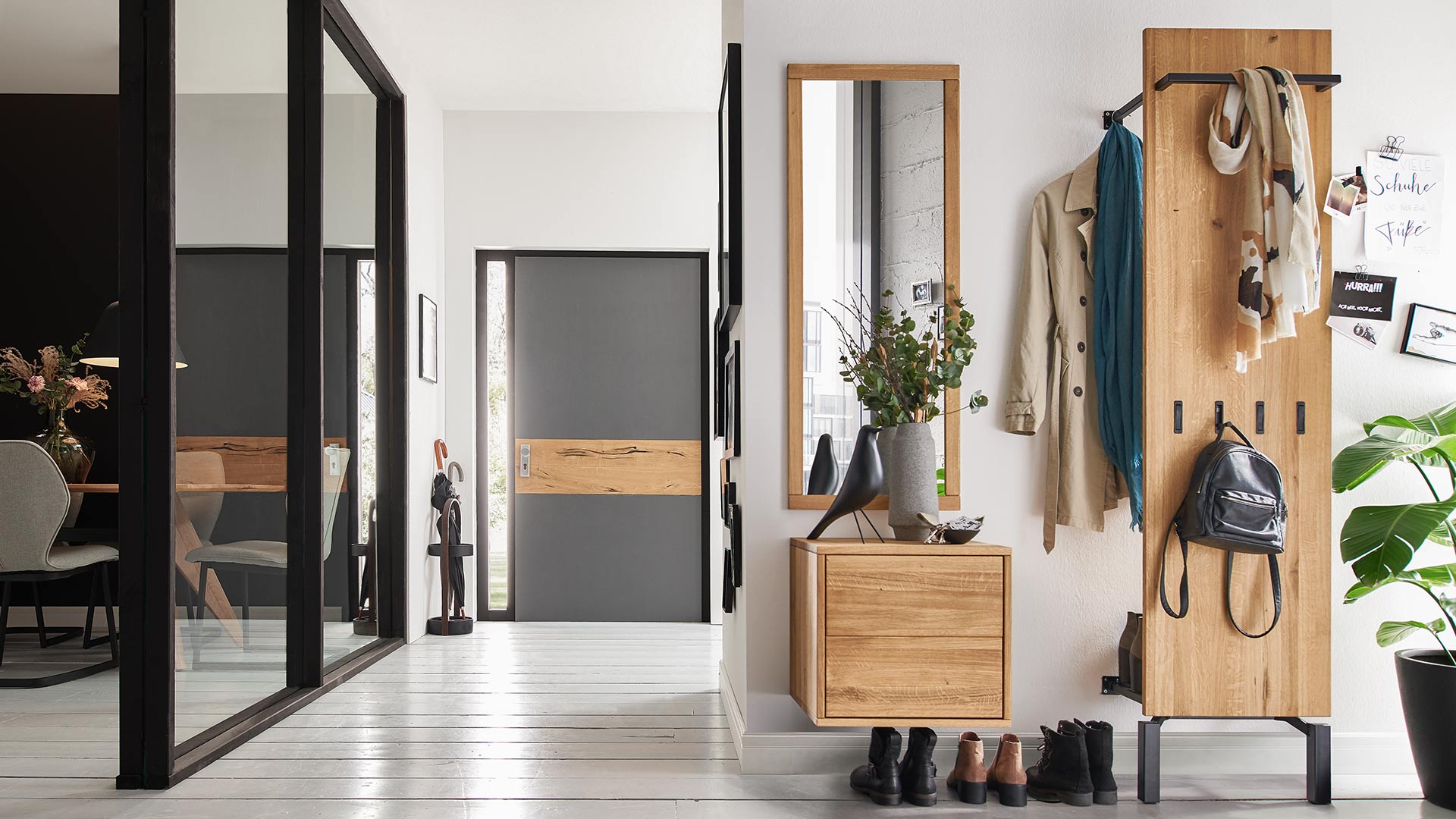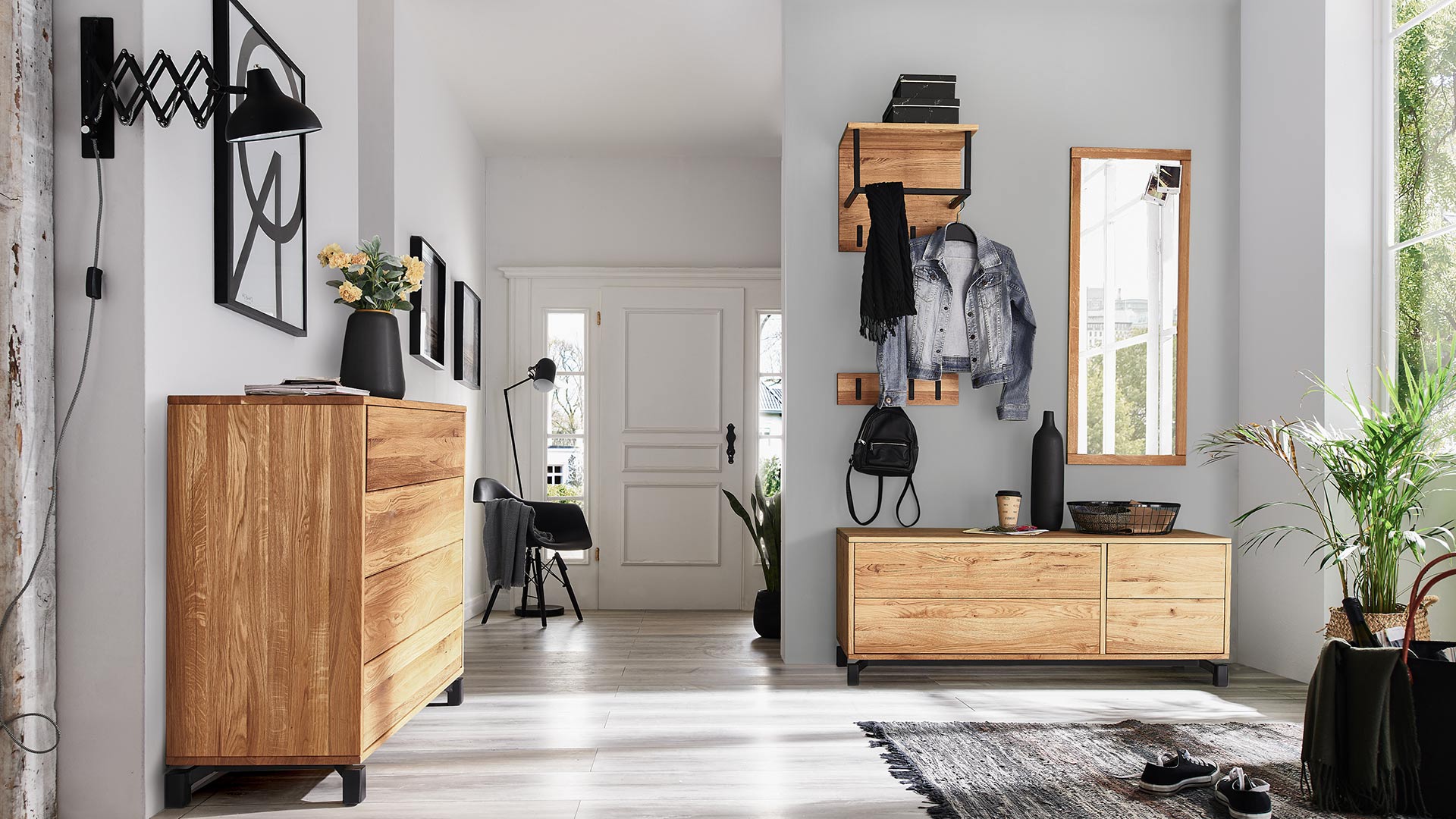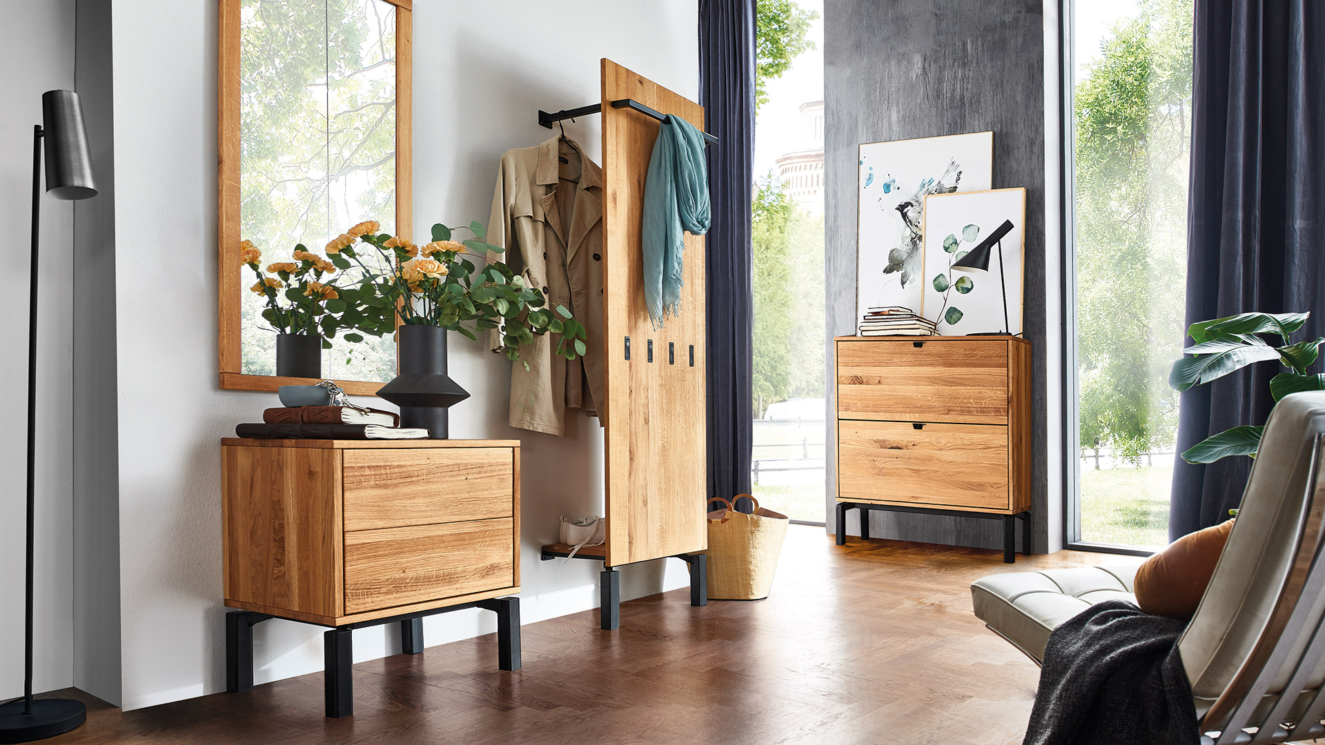 ... das am besten zu Ihnen und Ihrer Diele passt. Sparen Sie sich die Planungsarbeit und freuen Sie sich über den attraktiven Preisvorteil im Vergleich zum Kauf der Einzelmöbel. Das moderne Dielenprogramm fasziniert mit seinem gekonnten Materialmix aus massiven Hölzern und schwarzen Metall-Elementen.