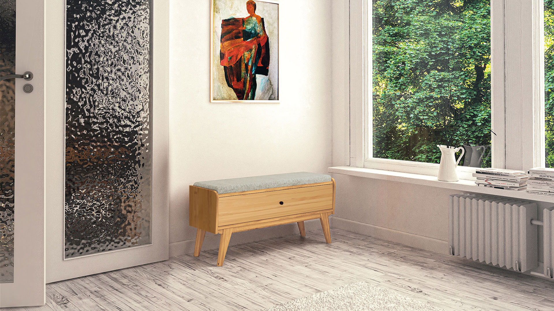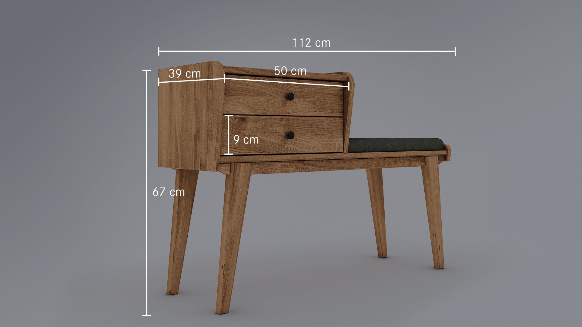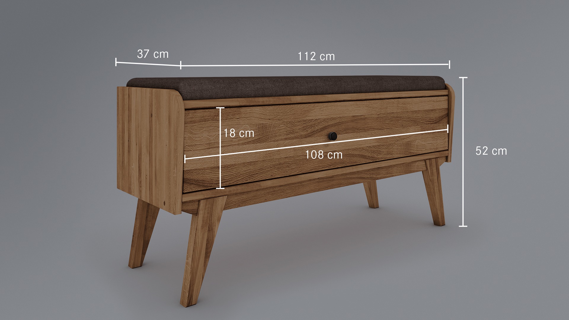 Variante 01 mit seitlich integrierter Schubladenkommode eignet sich auch als bequemes Telefon-Tischchen. Nehmen Sie beim Telefonieren gemütlich Platz. In den beiden Schubladen ist genug Platz für Ihr Adressbuch, Schreibzeug und alles, was Sie sonst noch griffbereit haben möchten. Variante 02 bietet in einer geräumigen Schublade Platz - beispielsweise für Ihre Lieblingsschuhe. Sie erhalten "Lasala" wahlweise in massiver Kernbuche oder Wildeiche. Beim eleganten Leinenbezug des Polsters haben Sie die Wahl zwischen 3 wohnlichen Farben.