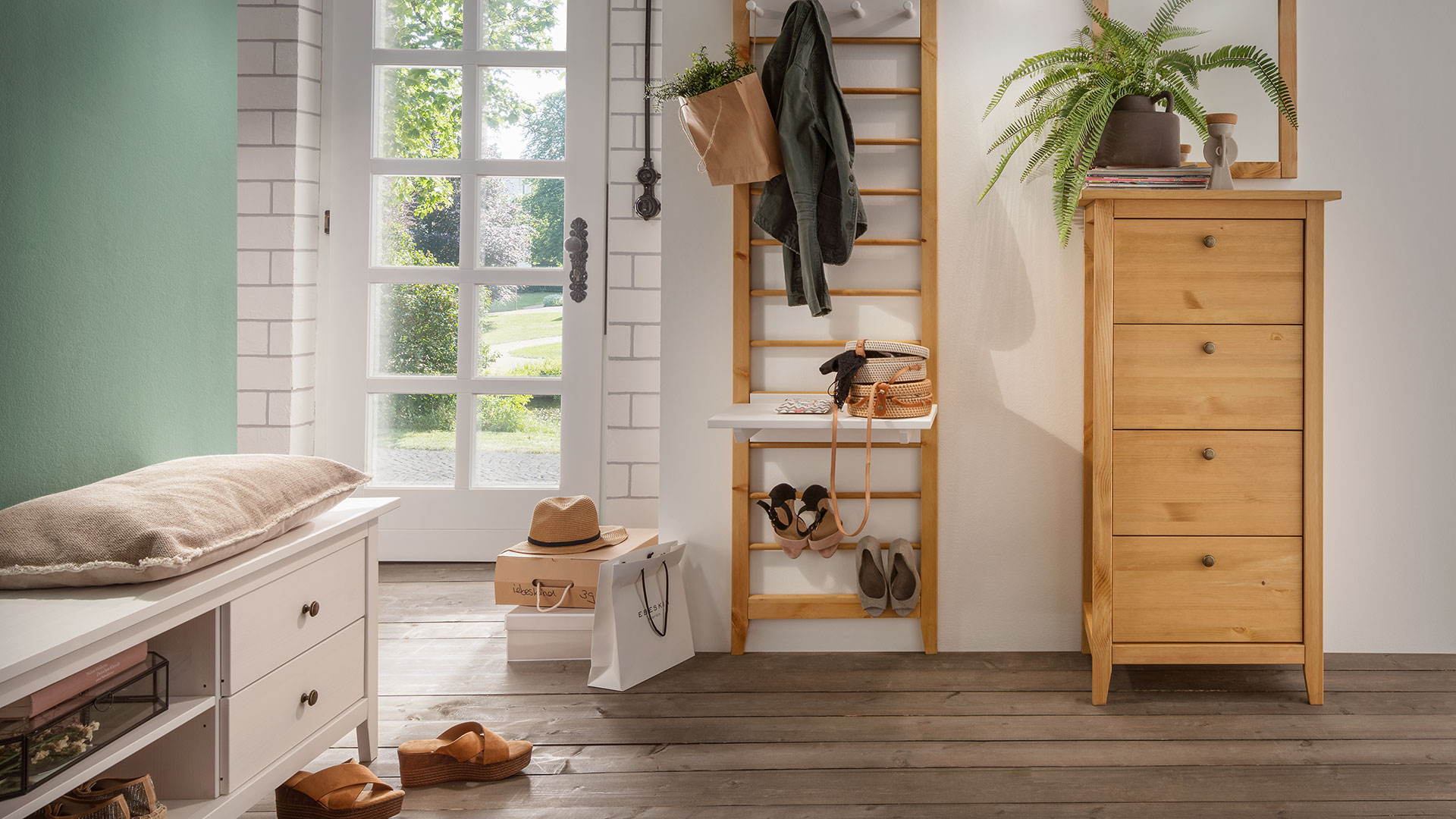 In den praktischen Ablagefächern sind nach einem langen Tag Ihre Schuhe schnell verstaut und die Zeit zum Entspannen kann beginnen. Wenn Sie es noch etwas moderner mögen, ist die Garderobenbank mit weißer Oberfläche eine gute Wahl.