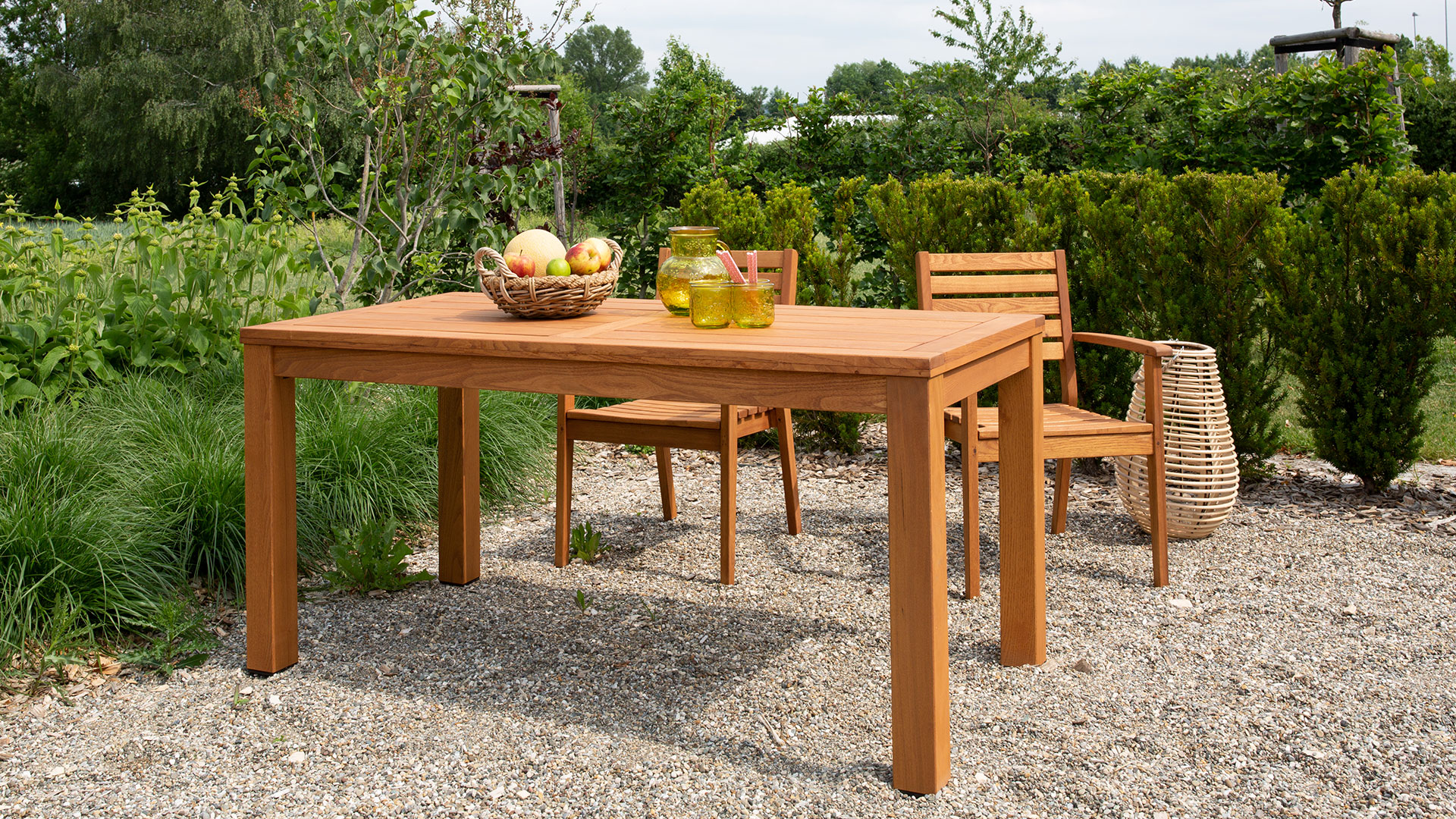 ...sorgt Gartentisch "Trevia". Wenn die ersten Sonnenstrahlen für angenehme Wärme sorgen, genießen Sie einfach Ihr Frühstück, Mittag- und Abendessen im Freien. Und schon kommt Urlaubsstimmung auf - gute Laune vorprogrammiert. Diesen markanten Gartentisch erhalten Sie in drei Größen. Mit der bei Größe 100x220 cm mitgelieferten Einlegeplatte verlängern Sie Ihren Tisch sogar auf satte drei Meter. Genug Platz für alle Ihre Lieben.