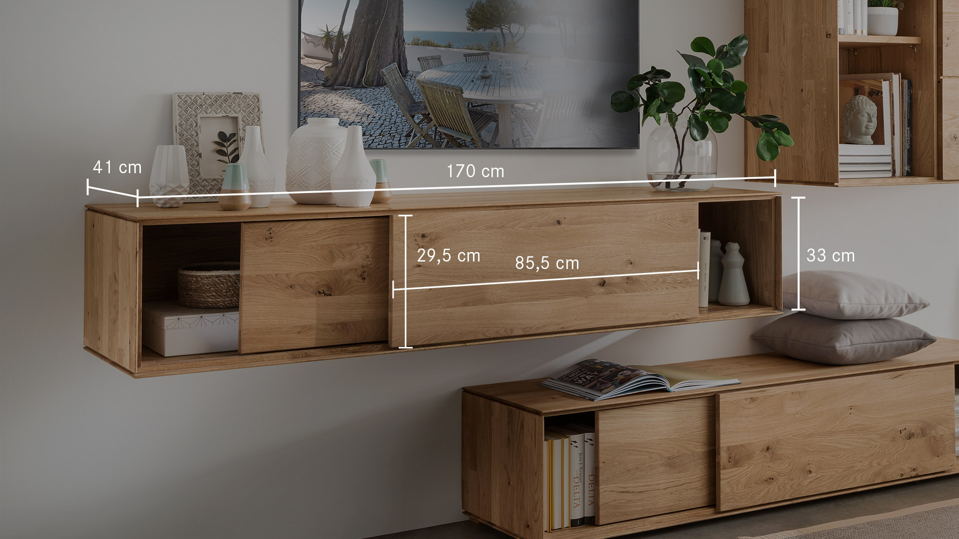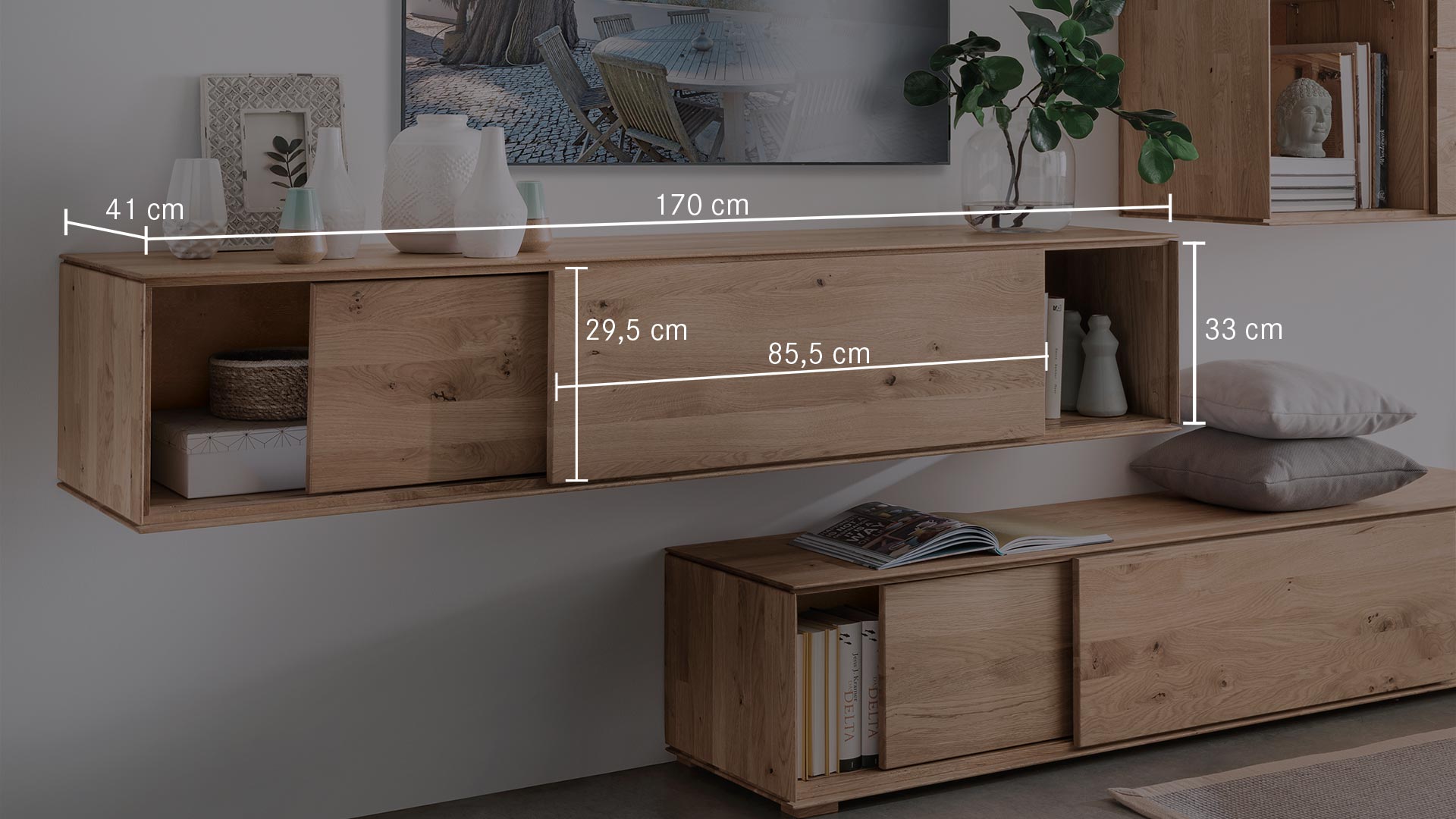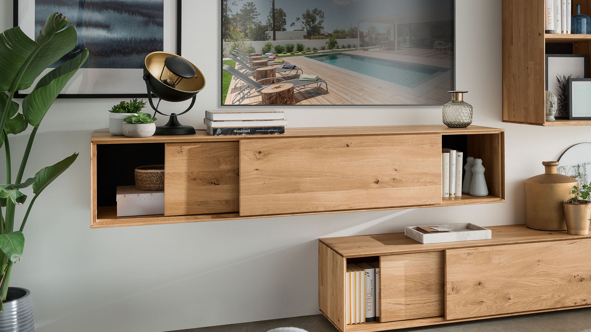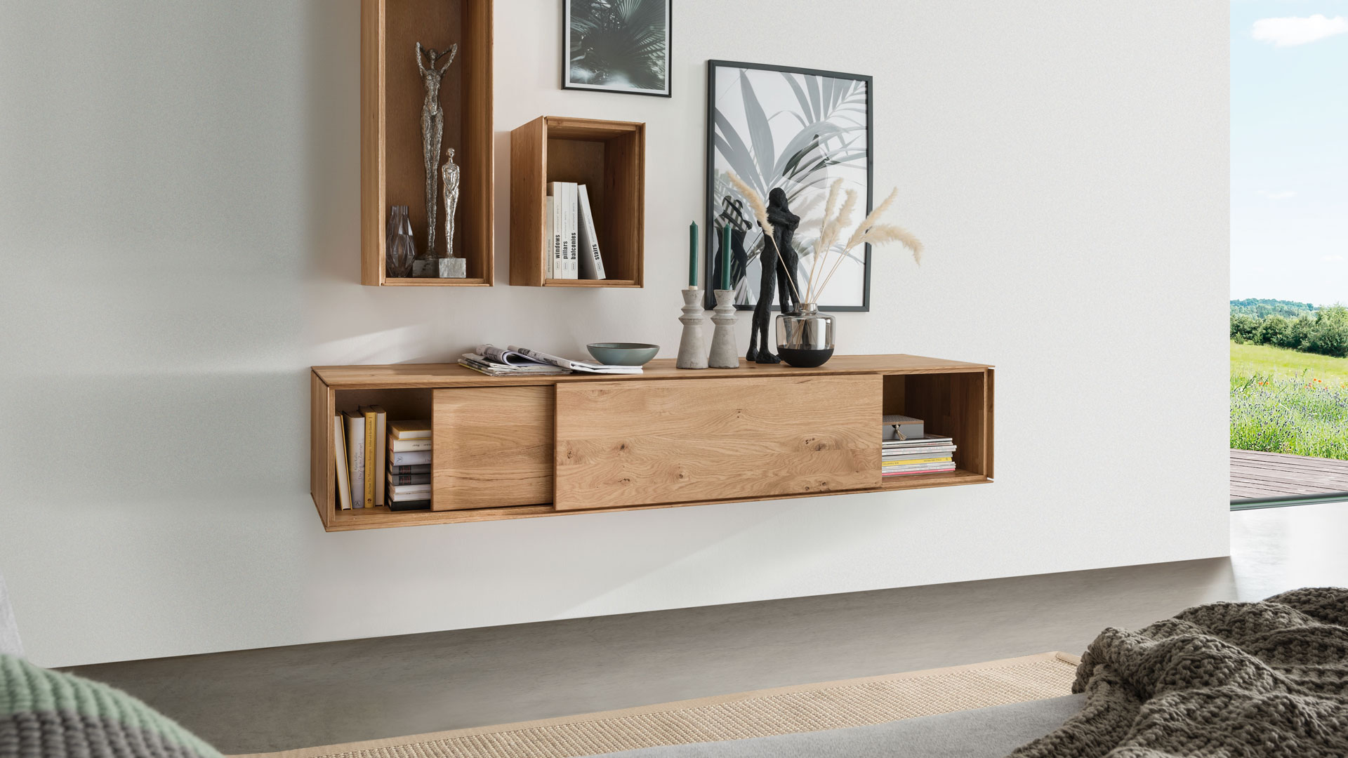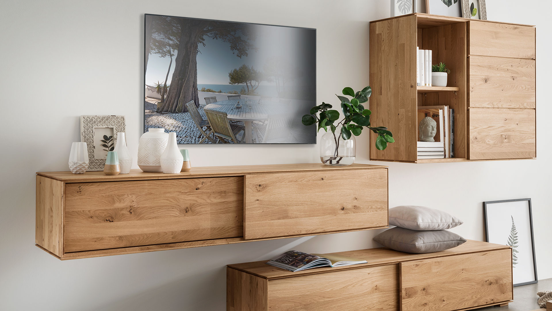 Leichtigkeit und Moderne - das ist die gestalterische Botschaft dieses Wohnmöbel-Programmes. Möchten Sie "Civenna" an die Wand hängen oder auf den Boden stellen?