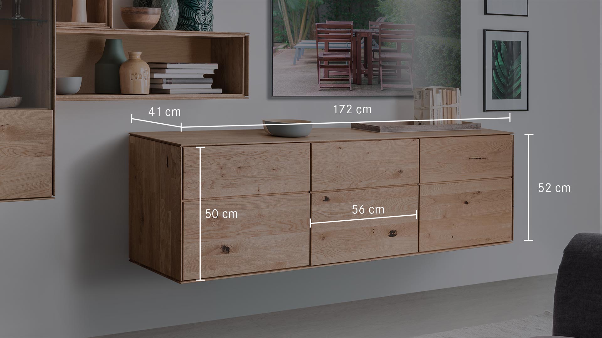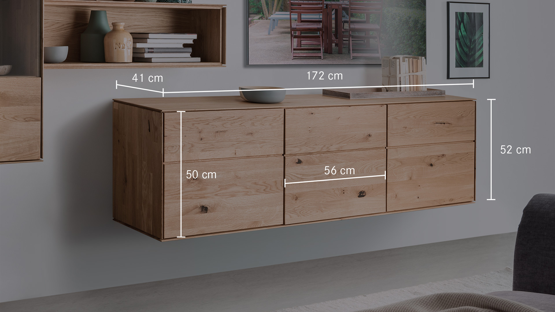 Entscheiden Sie selbst! Es werden immer sowohl Schrankfüße als auch Hängebeschläge mitgeliefert. Ein durchdachtes Baukasten-System für Ihren Wohnbereich. Klar definierte Formen betonen geschickt die erstklassige Verarbeitung und den lebhaften Holzcharakter. Der an den Vorderkanten verjüngte Korpus und die grifflose Gestaltung unterstreichen das elegante Gesamtkonzept.Hängeboard "Civenna" gibt es in 3 raffinierten Varianten. Bei der trendigen Variante 01 wird immer nur ein Fach von der Schiebetür verdeckt. Bei Variante 02 haben Sie zwei Schiebetüren und alles ist blickdicht verstaut. Darf es etwas mehr Platz sein? Dann bietet Variante 03 hinter 3 Holztüren viel Stauraum für Bücher, CDs und DVDs.
