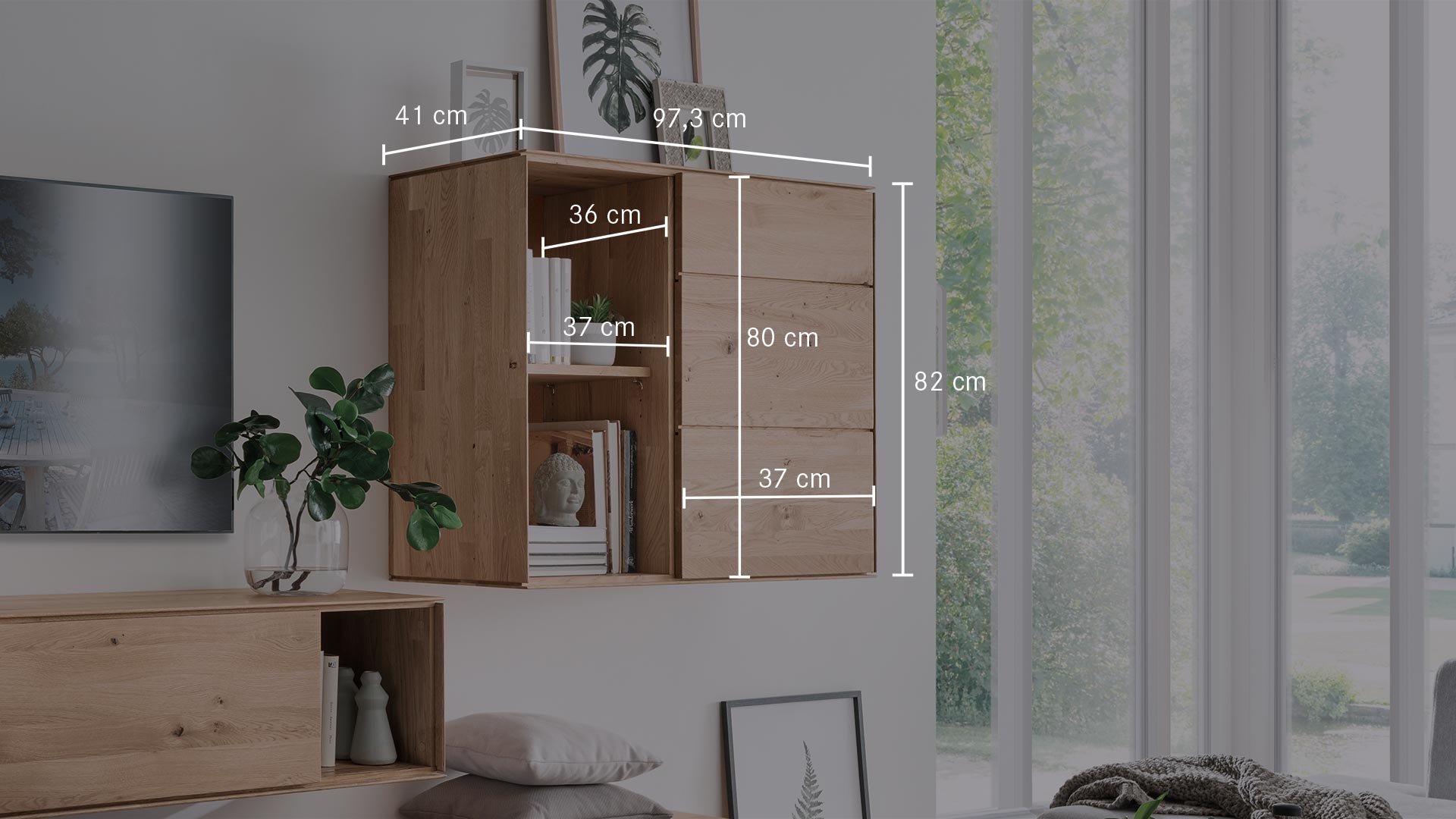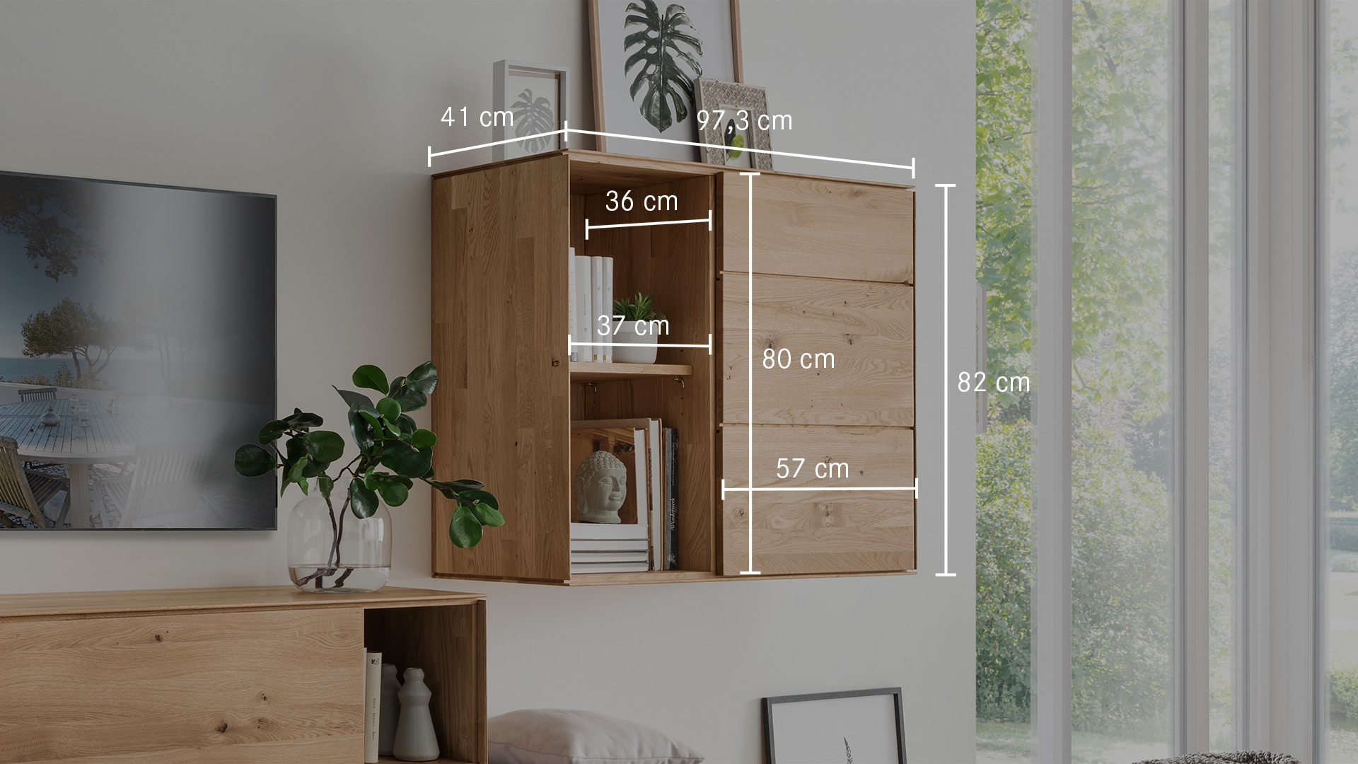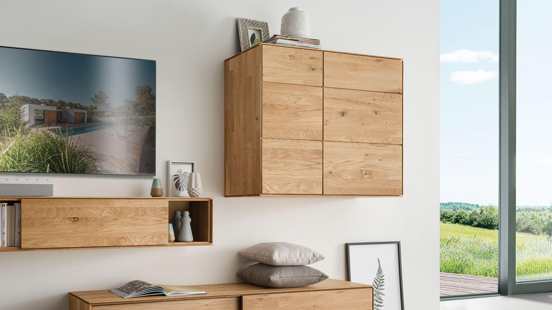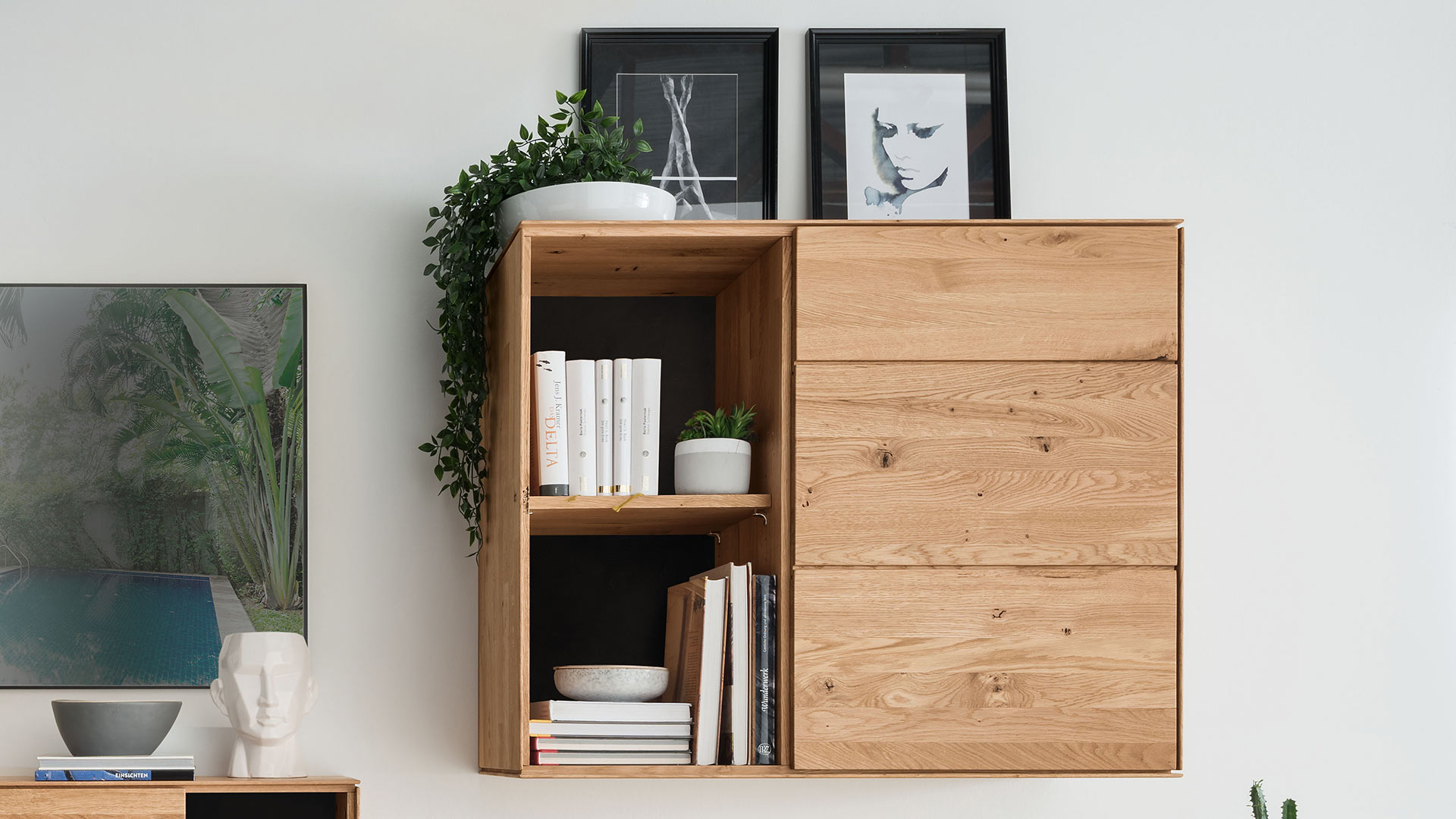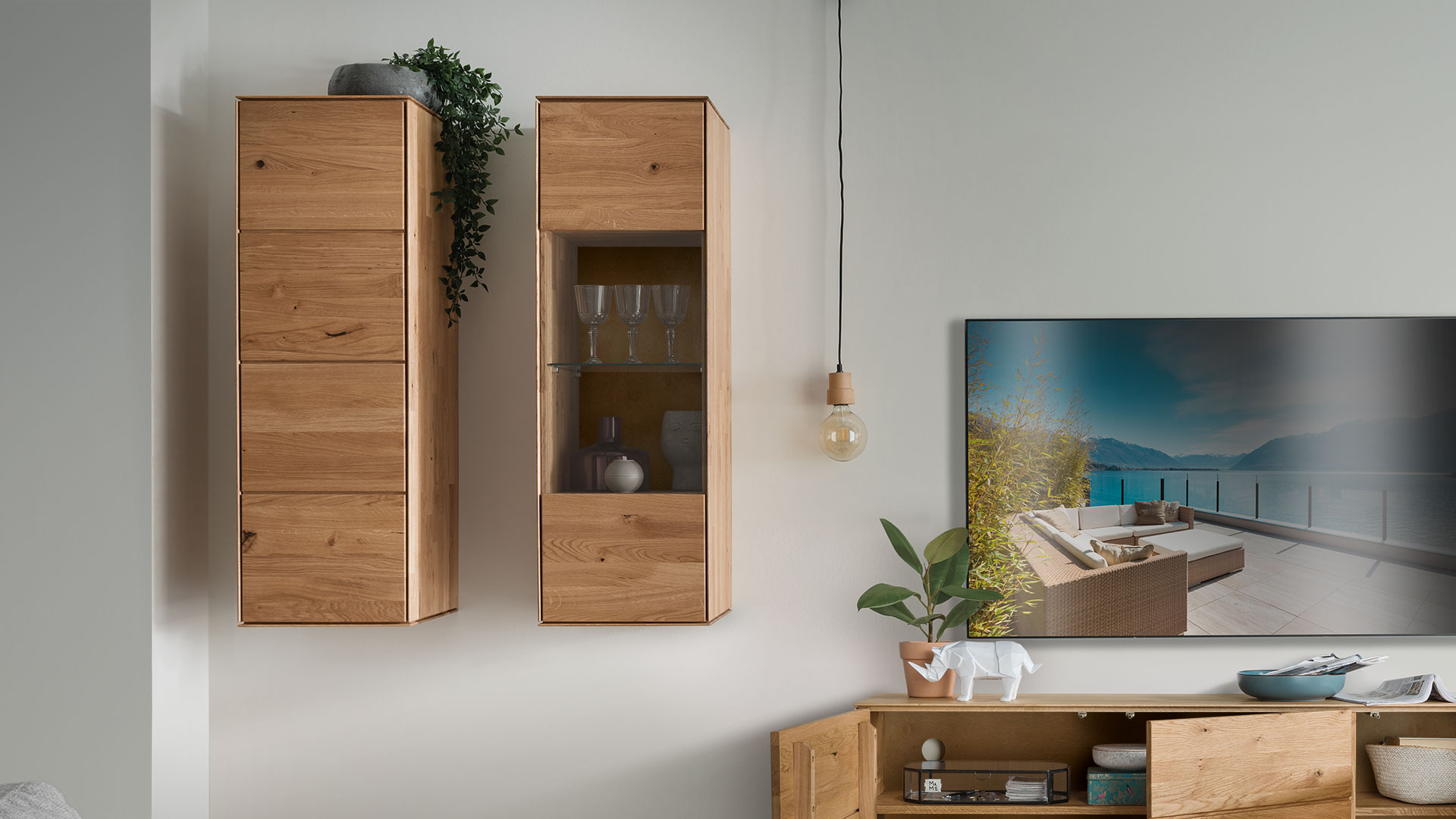 Leichtigkeit und Moderne - das ist die gestalterische Botschaft dieses Wohnmöbel-Programmes. Sie benötigen einen länglich-schlanken oder etwas breiteren Hängeschrank?