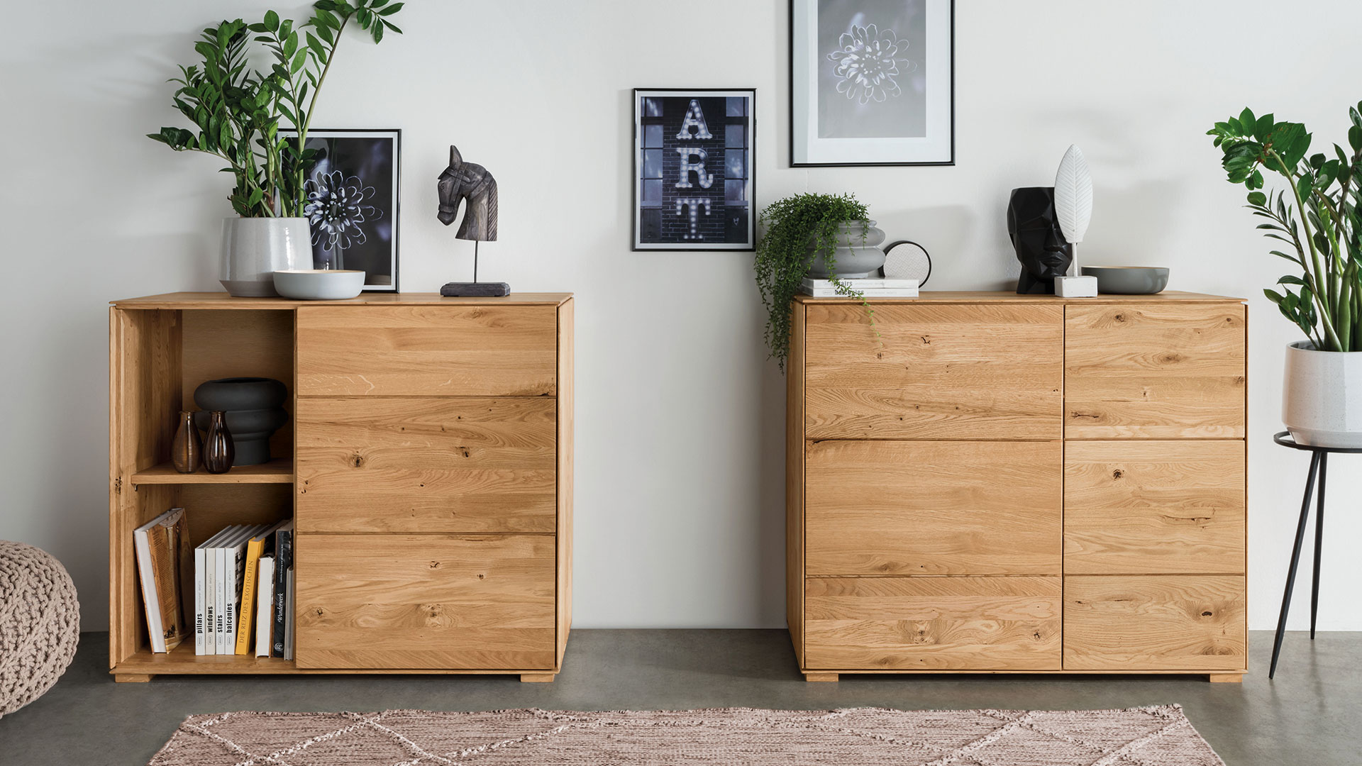 Die klare Formensprache stellt die erstklassige Verarbeitung und den lebhaften Holzcharakter in den Vordergrund. Der an den Vorderkanten elegant ausgefräste Korpus und die grifflose Gestaltung unterstreichen das elegante Gesamtkonzept.