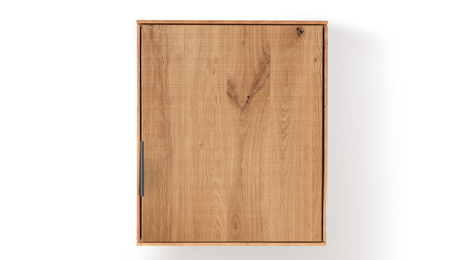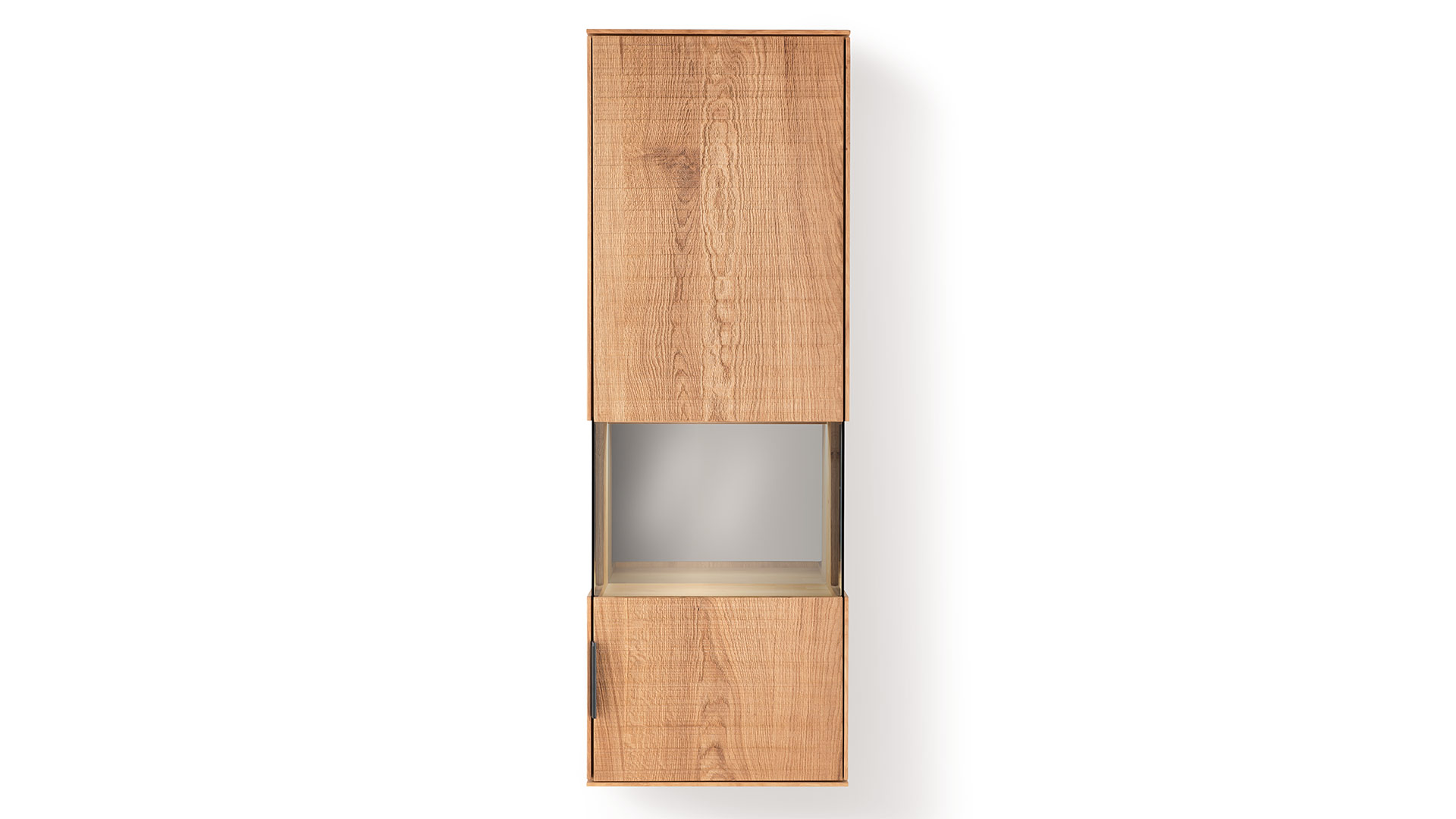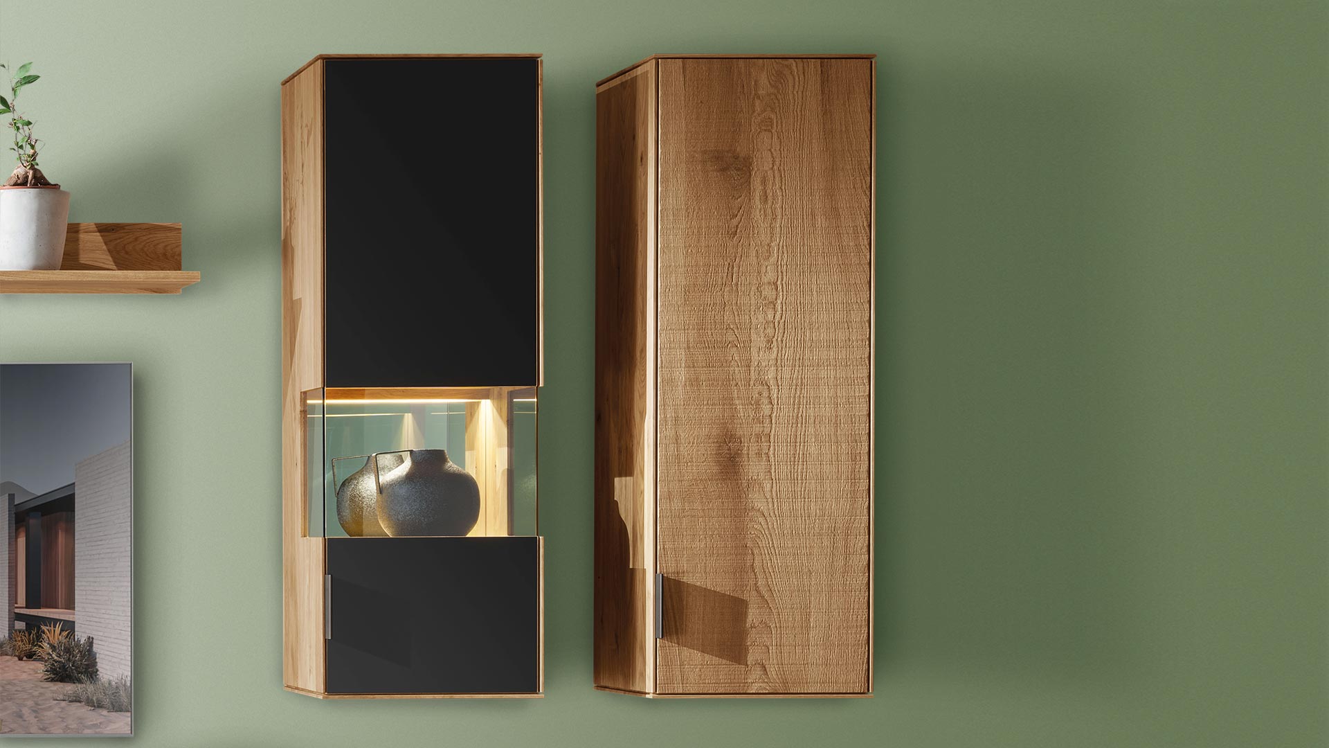 Der Hängeschrank "Eterna" vereint rustikale Eleganz der charaktervollen Wildeiche mit funktionalem Design. Bei den Türfronten haben Sie die Wahl zwischen einer klassischen Holzfront mit Hobelschlag-Struktur oder modernen Varianten mit Anthrazit- oder Weißglas, sodass Sie den Schrank ganz nach dem Stil Ihres Wohnzimmers anpassen können.