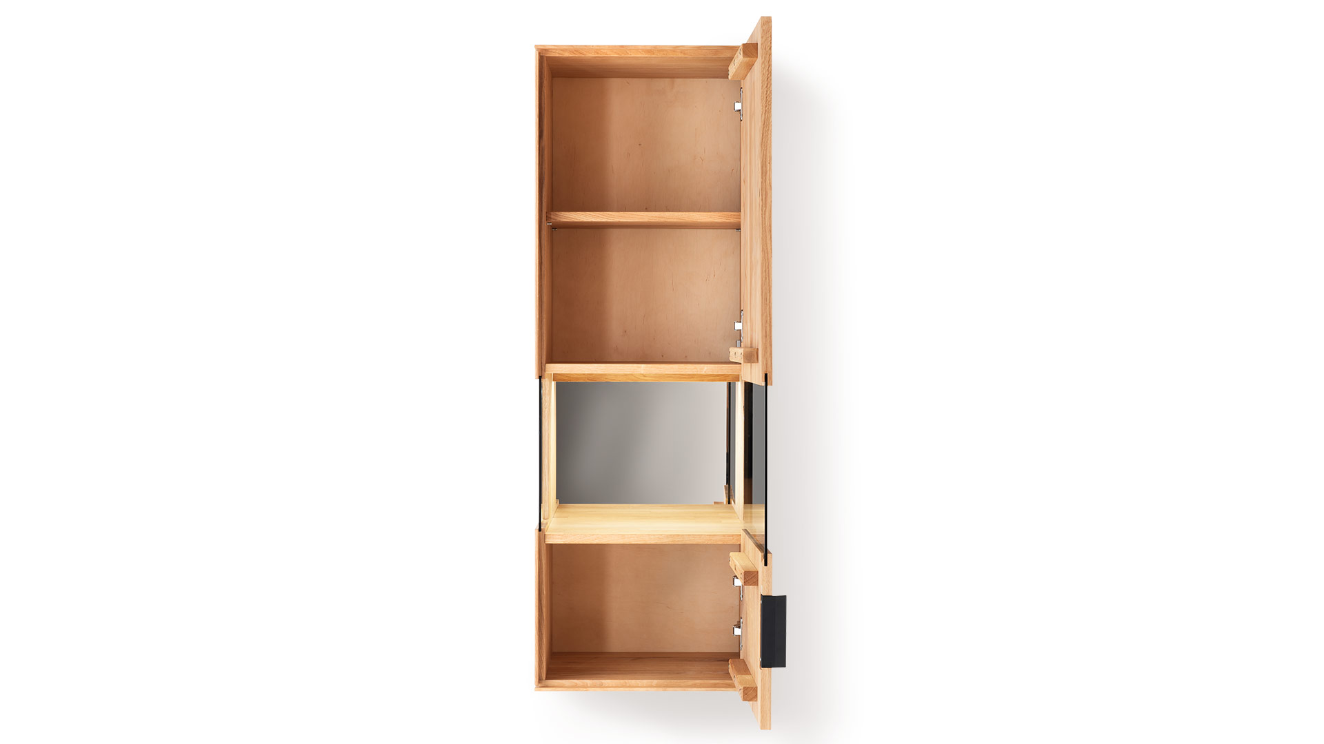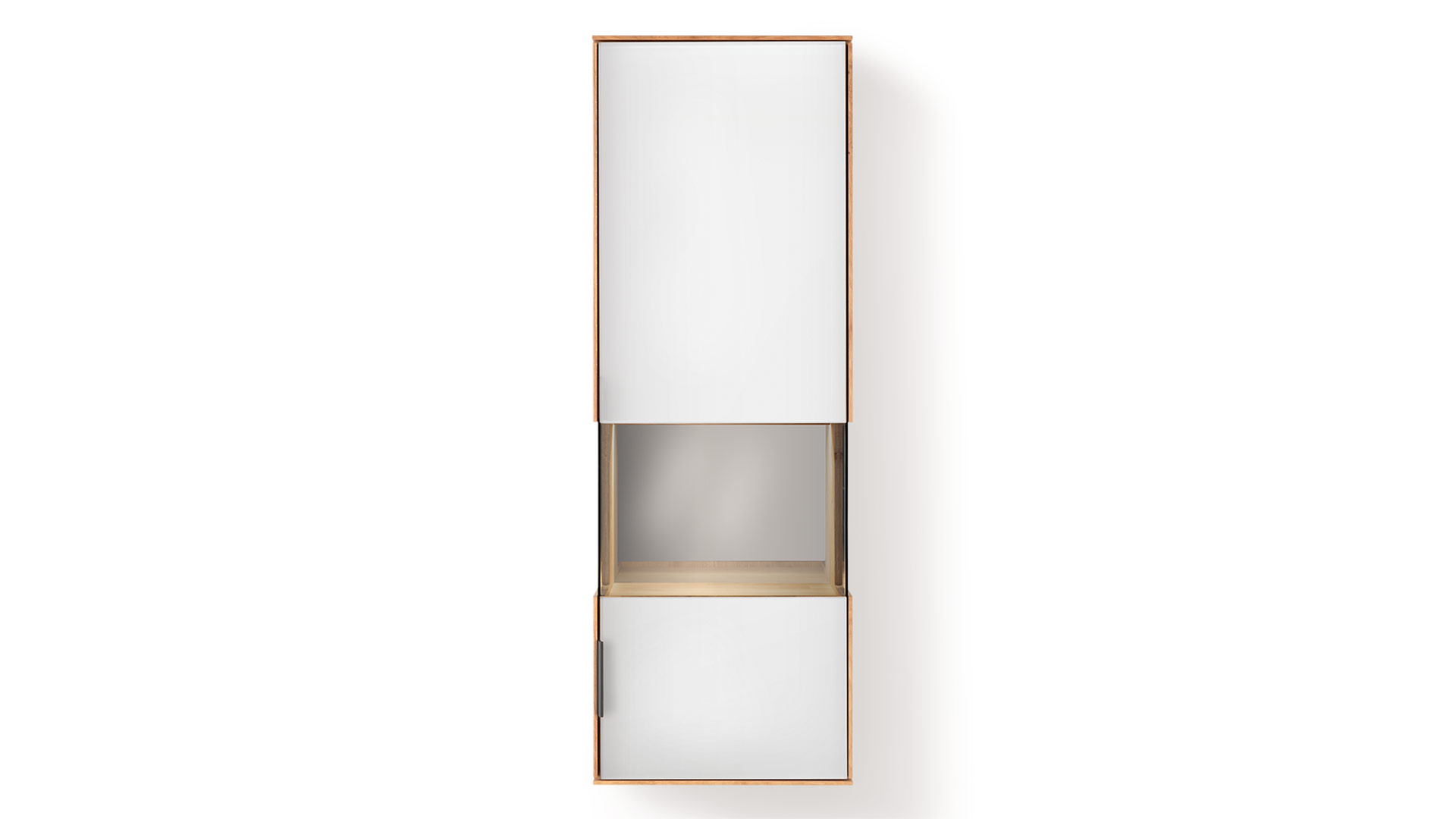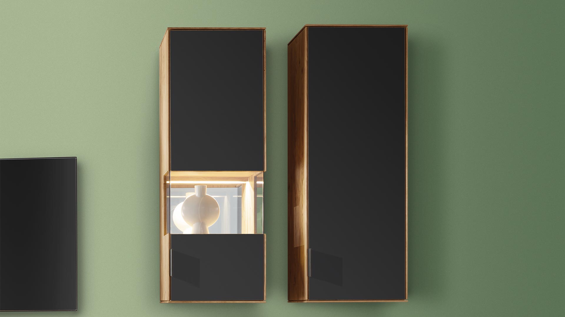 Ein besonderes Highlight ist die hohe Variante mit Glaselement. Hier können Sie Ihre Dekorationen, wie Vasen, Skulpturen oder Erinnerungsstücke, perfekt zur Geltung bringen. Die in der Rückwand verbaute Spiegeloberfläche in Kombination mit der integrierten LED-Beleuchtung sorgt für beeindruckende Lichtspiele und setzt Ihre Lieblingsstücke stilvoll in Szene. Setzen Sie auf die zeitlose Schönheit des Hängeschranks "Eterna" und verleihen Sie Ihrem Wohnzimmer eine edle Note.